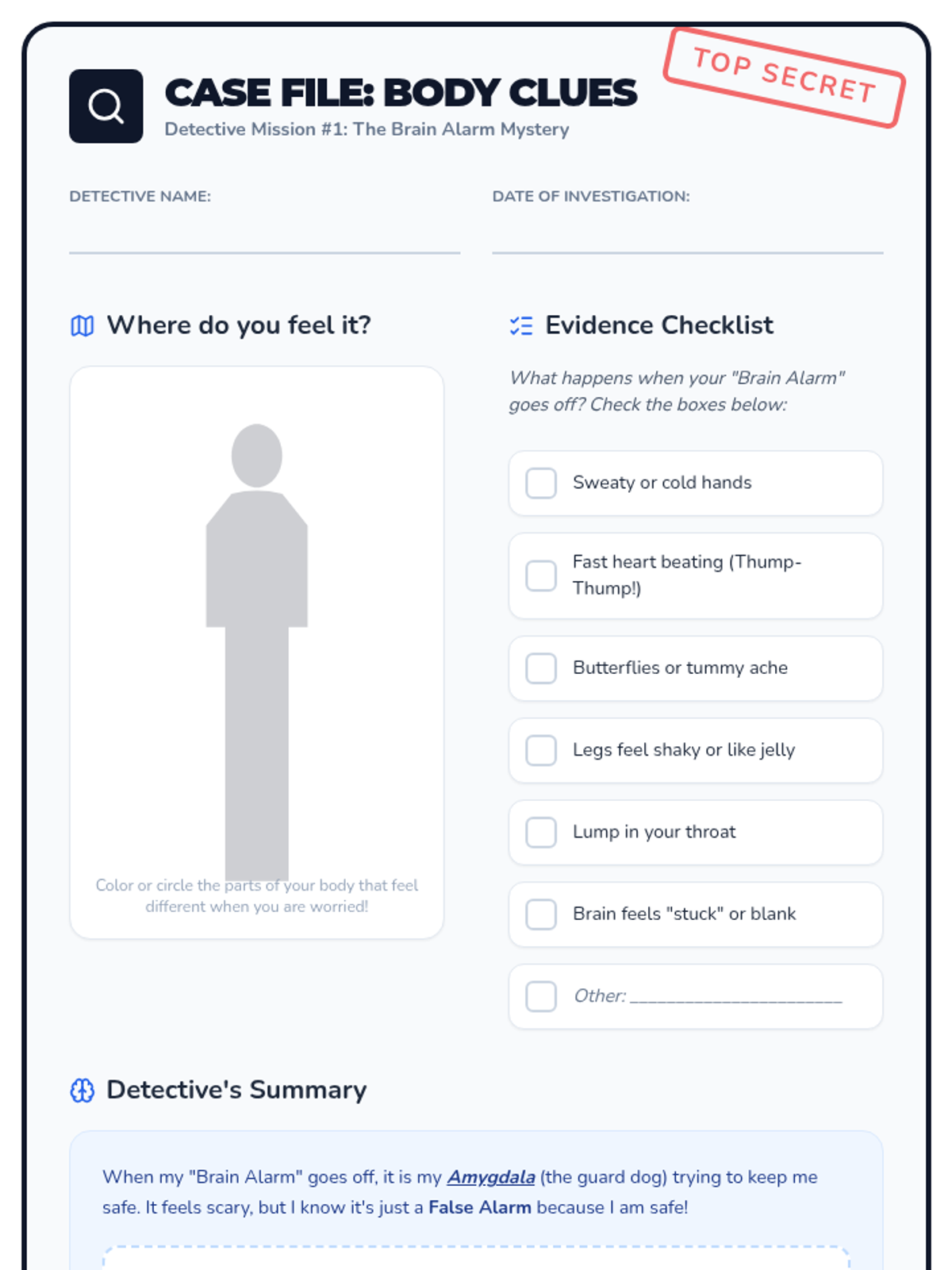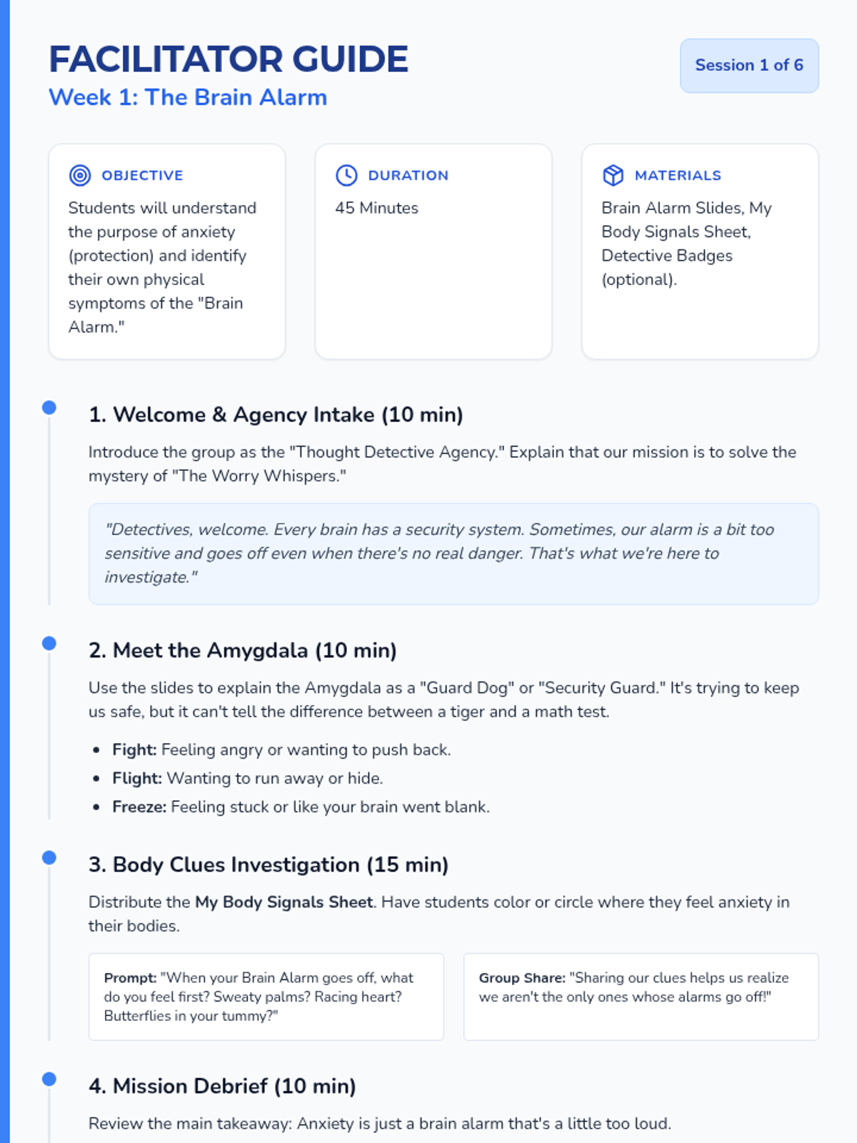 An introductory session where students learn how the brain's 'alarm system' (the amygdala) works and identify their own physical 'clues' that they are feeling anxious.