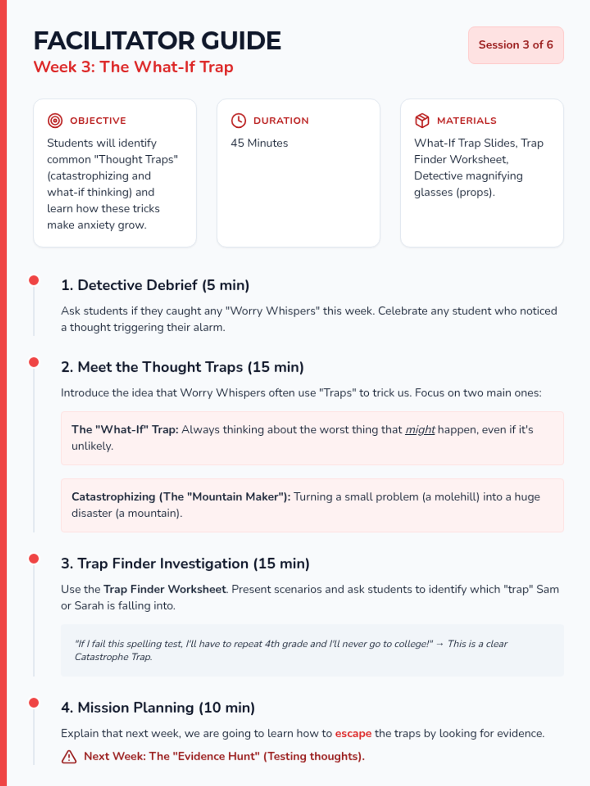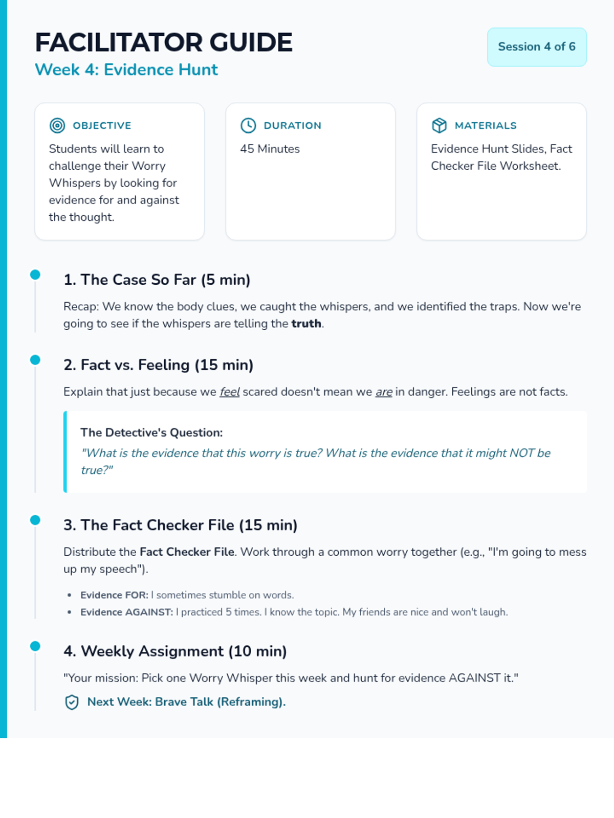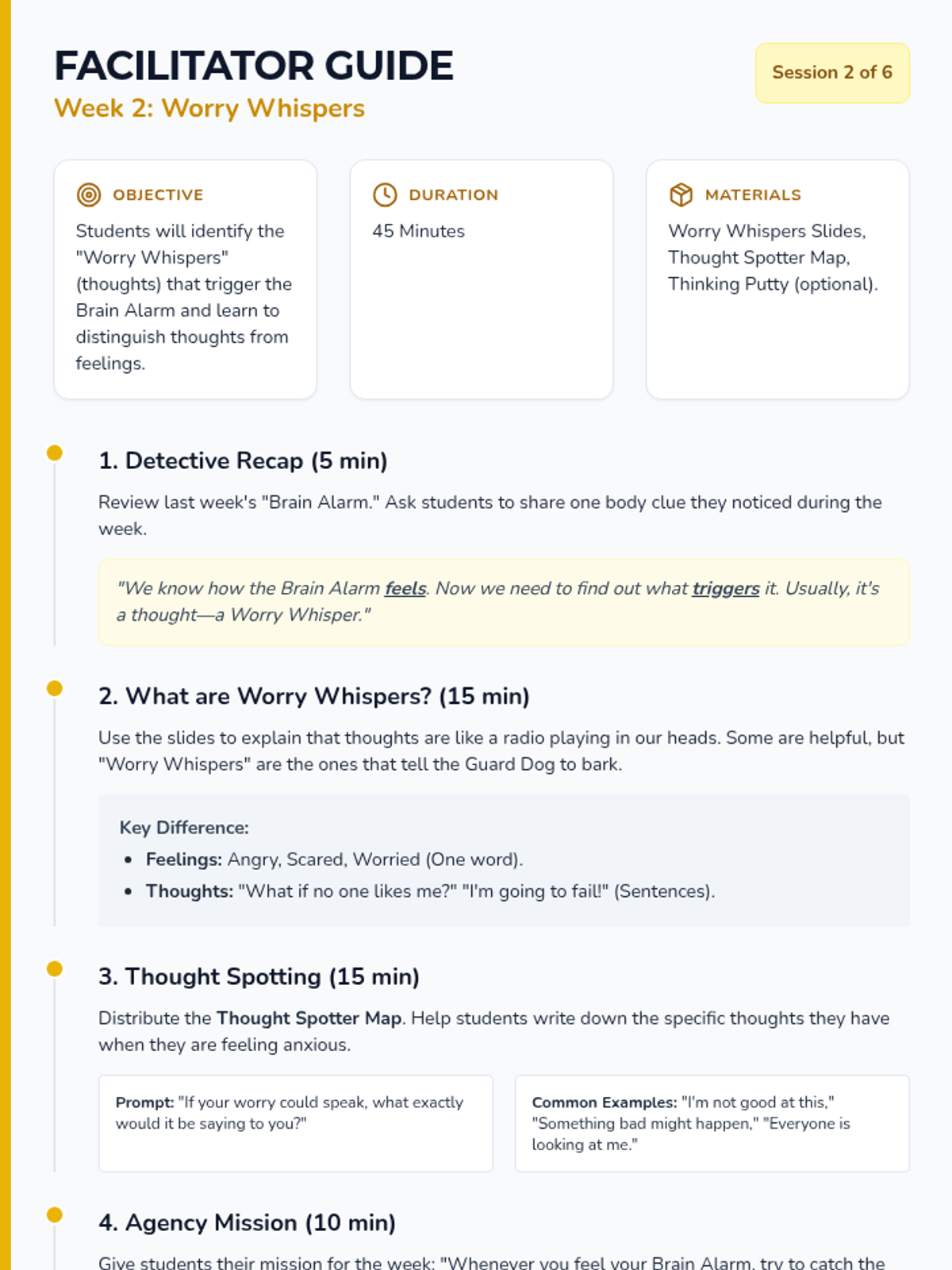 In this session, students learn to distinguish between facts and 'Worry Whispers' (automatic anxious thoughts) and practice catching them as they appear.