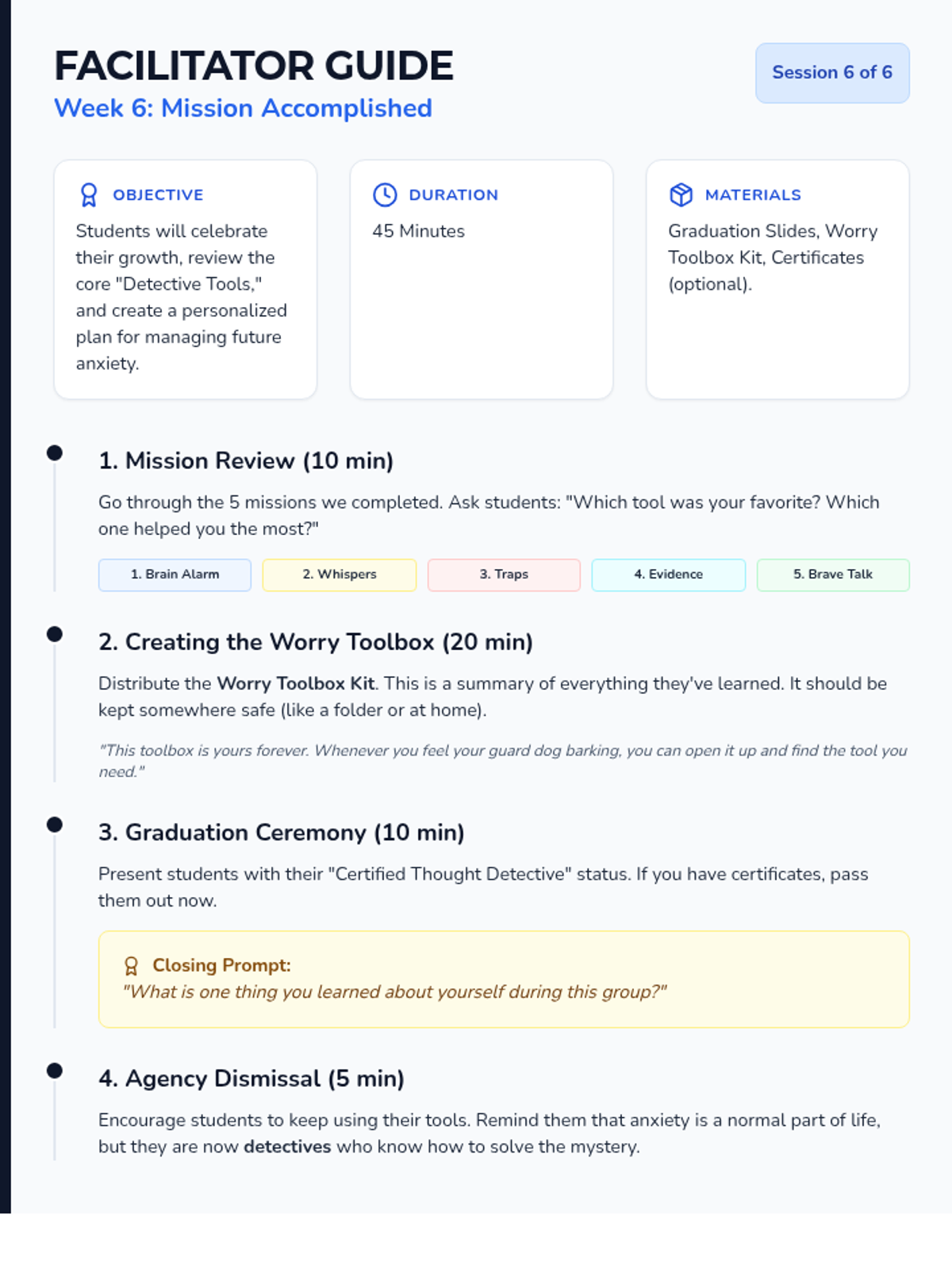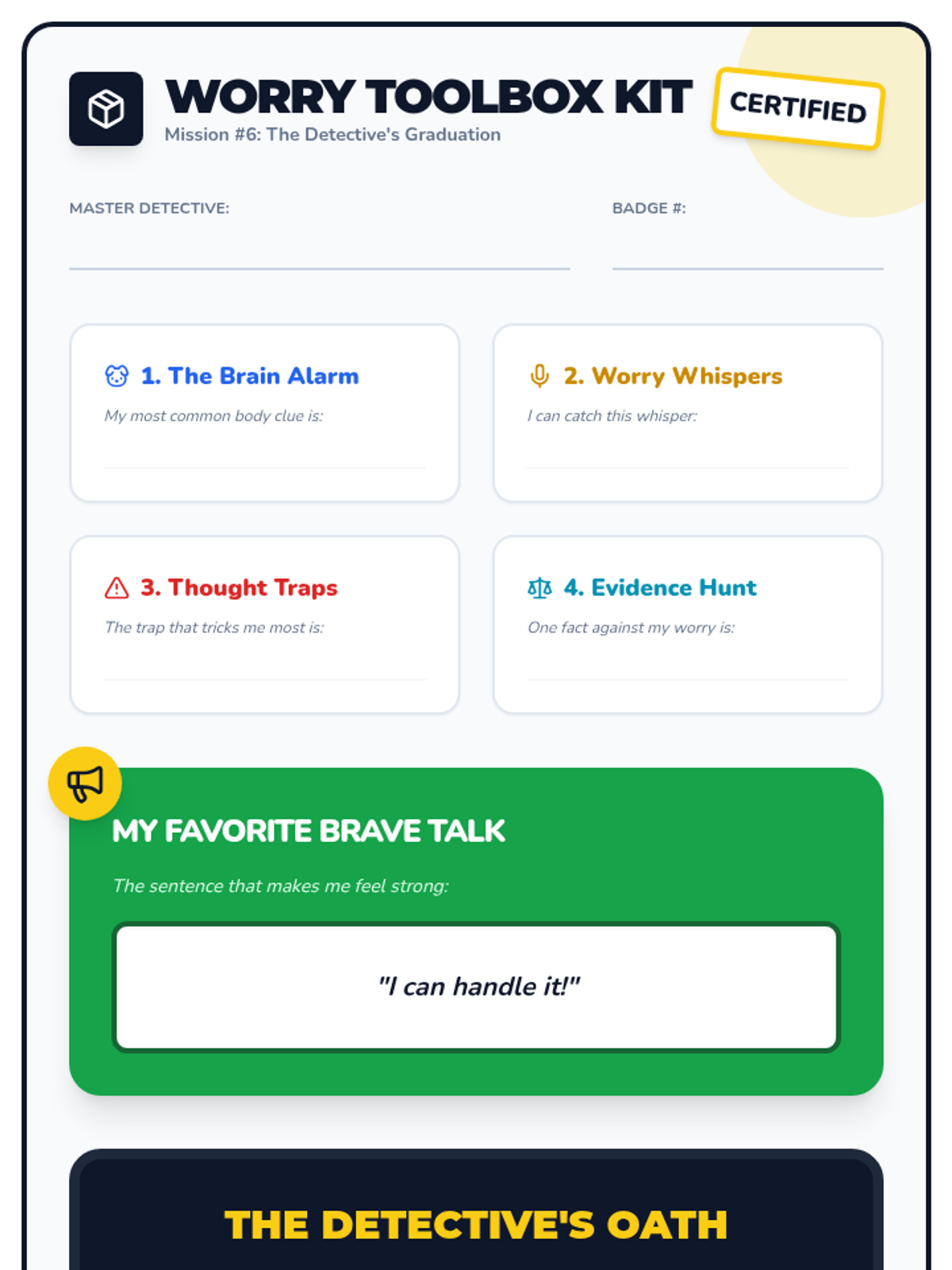 A celebration of the skills learned, where students create a personalized 'Worry Toolbox' and review their progress as certified Thought Detectives.