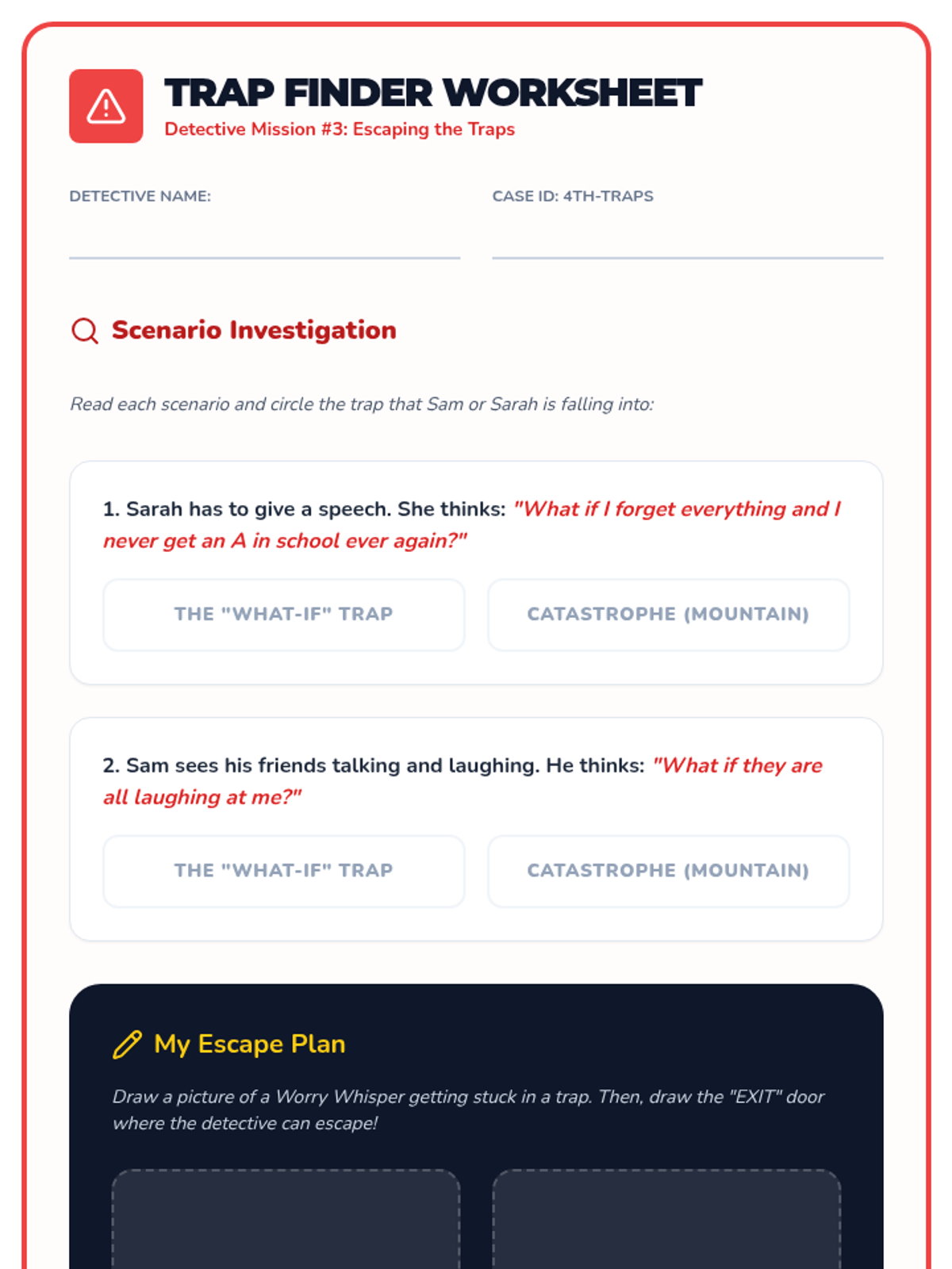 Students identify common 'Thought Traps' like catastrophizing and 'What-If' thinking, learning how these traps trick the brain into feeling more anxious.