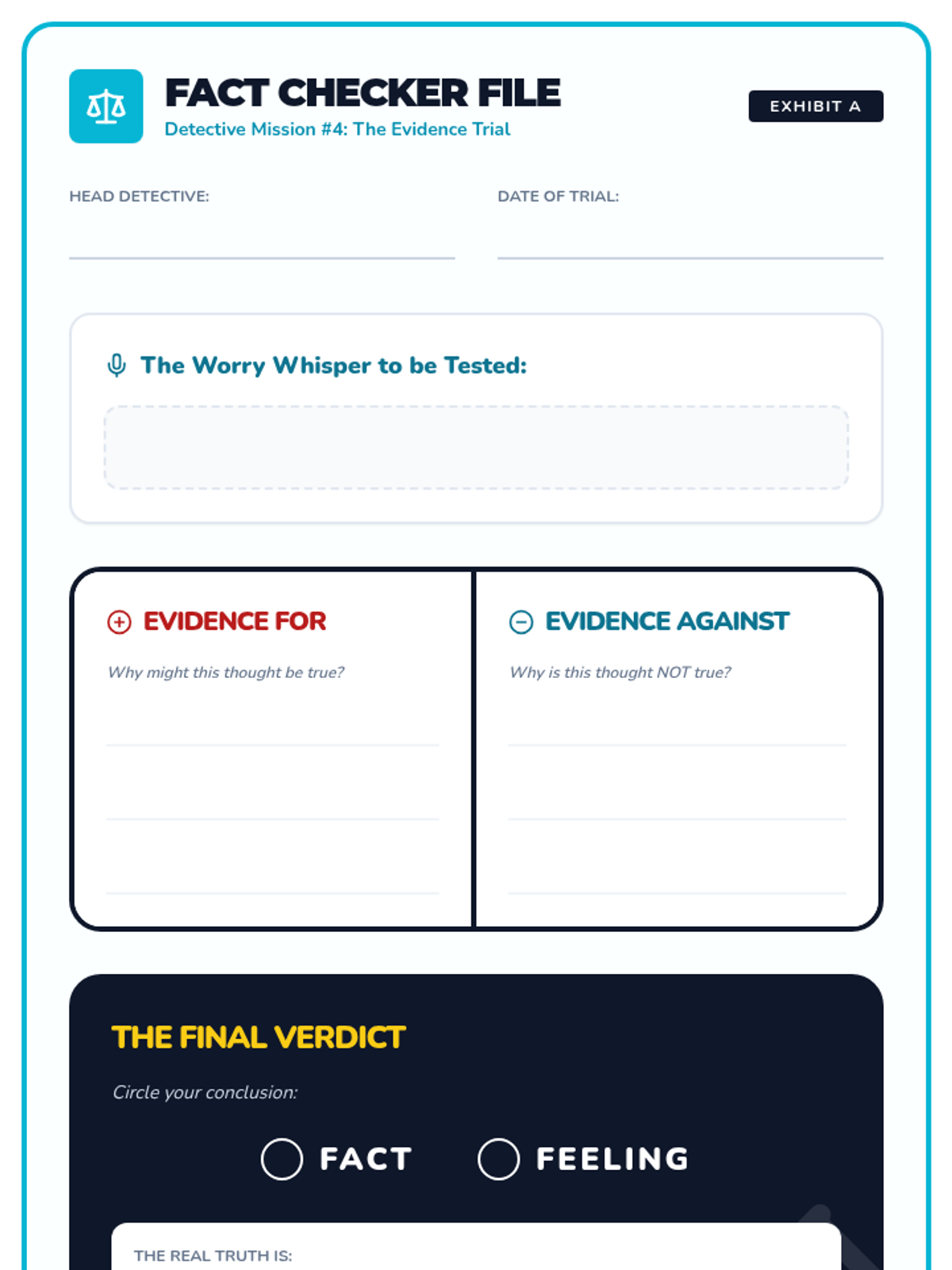 A hands-on session where students play 'Fact Checker' to look for evidence for and against their anxious thoughts to see if they are actually true.