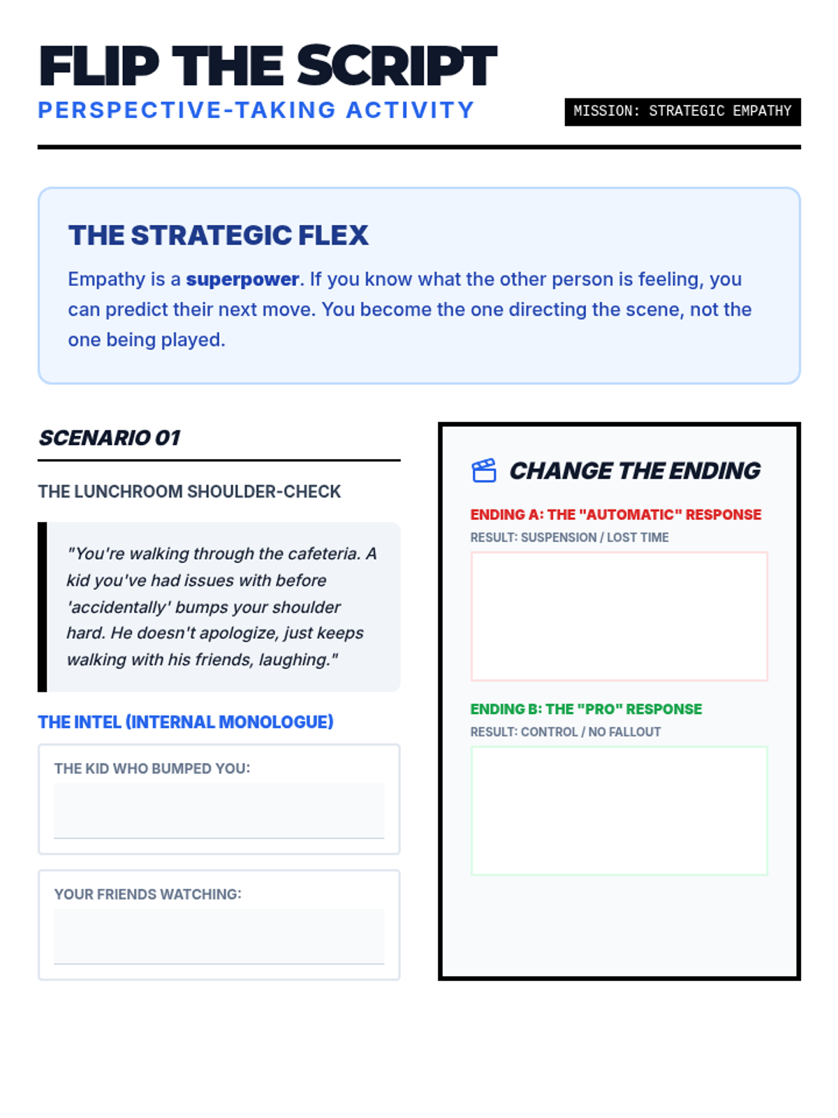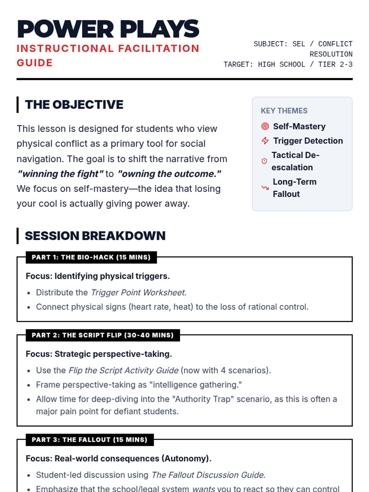 A high-impact social-emotional learning unit designed for older students who struggle with physical aggression and defiance. The lesson focuses on self-mastery, identifying physiological triggers, and understanding the social and personal costs of conflict.