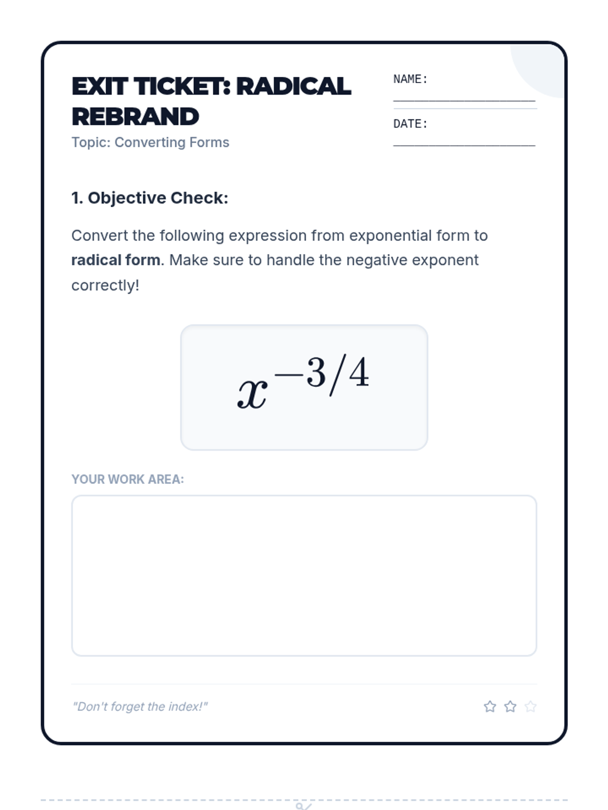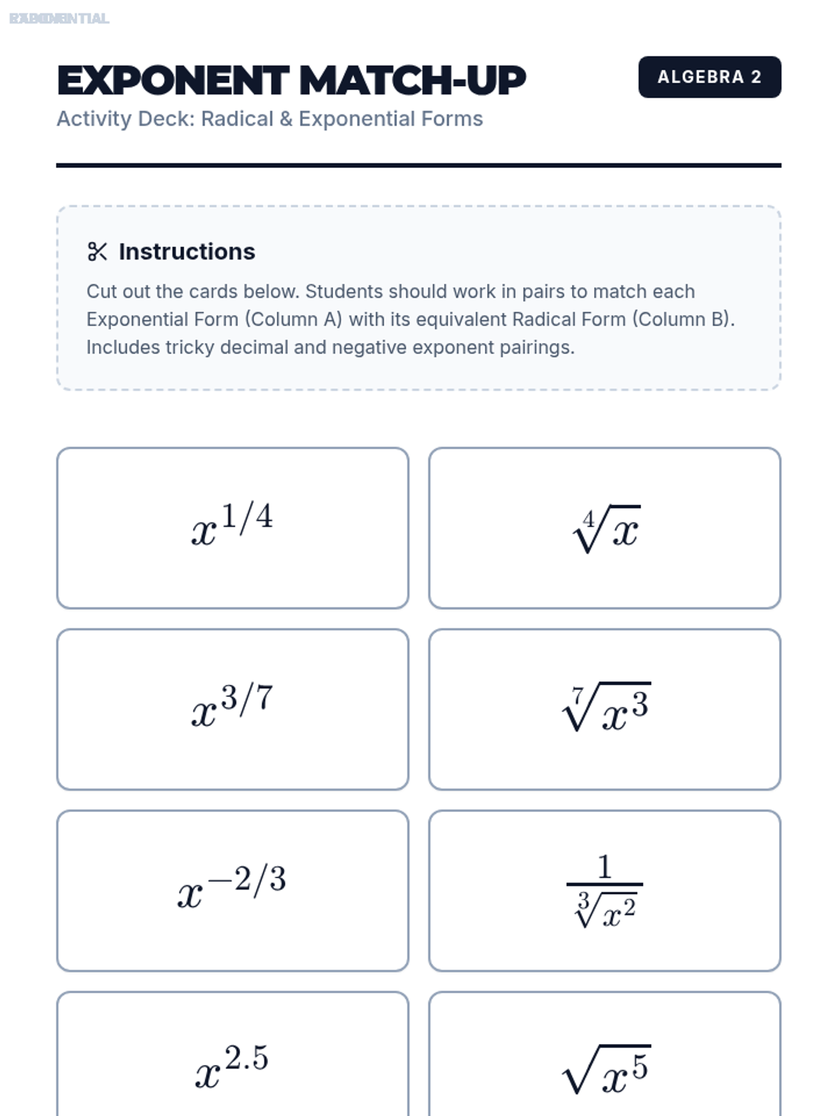 A comprehensive lesson for Algebra 2 students on converting between radical and exponential forms, featuring decimal and negative exponents. Includes a video-guided lecture, a hands-on card sort activity, and a targeted exit ticket.