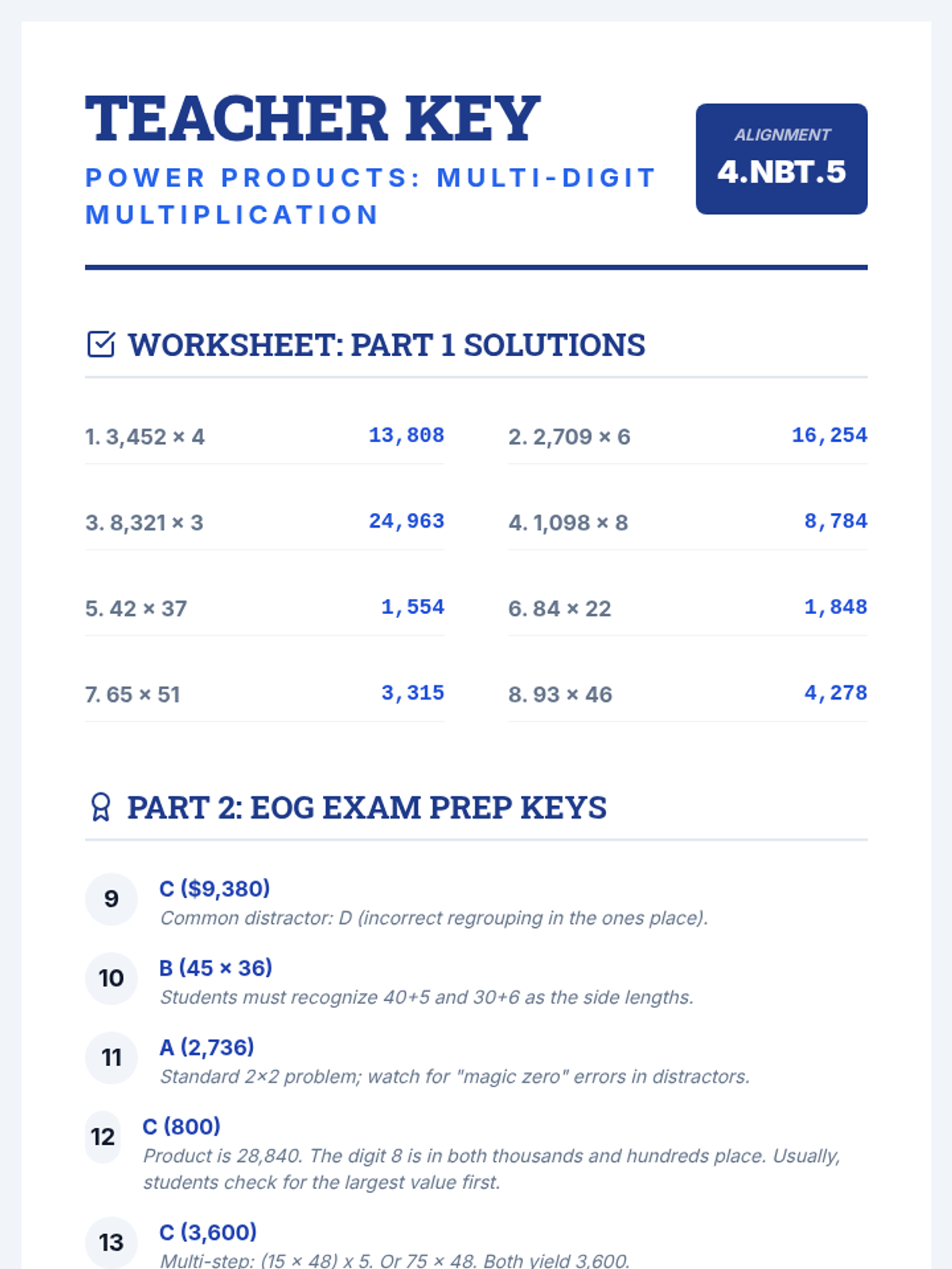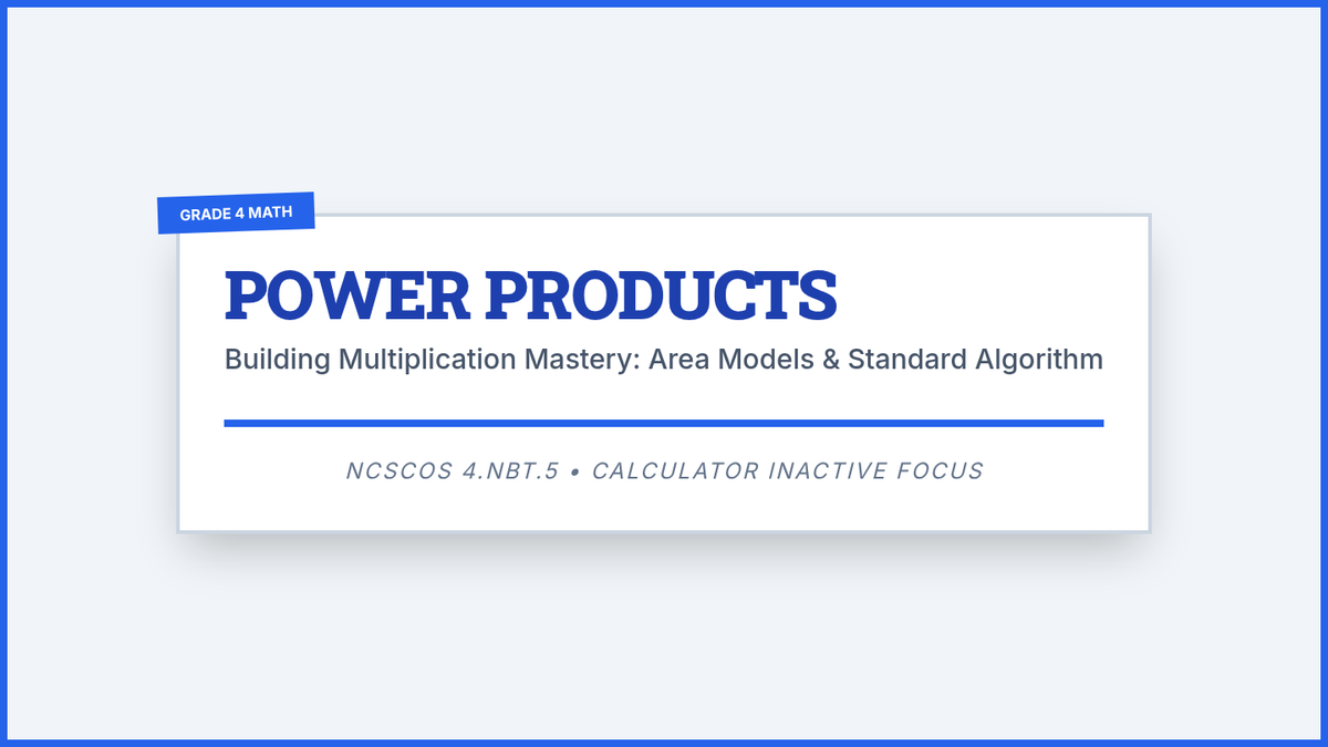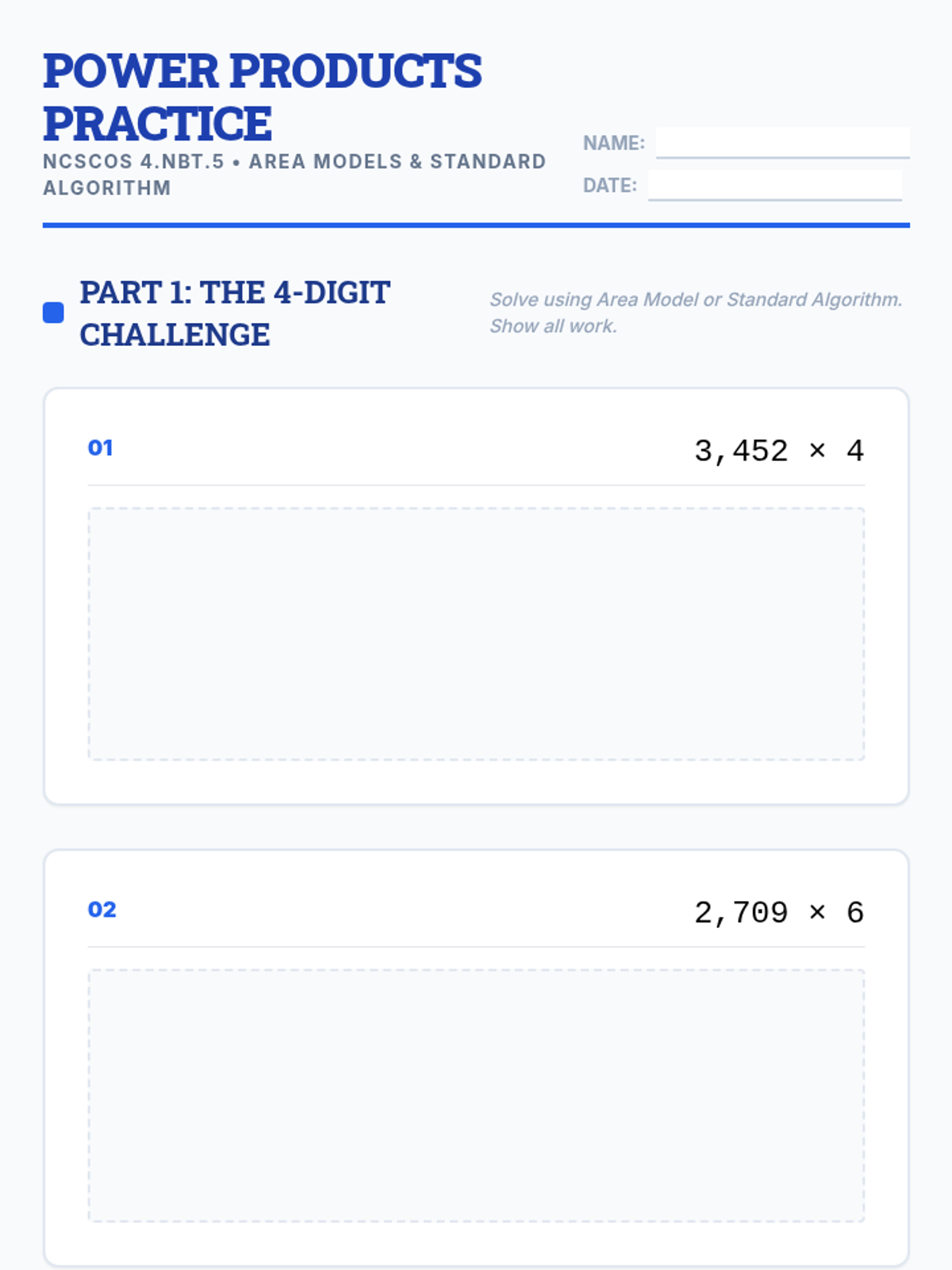 A comprehensive Grade 4 math lesson on multi-digit multiplication using area models and the standard algorithm, aligned to NCSCOS 4.NBT.5. Includes 4x1 and 2x2 multiplication with EOG-style practice and error analysis.