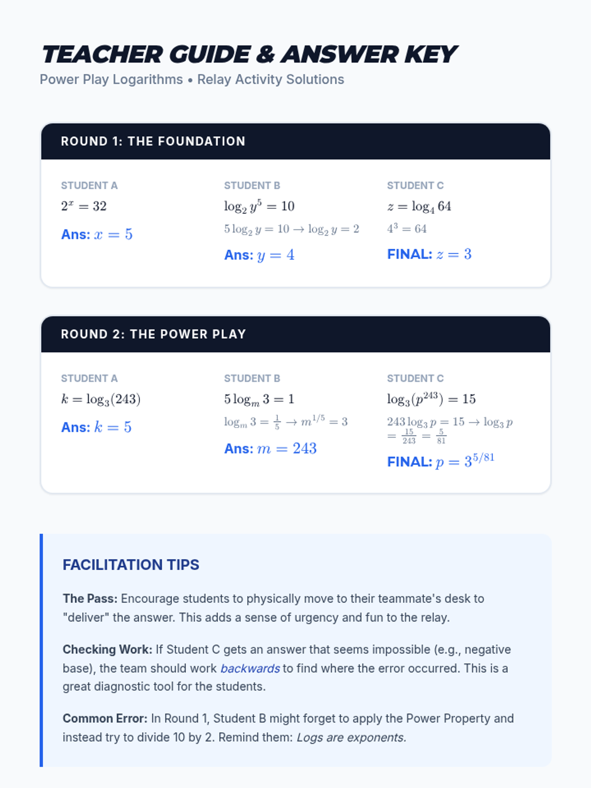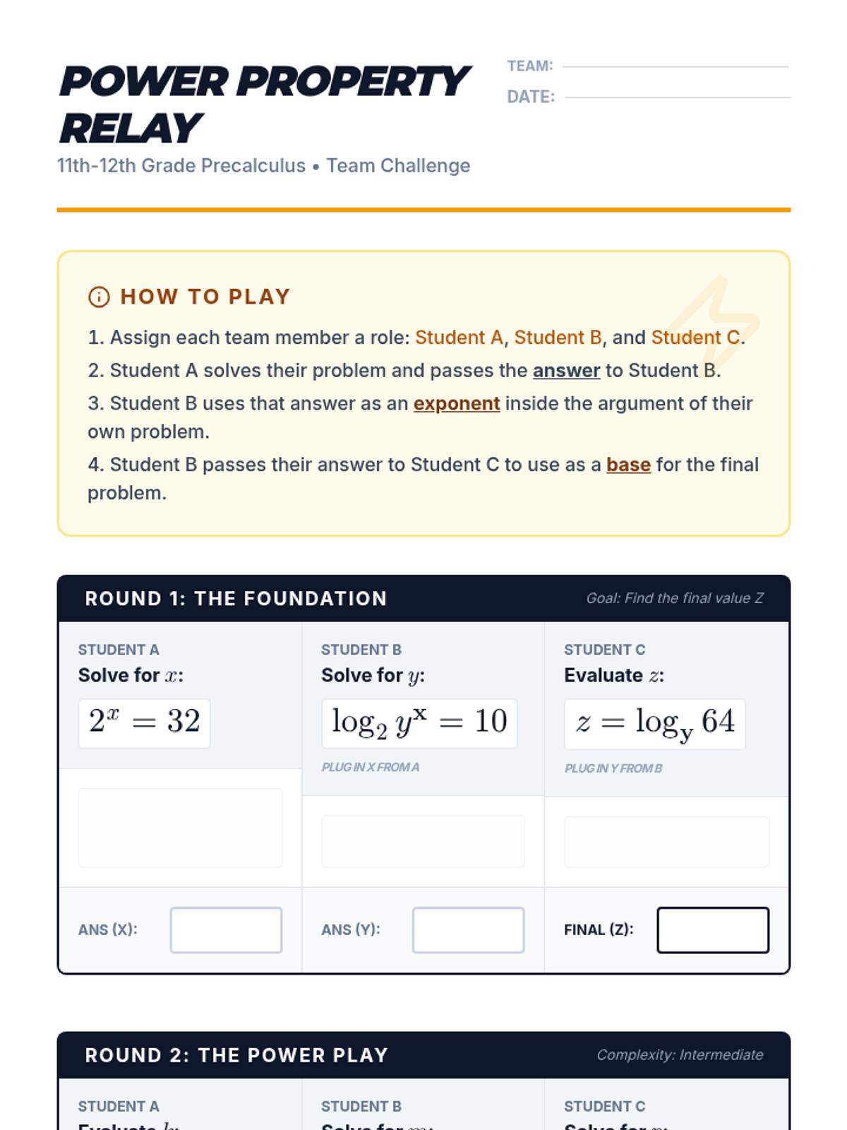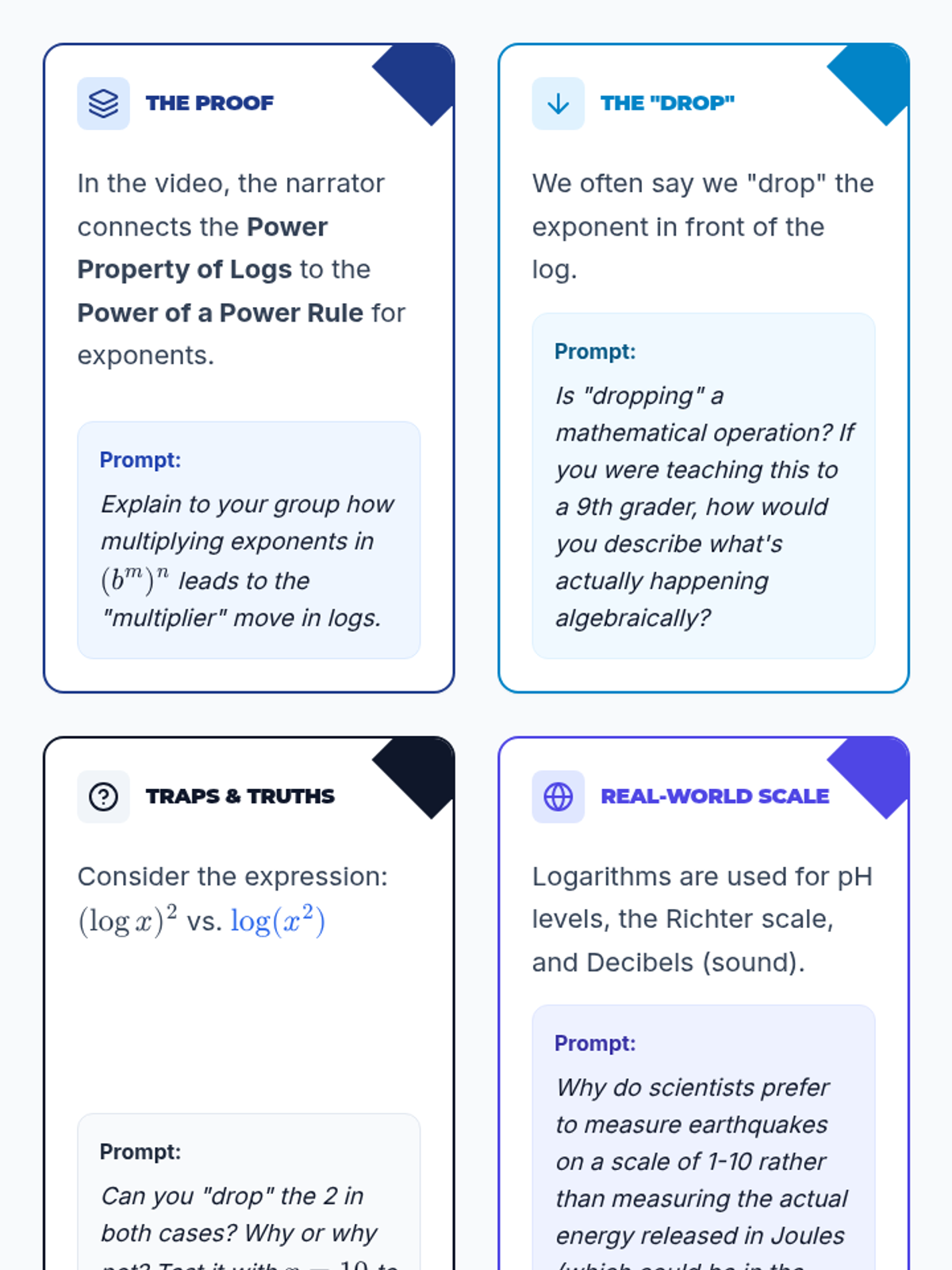A Precalculus lesson focusing on the Power Property of Logarithms, featuring a video-based proof, guided solving of exponential equations, and a collaborative relay activity. Students will explore why exponents can 'drop' in front of logarithms and apply this to solve equations where variables are in the exponent.
