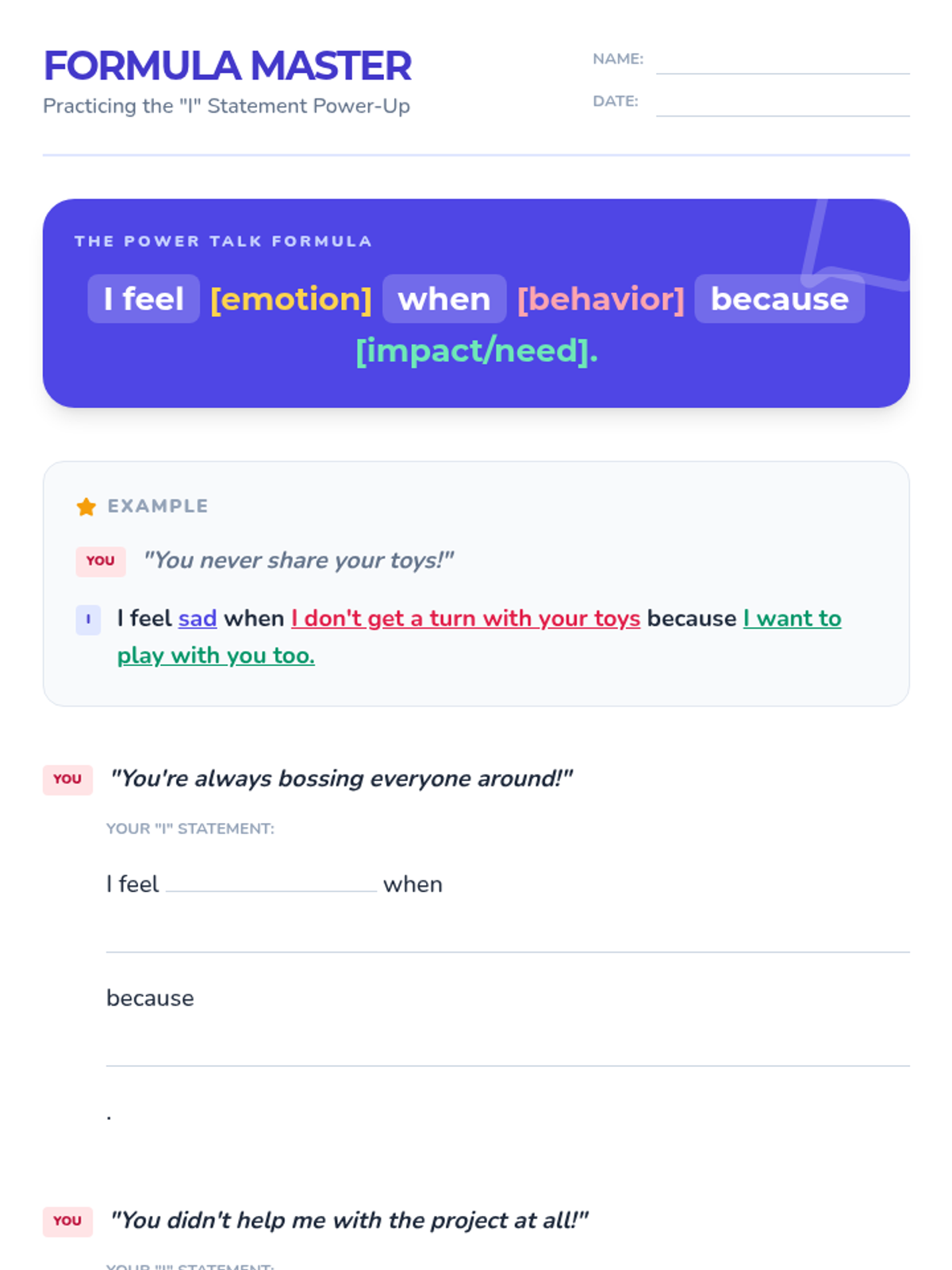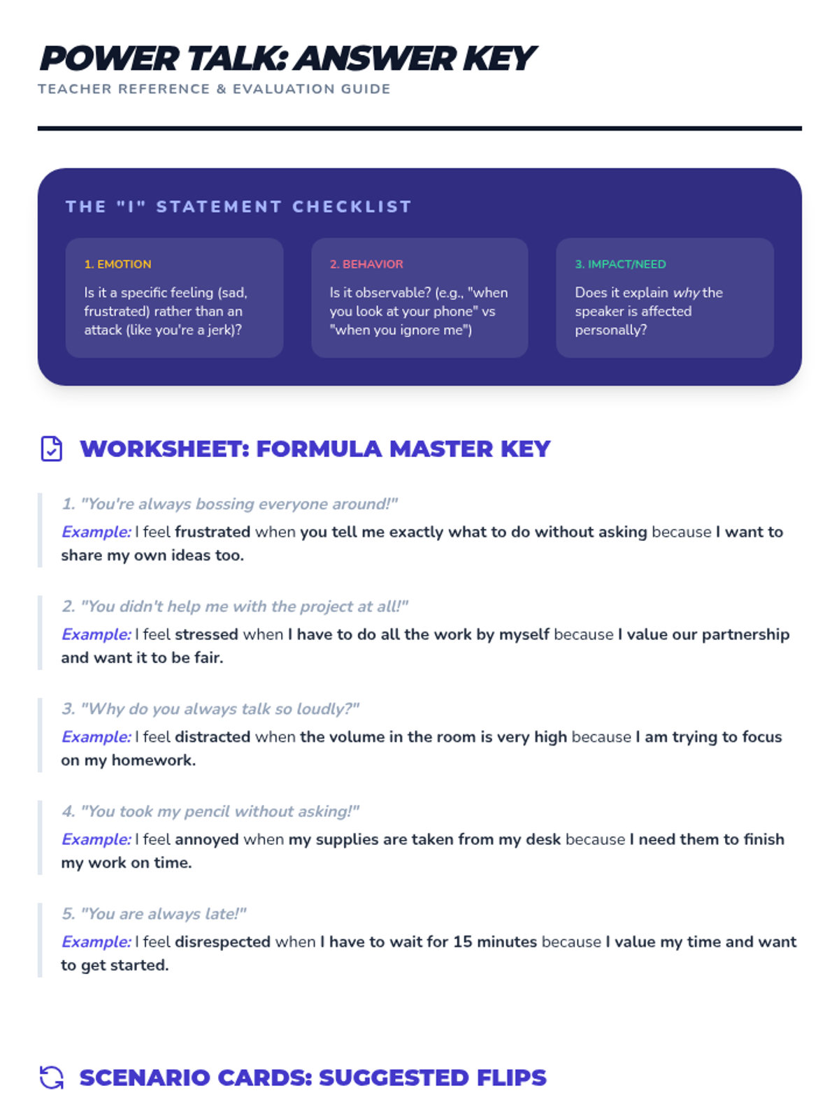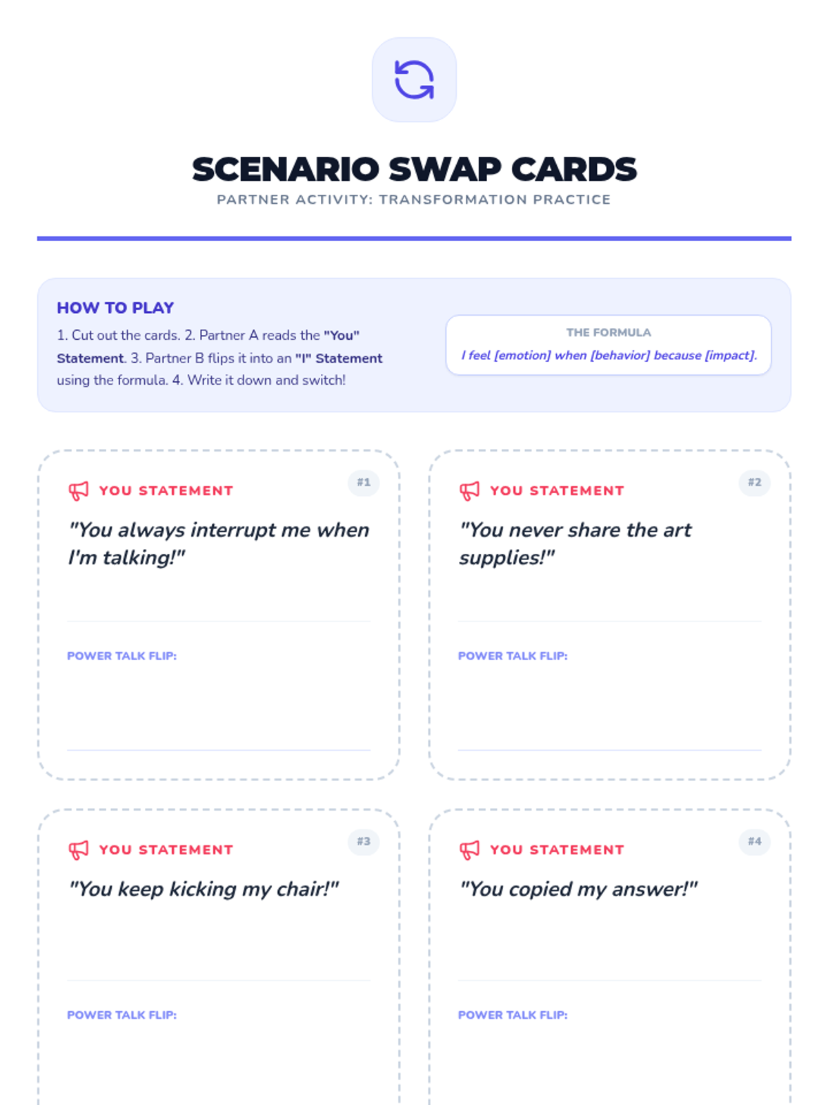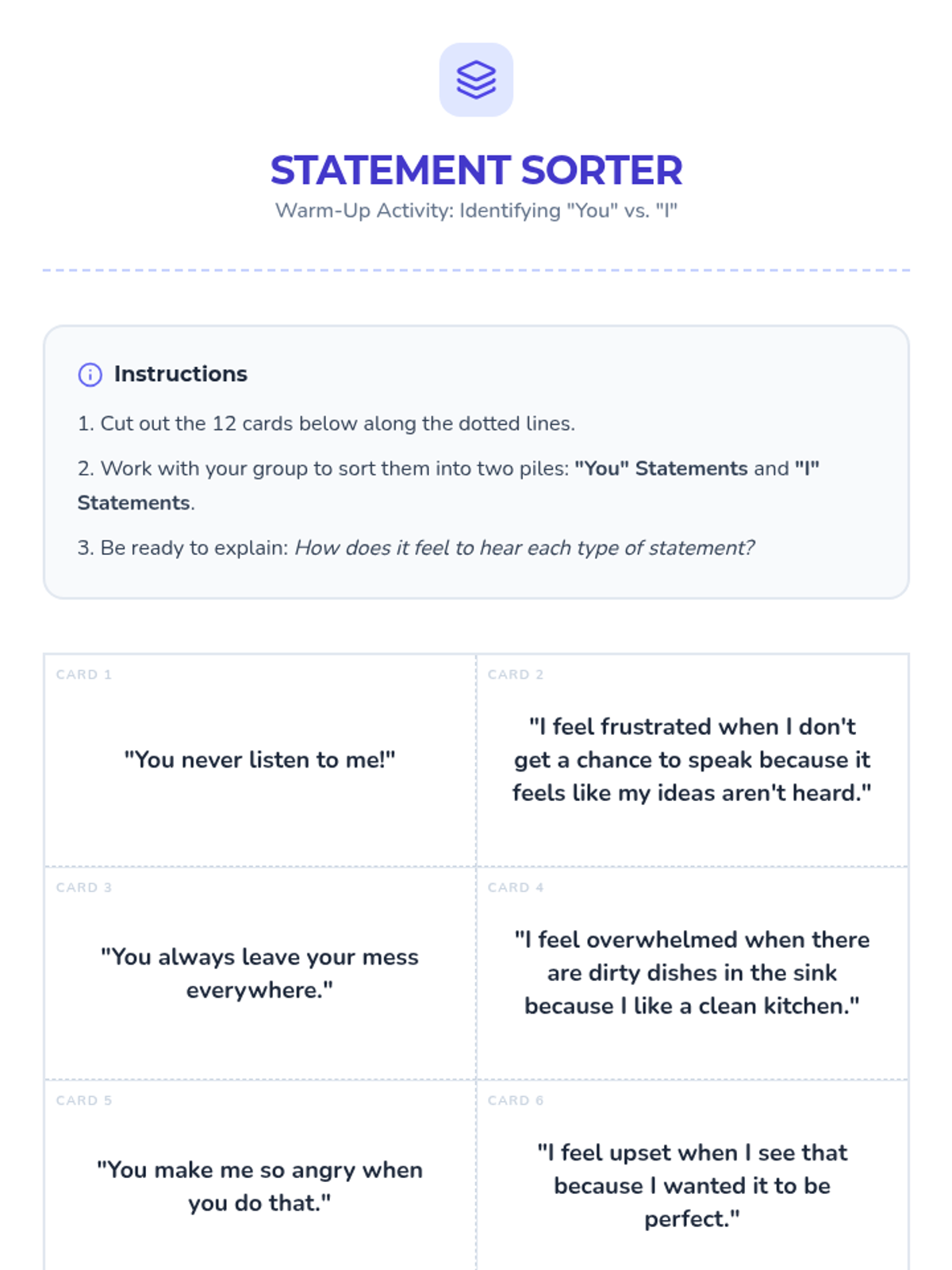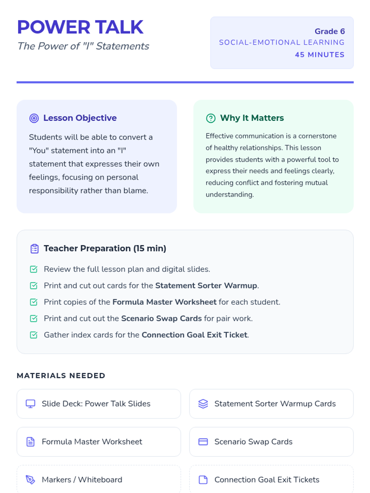 In this lesson, 6th-grade students learn to transform confrontational 'You' statements into constructive 'I' statements to express feelings clearly and avoid blame.