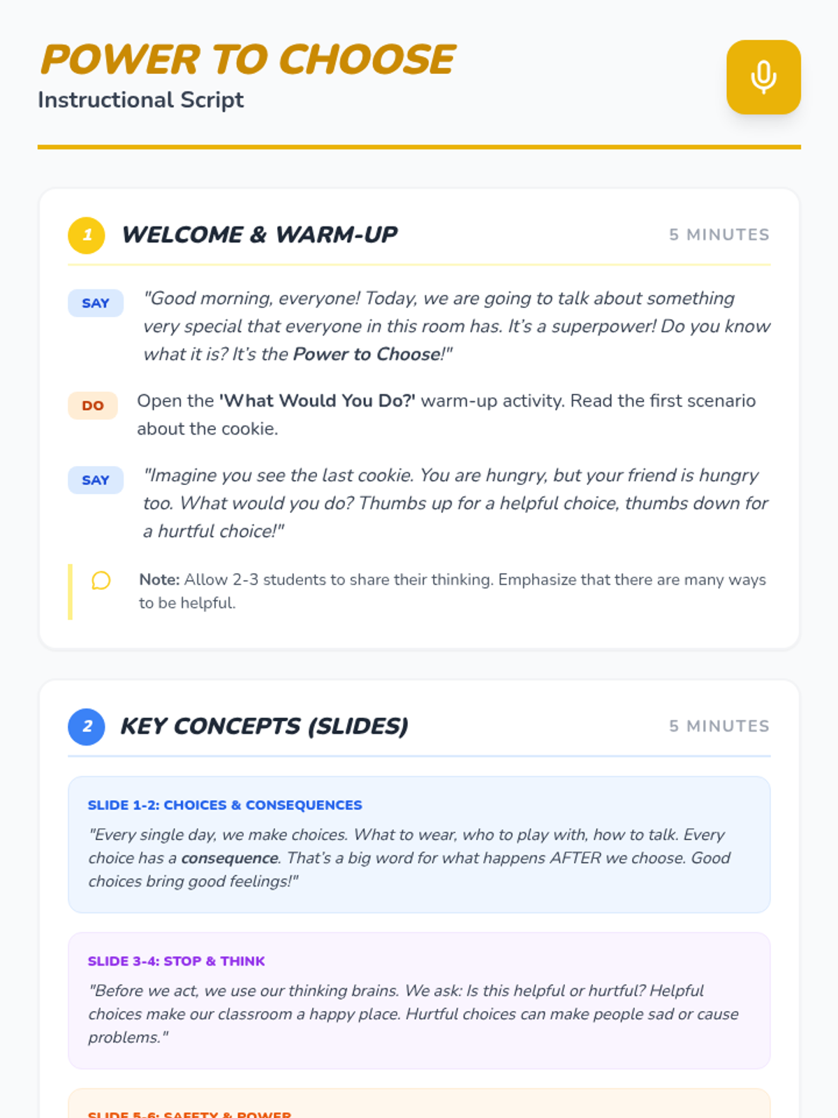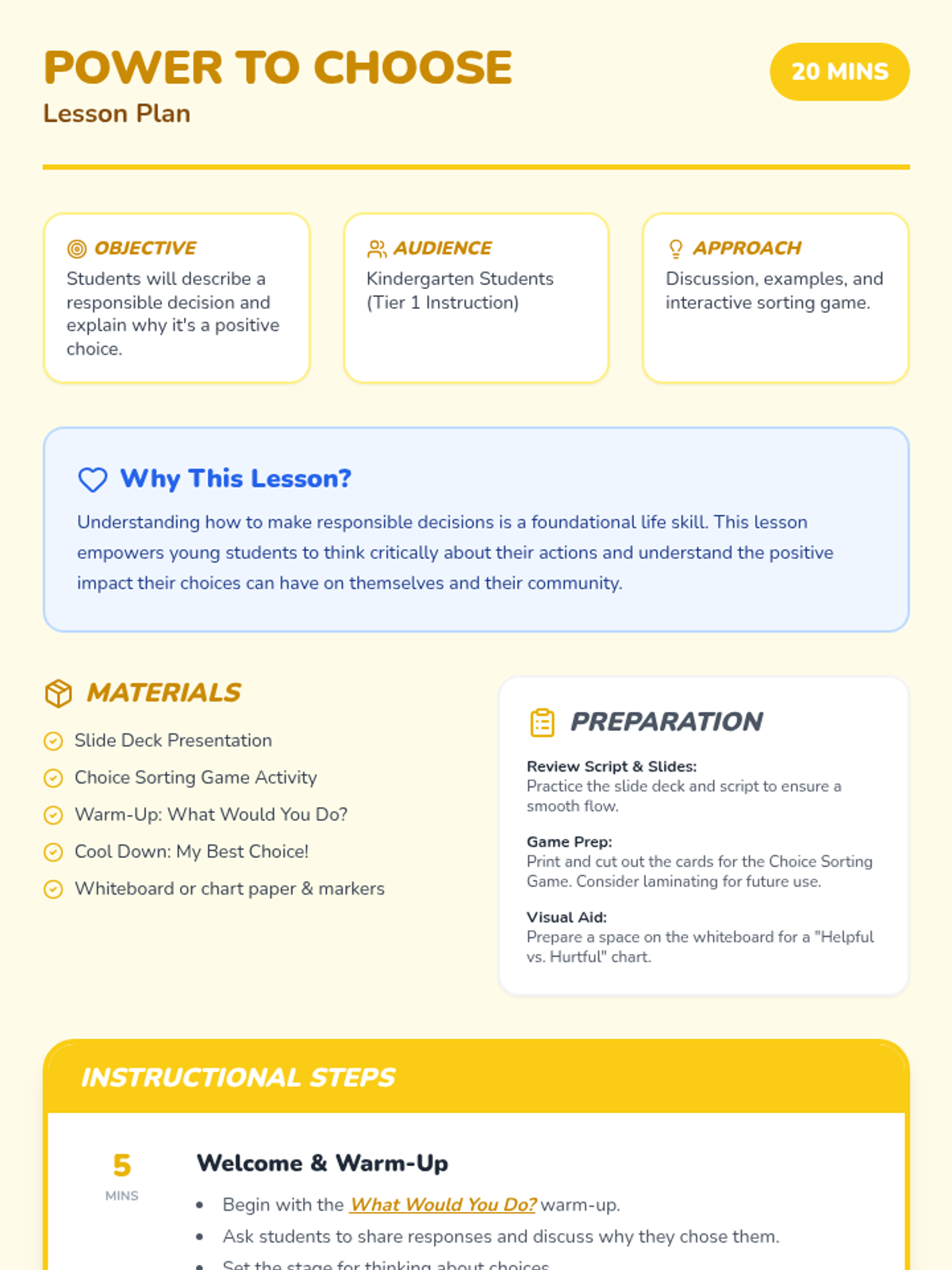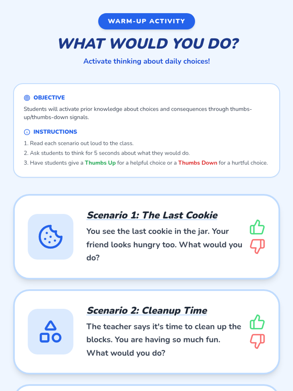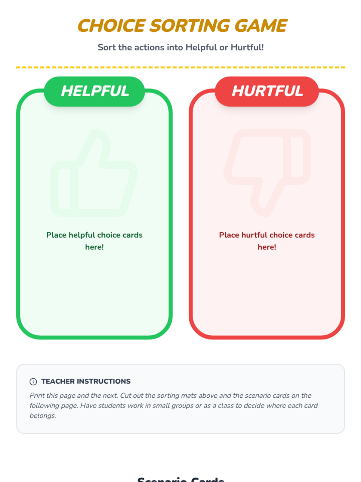 A 20-minute Kindergarten lesson that empowers students to make responsible choices by understanding helpful vs. hurtful actions and the consequences of their decisions.