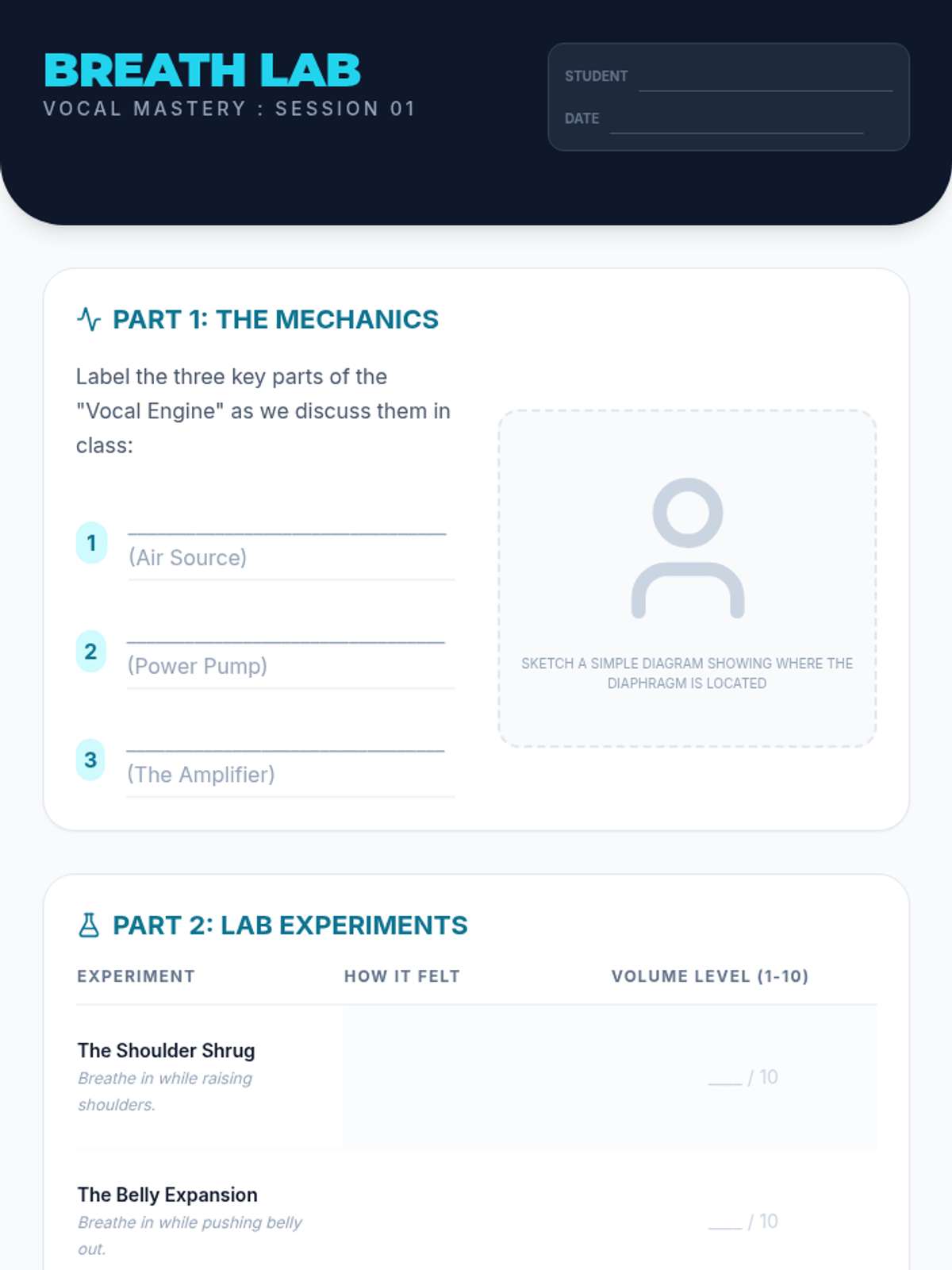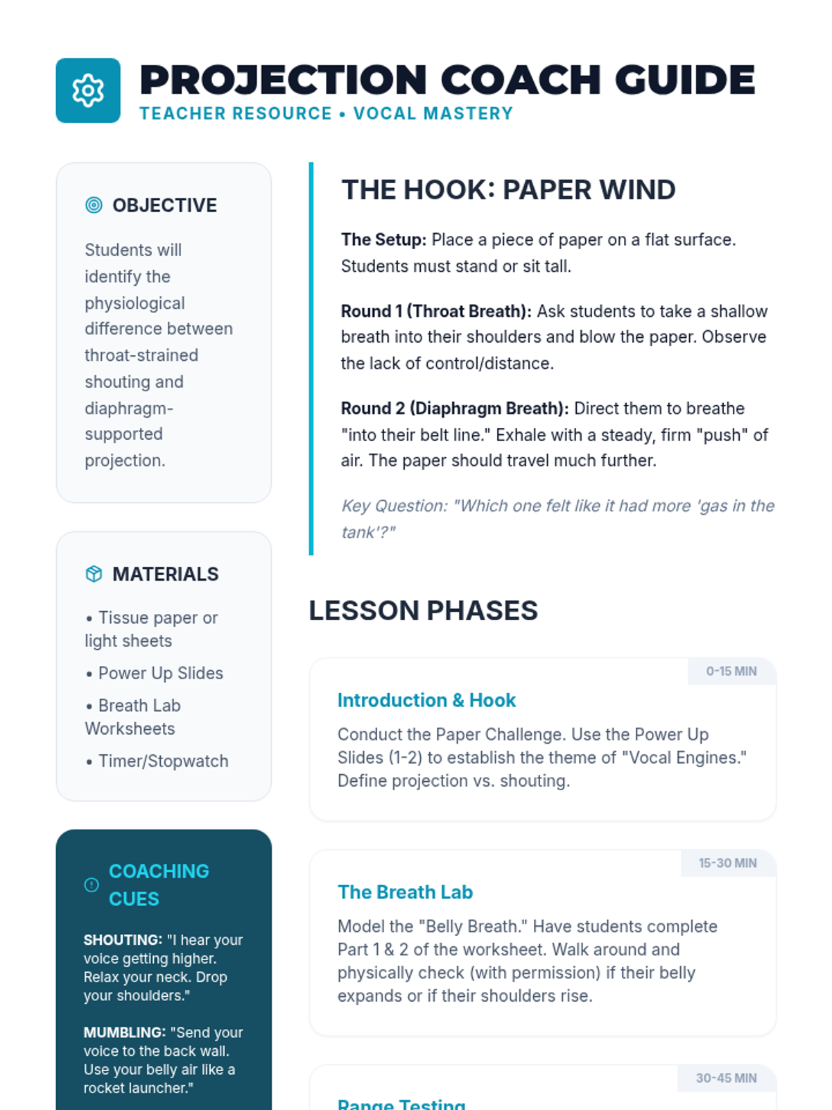 Students learn the difference between shouting and projecting by focusing on diaphragm-based breathing and posture.