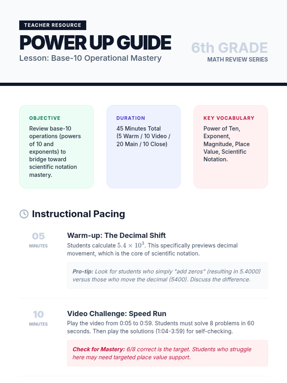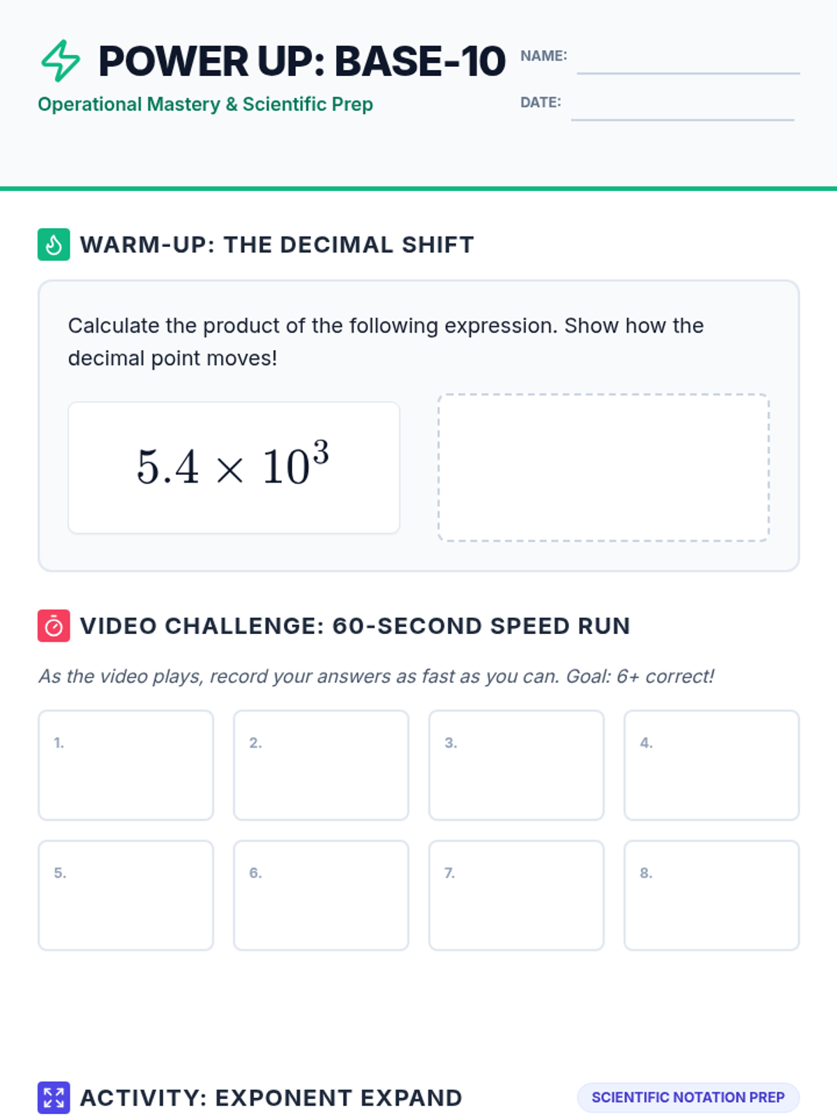 A high-energy review of base-10 operations designed to bridge 5th-grade mastery with 6th-grade scientific notation concepts. Includes a video-based speed run and an expanded notation challenge.