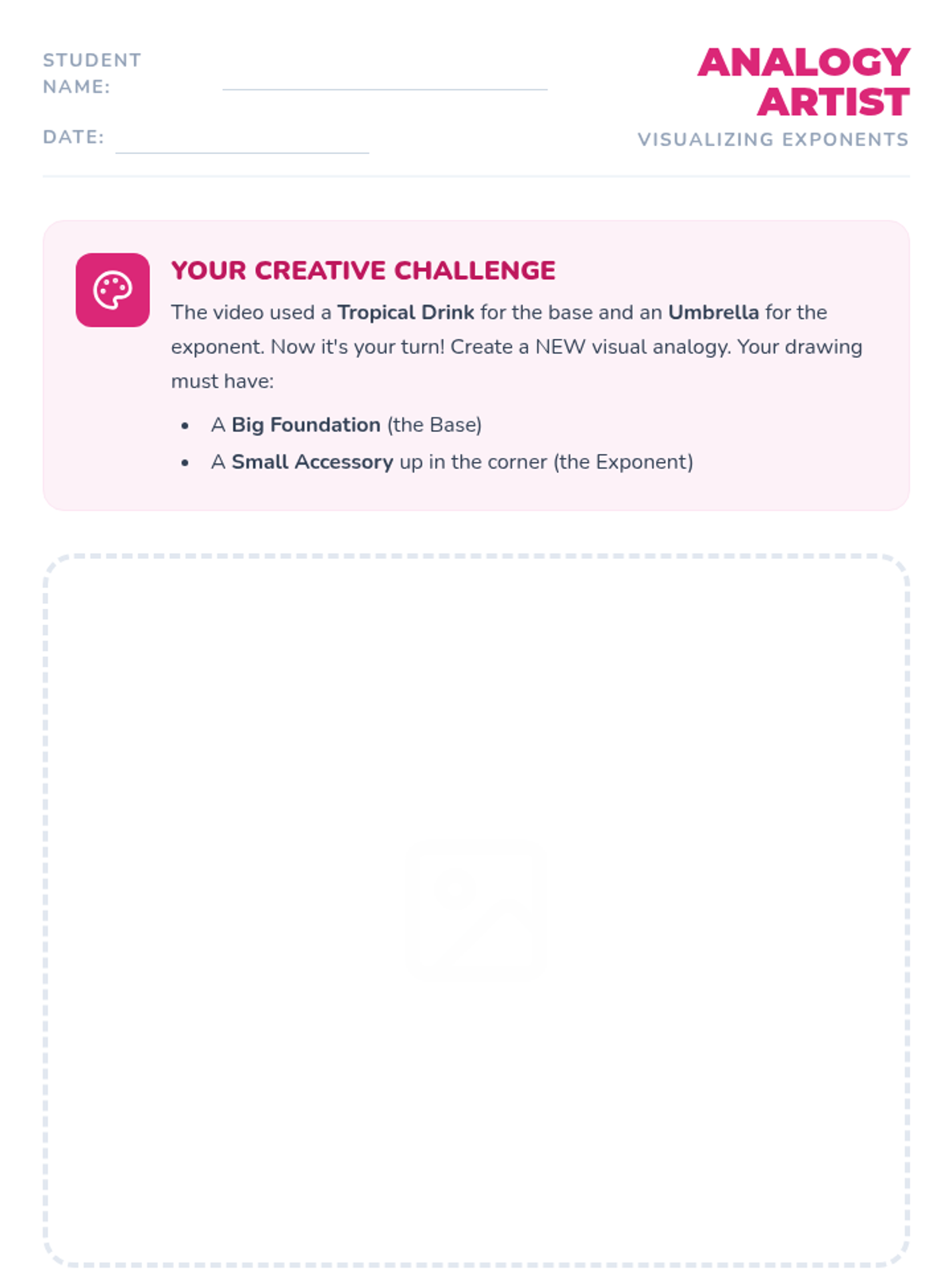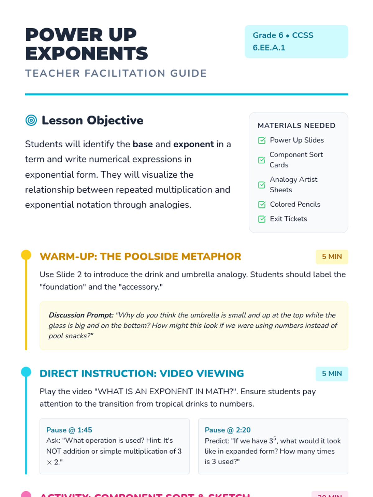 A comprehensive introduction to exponents for 6th-grade students, featuring a tropical drink analogy, interactive card sorting, and creative visual modeling to master CCSS 6.EE.A.1.