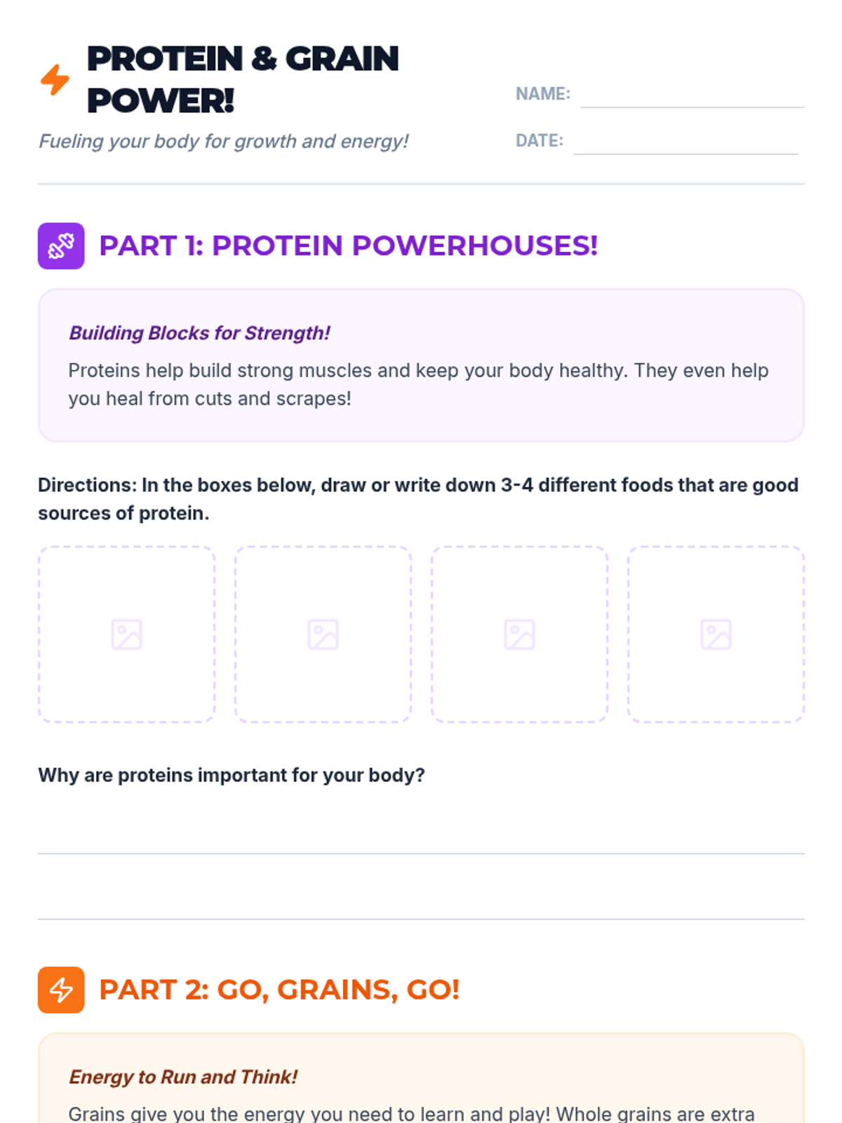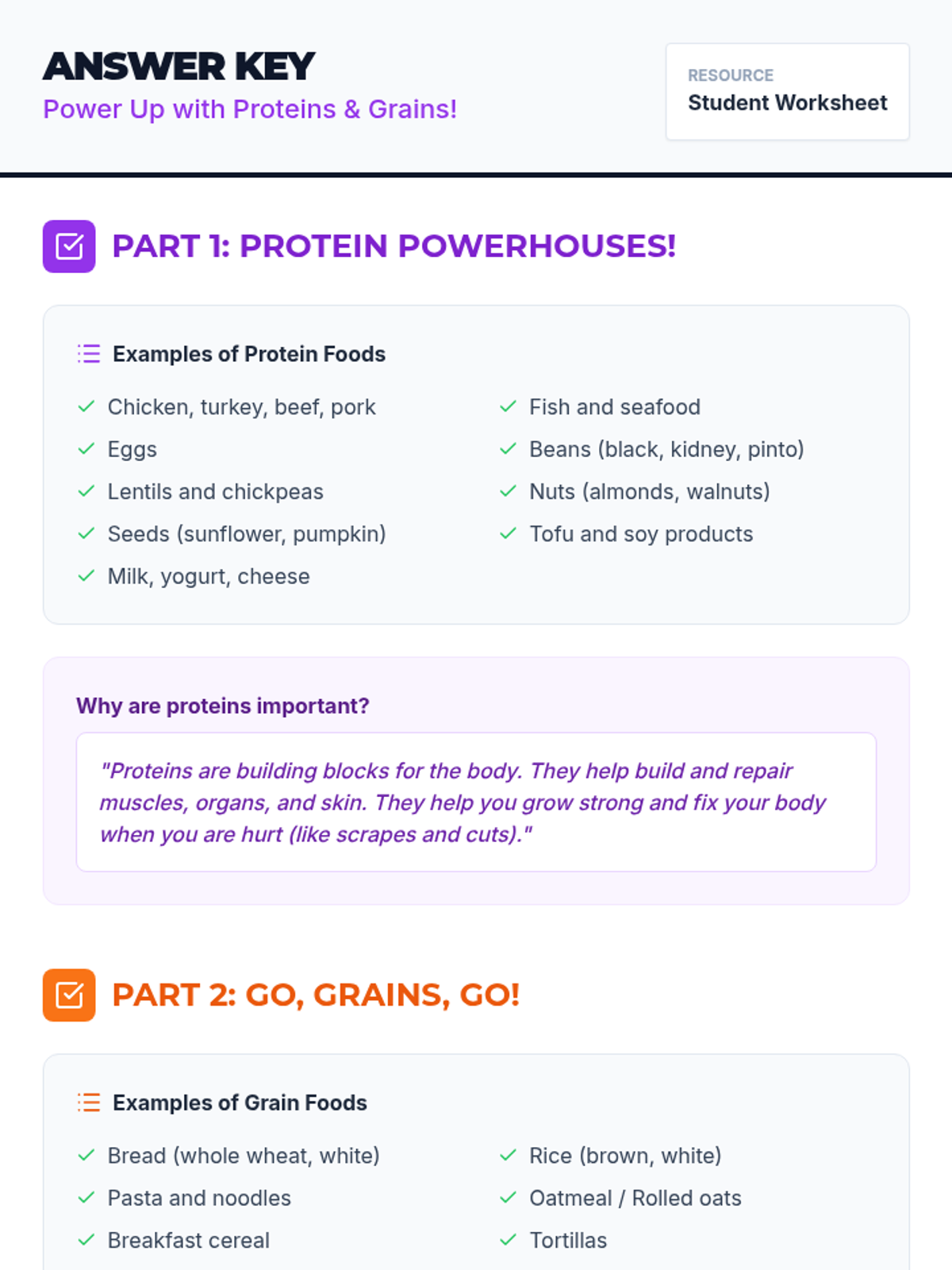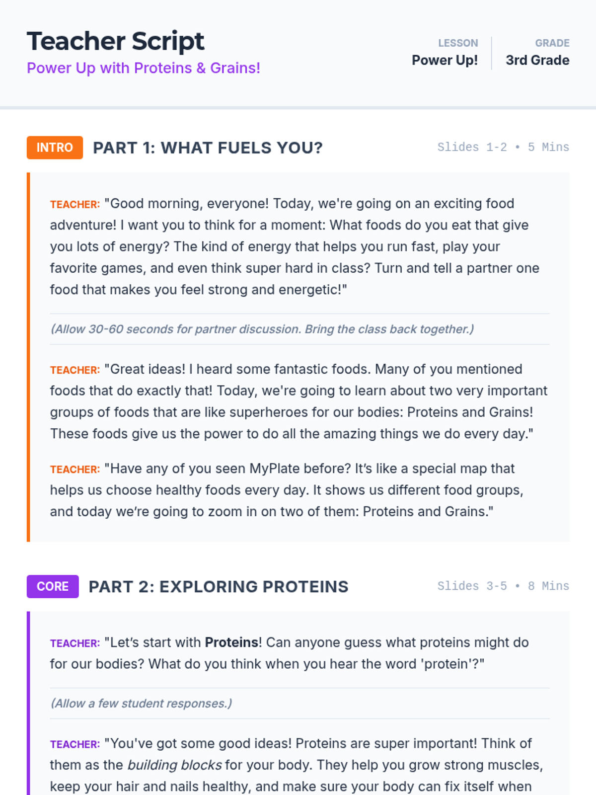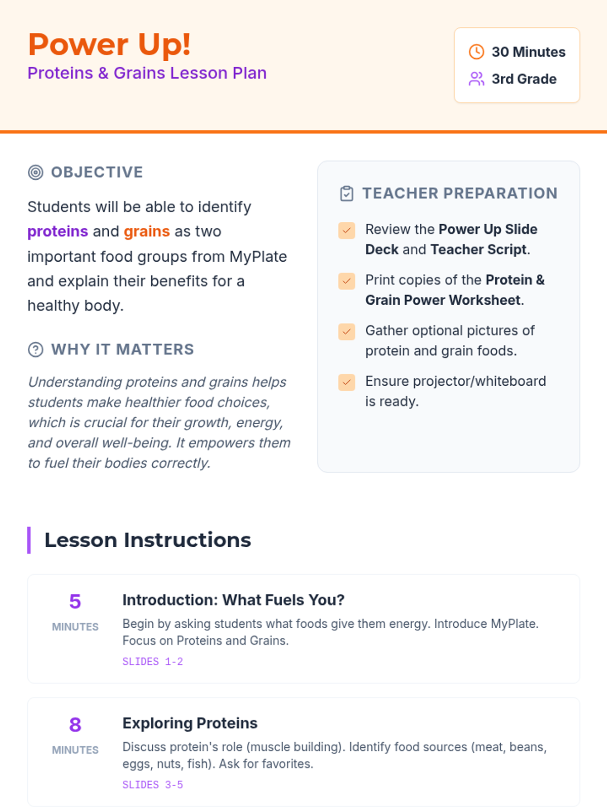 A 30-minute interactive lesson for 3rd graders on MyPlate's protein and grain groups, focusing on their roles in muscle growth and energy.