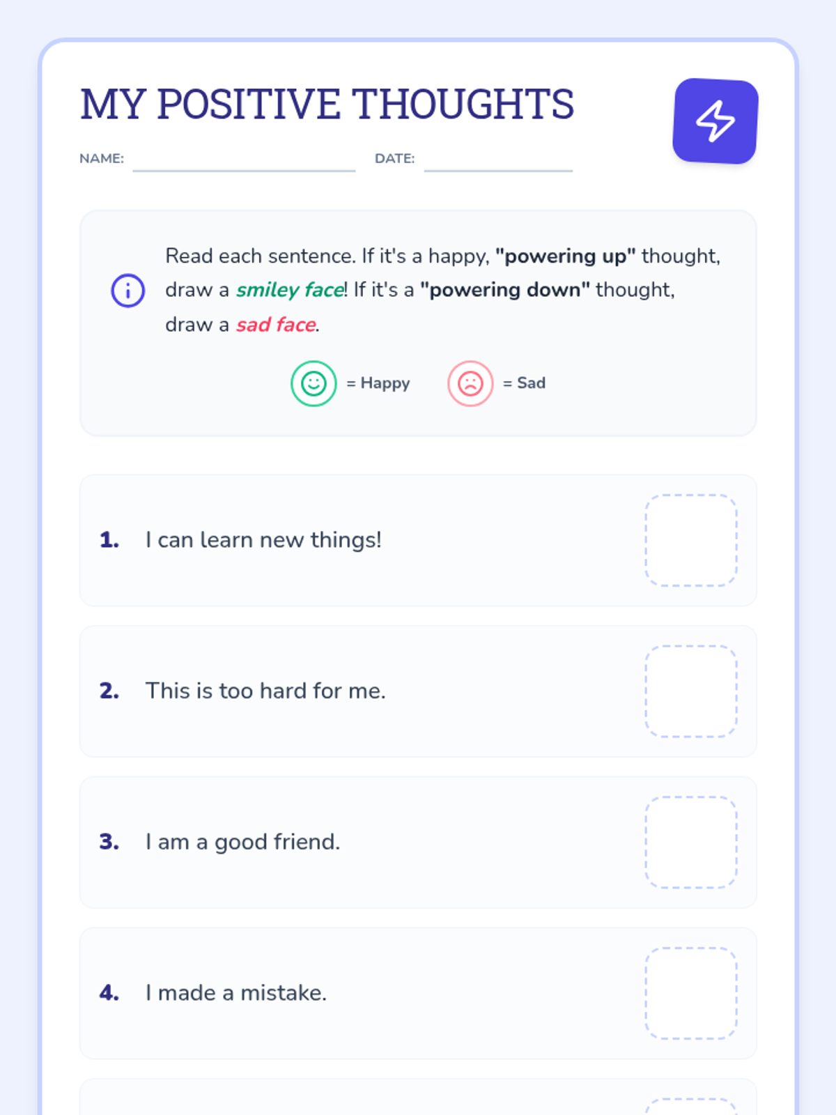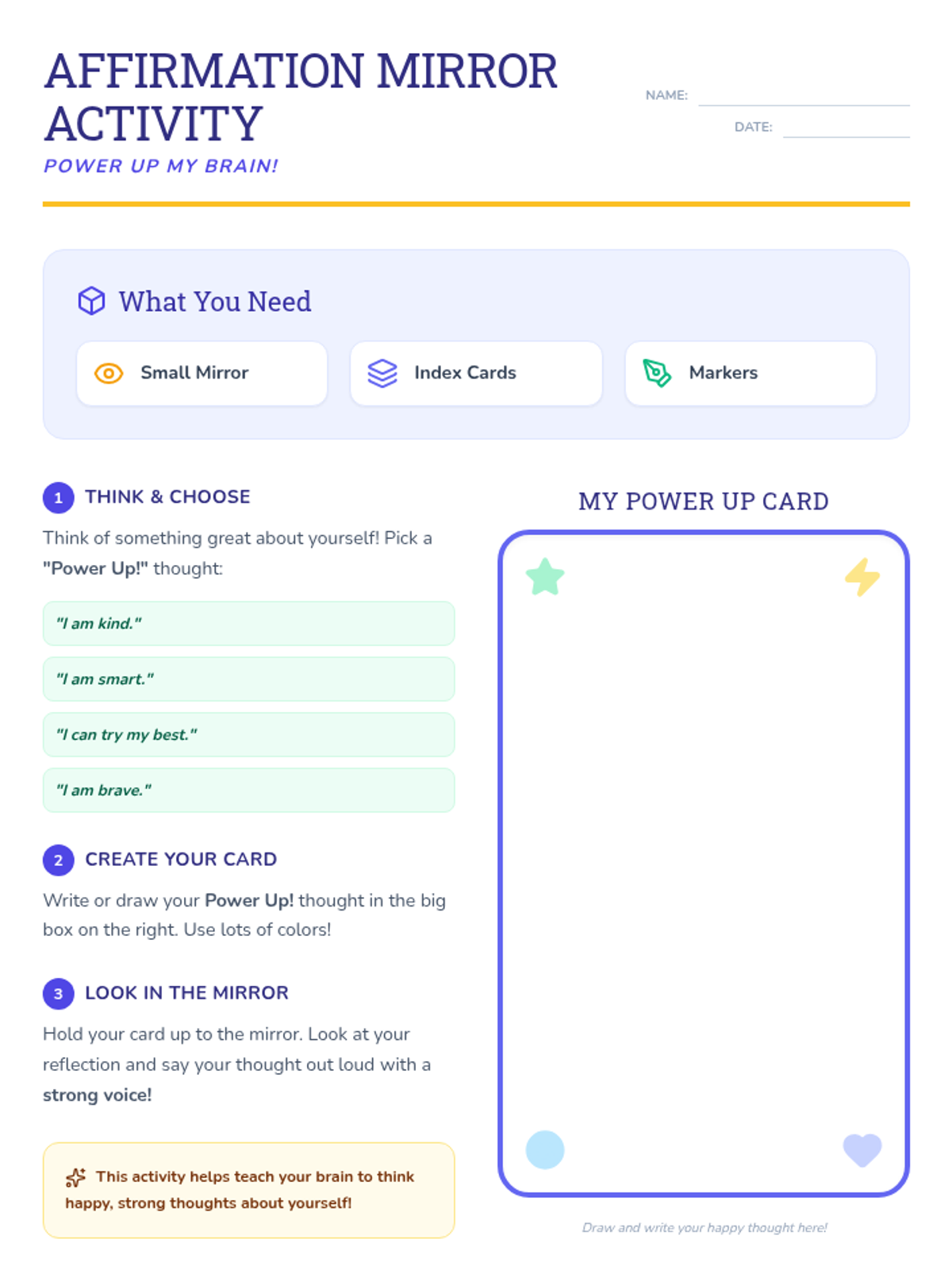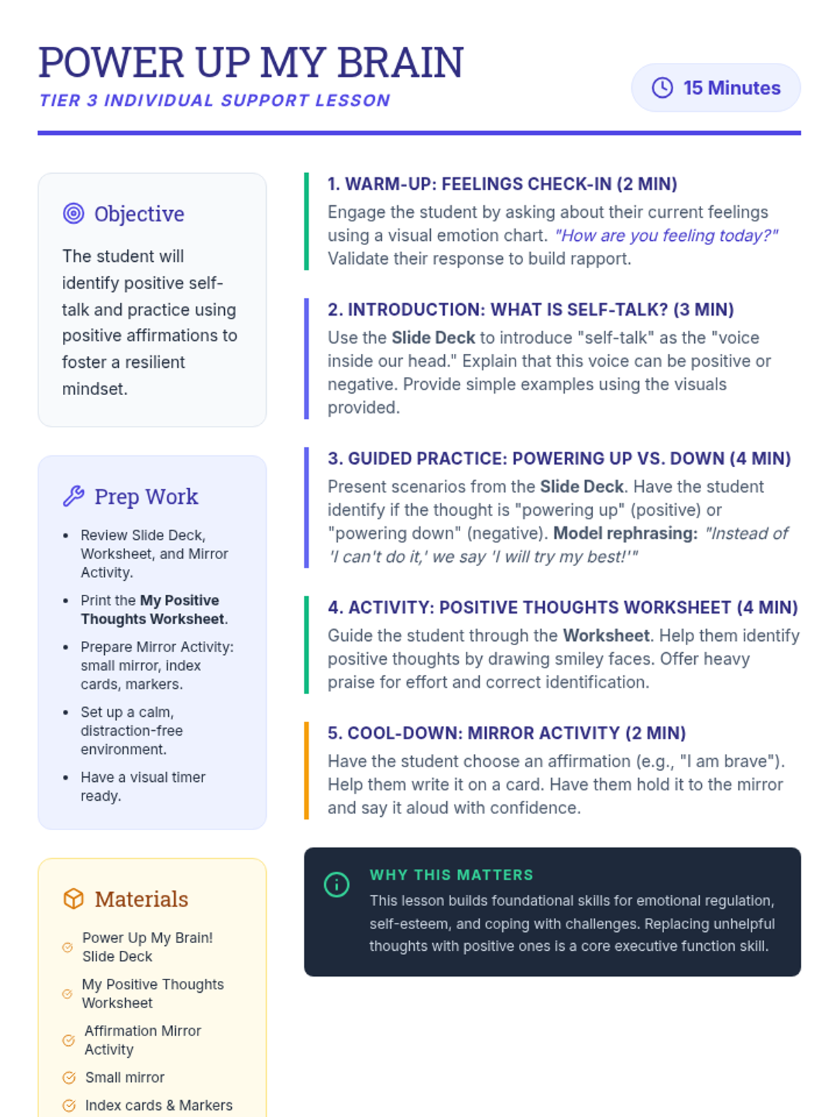 A 15-minute Tier 3 individual lesson for first-grade students with autism focused on identifying and practicing positive self-talk to build confidence and resilience.