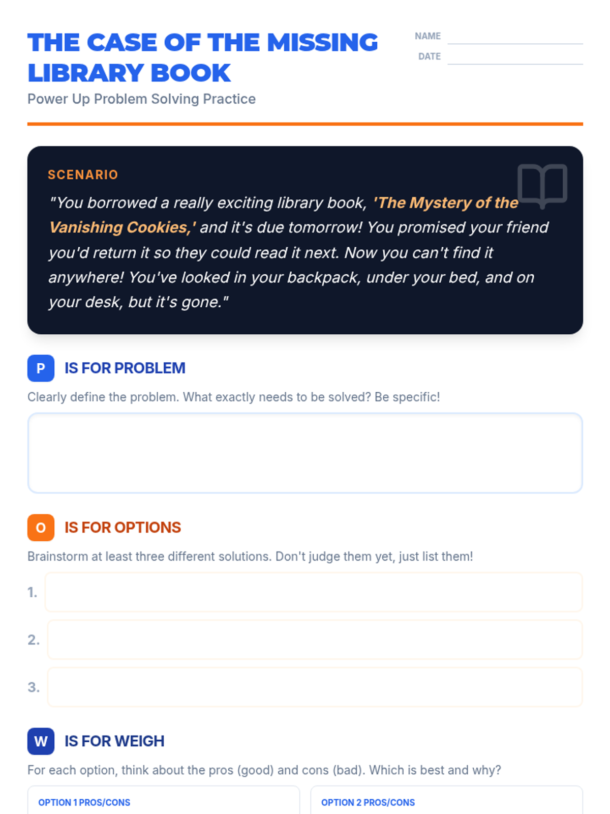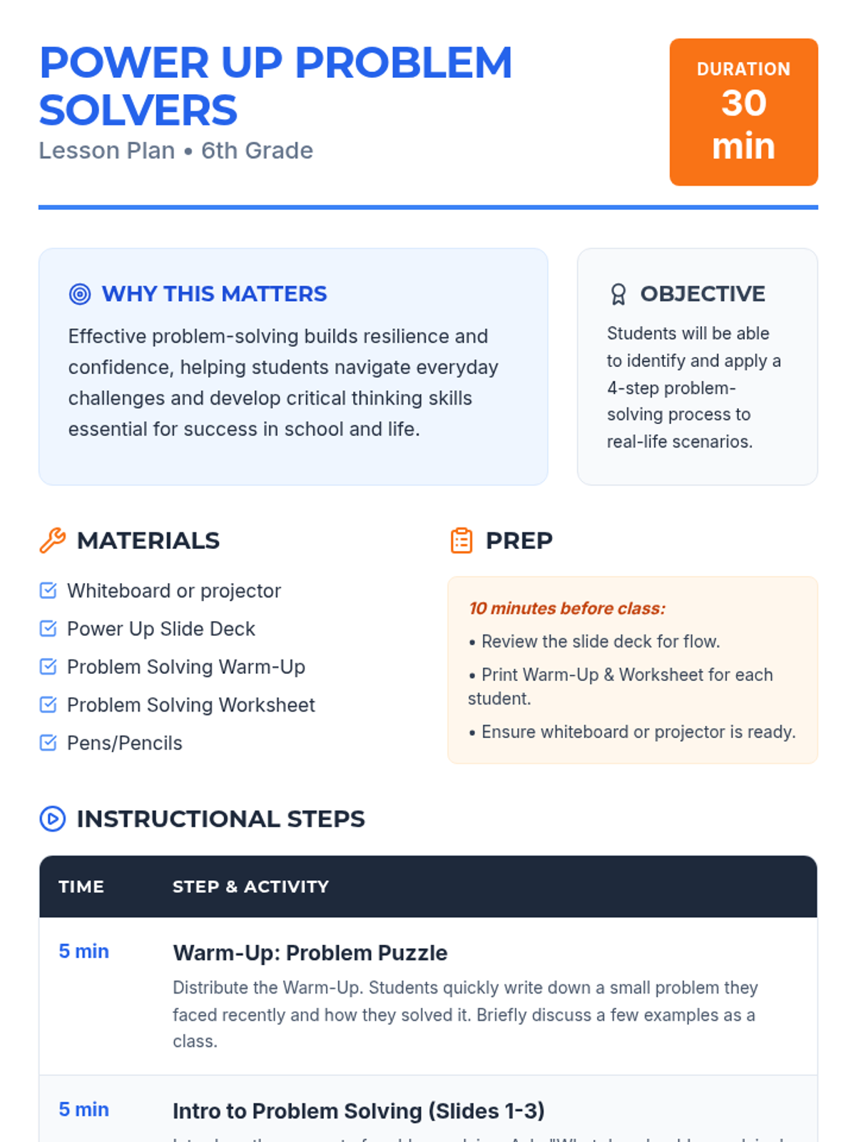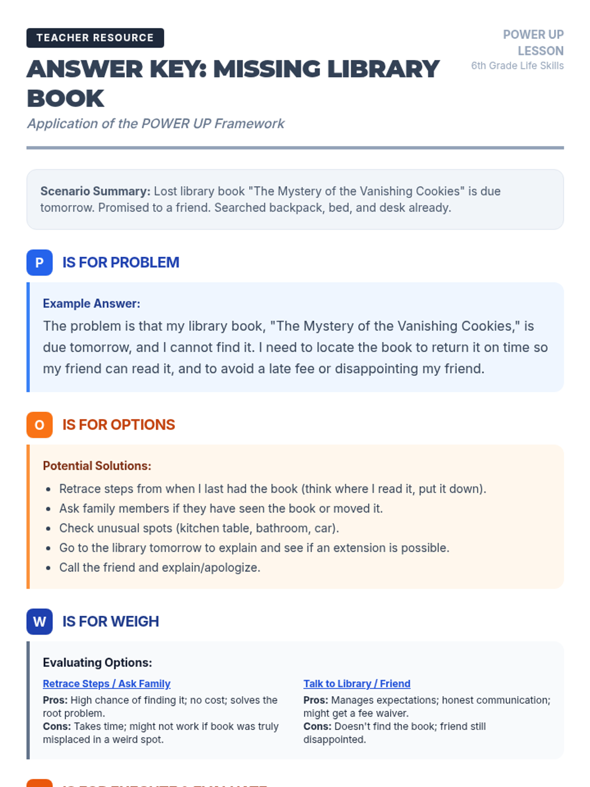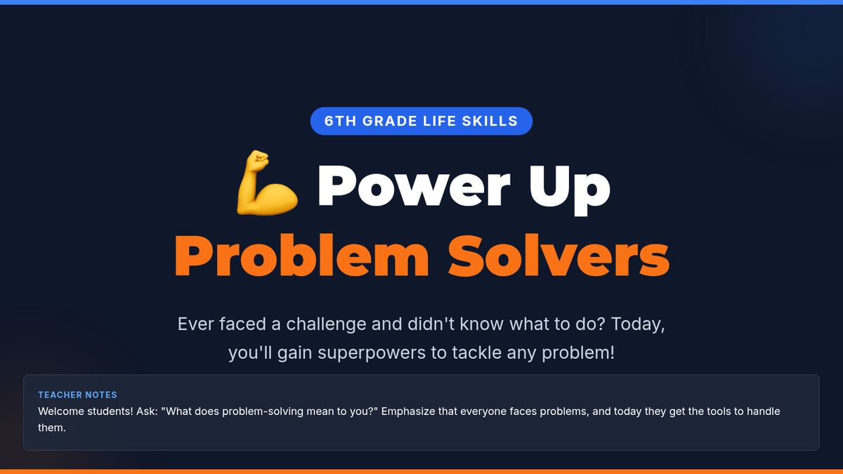 This lesson empowers 6th-grade students with practical problem-solving strategies using the POWER UP framework (Problem, Options, Weigh, Execute/Evaluate). Students will engage in interactive discussions and hands-on practice to build resilience and critical thinking skills.