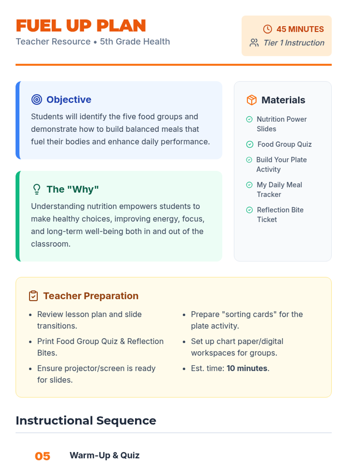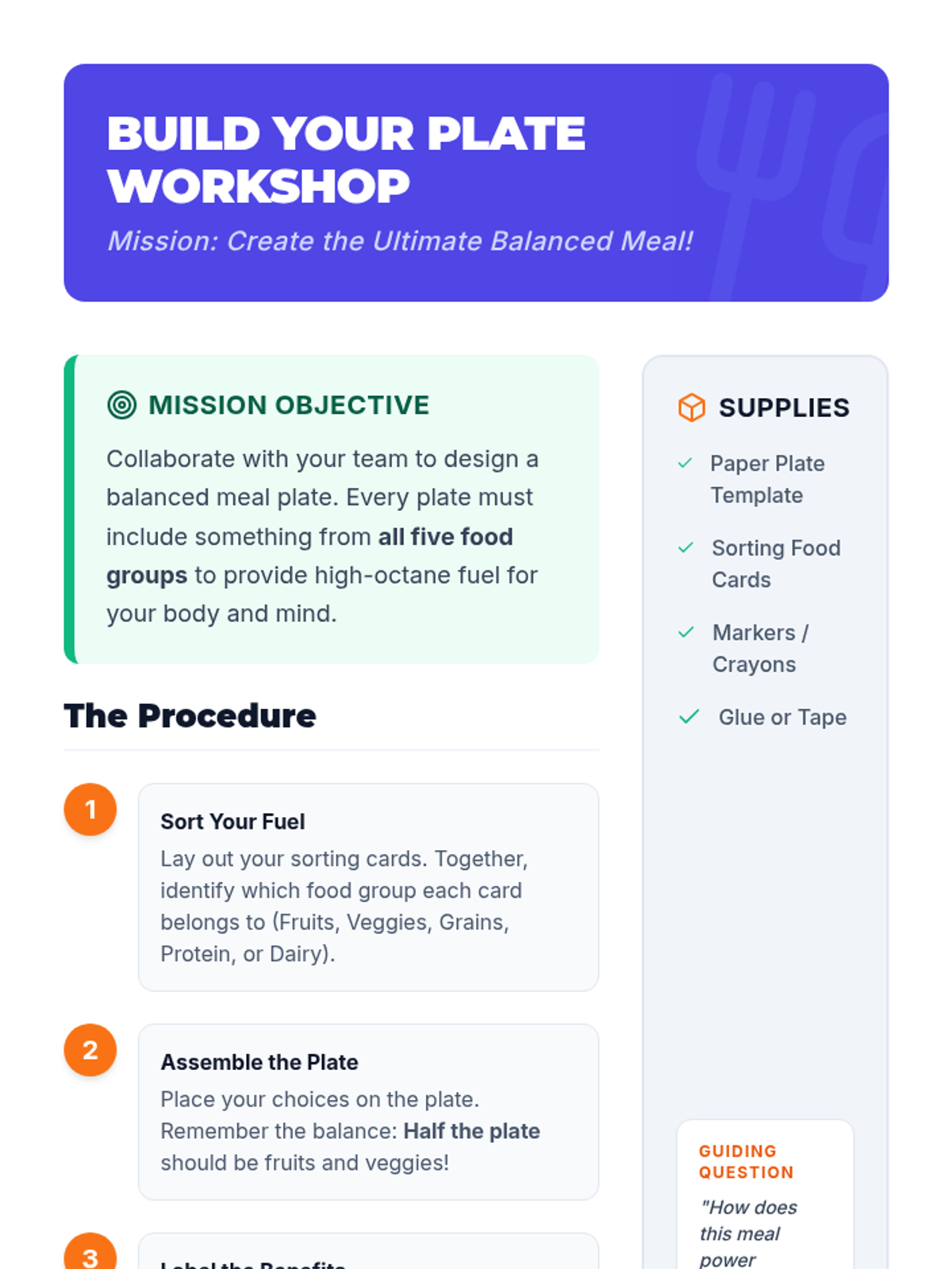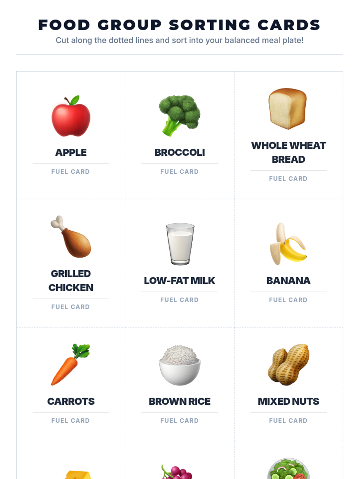 Students will identify the five food groups and demonstrate how to build balanced meals that fuel their bodies and enhance daily performance.