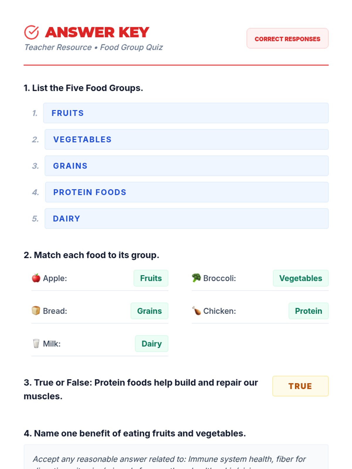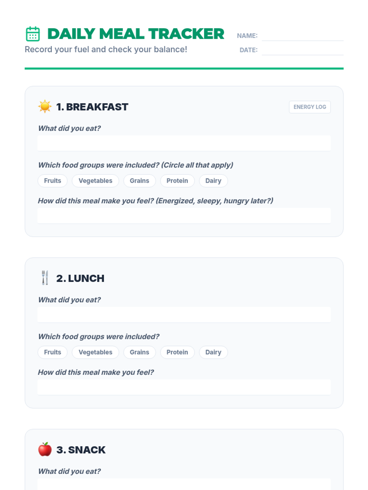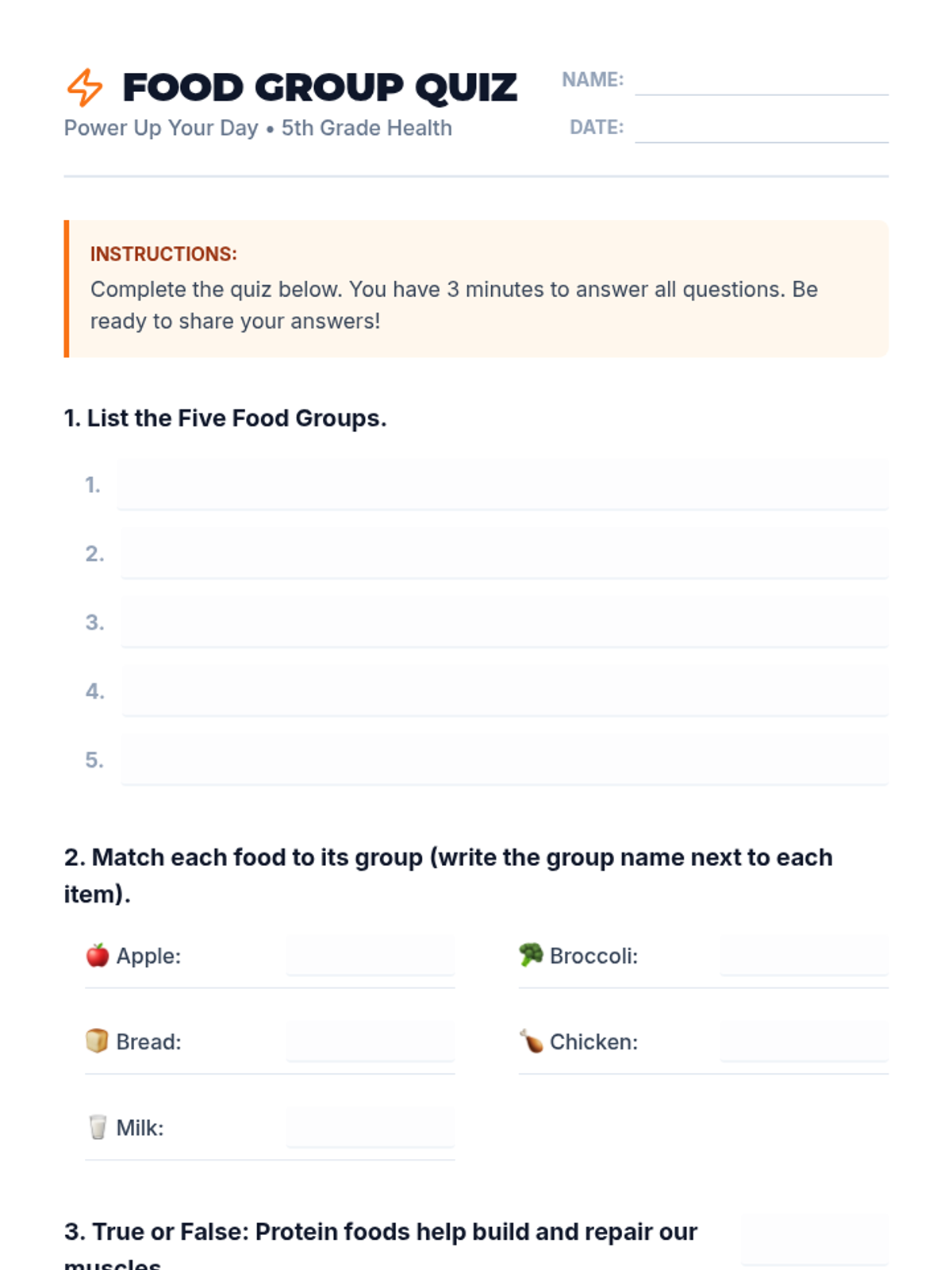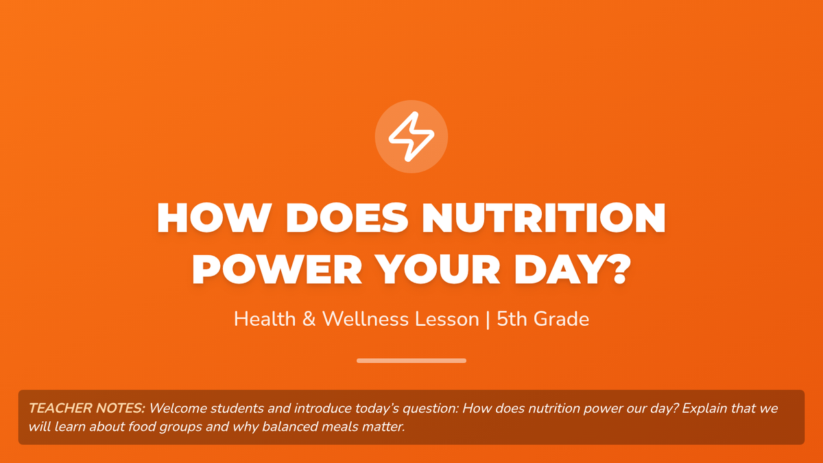 Students will identify the five food groups and demonstrate how to build balanced meals that fuel their bodies and enhance daily performance.