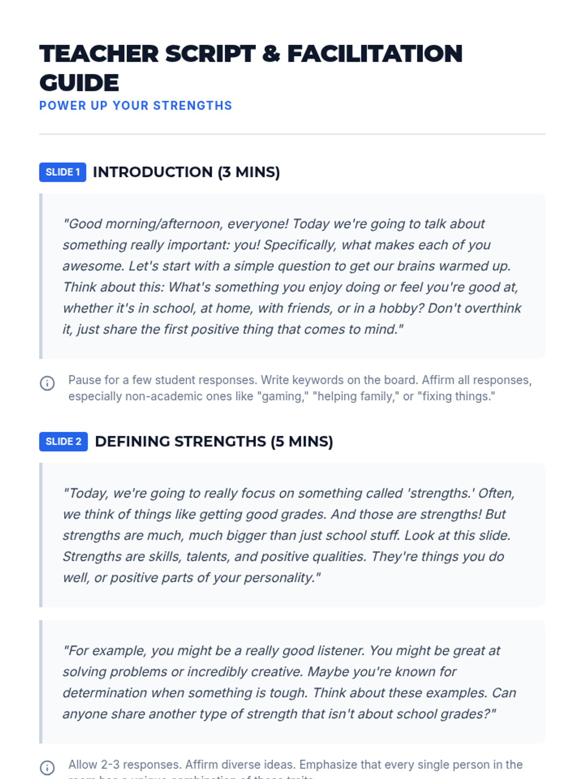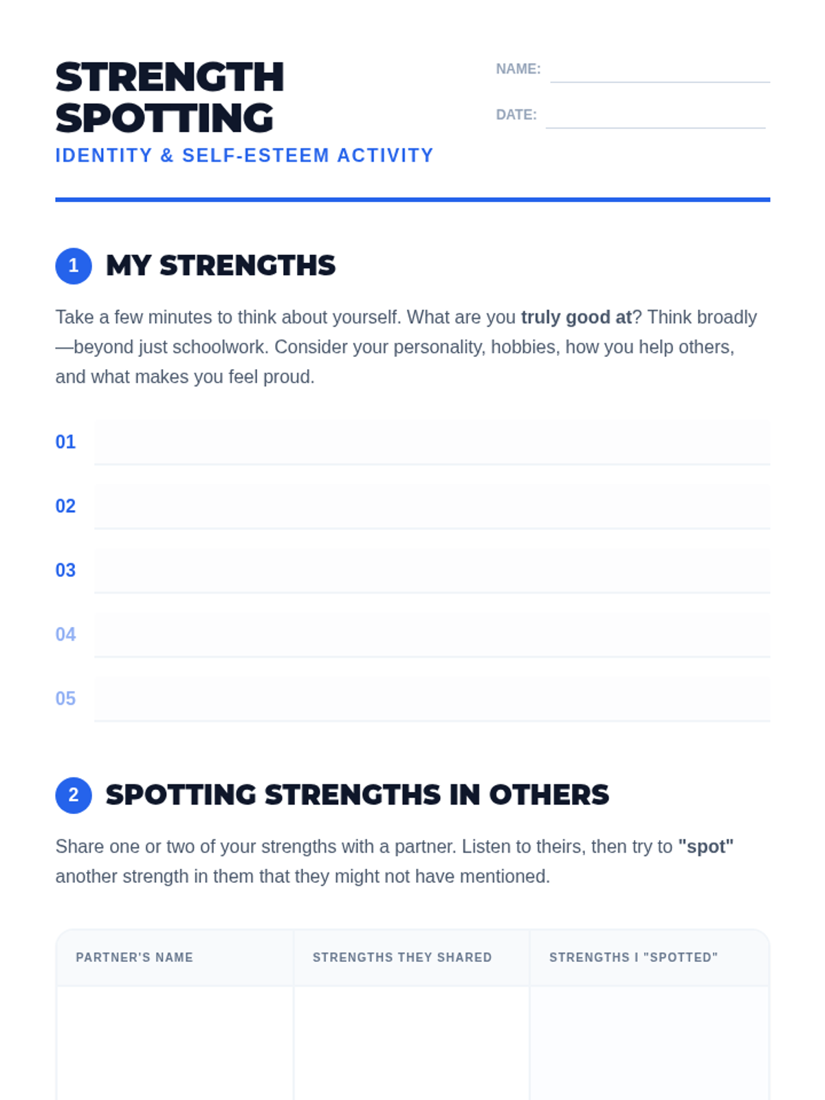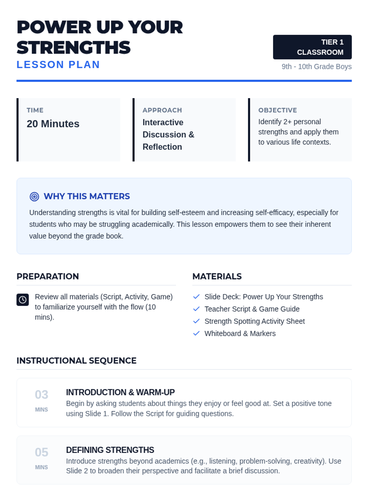 A 20-minute interactive lesson for 9th and 10th-grade boys focused on identifying personal strengths and building self-esteem beyond academic achievement.