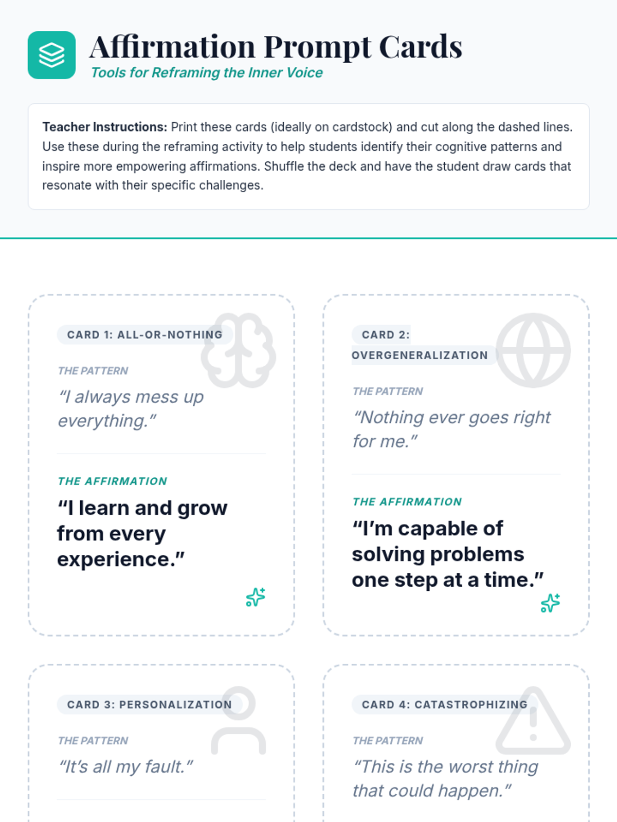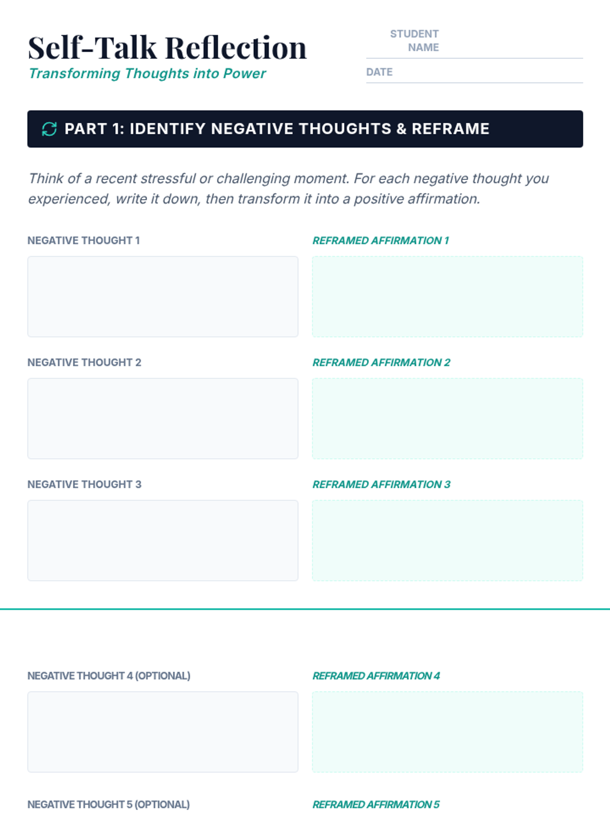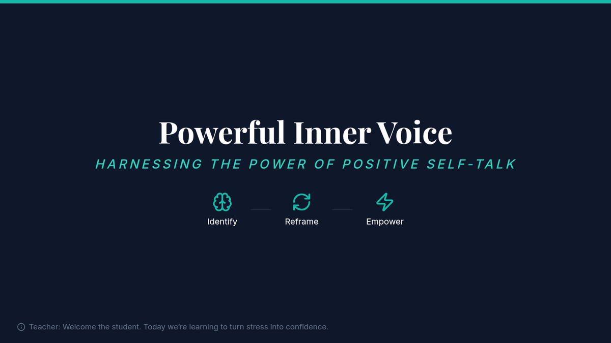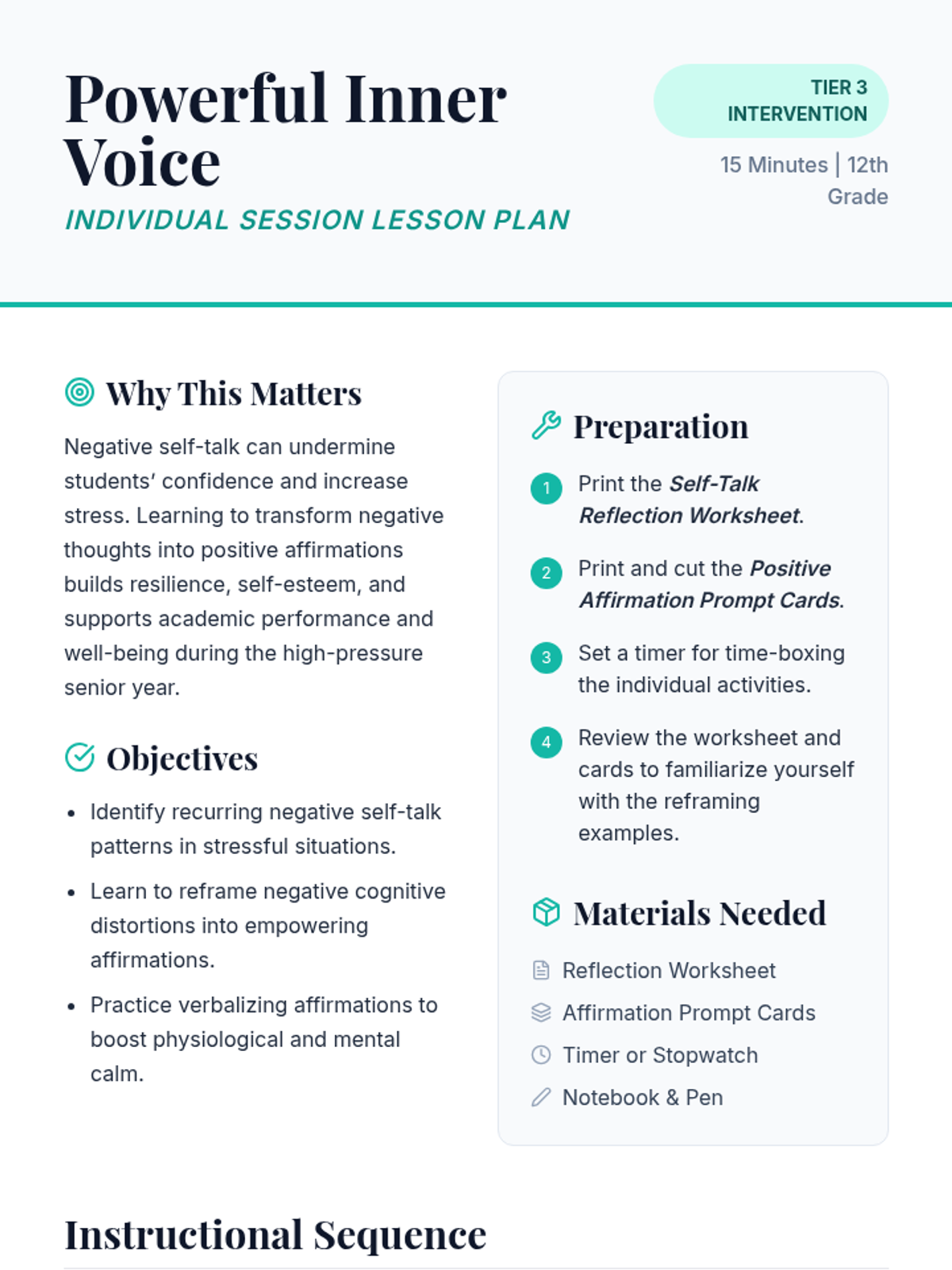 A 15-minute individual session designed for 12th graders to identify negative self-talk and transform it into empowering affirmations for stress management and confidence.