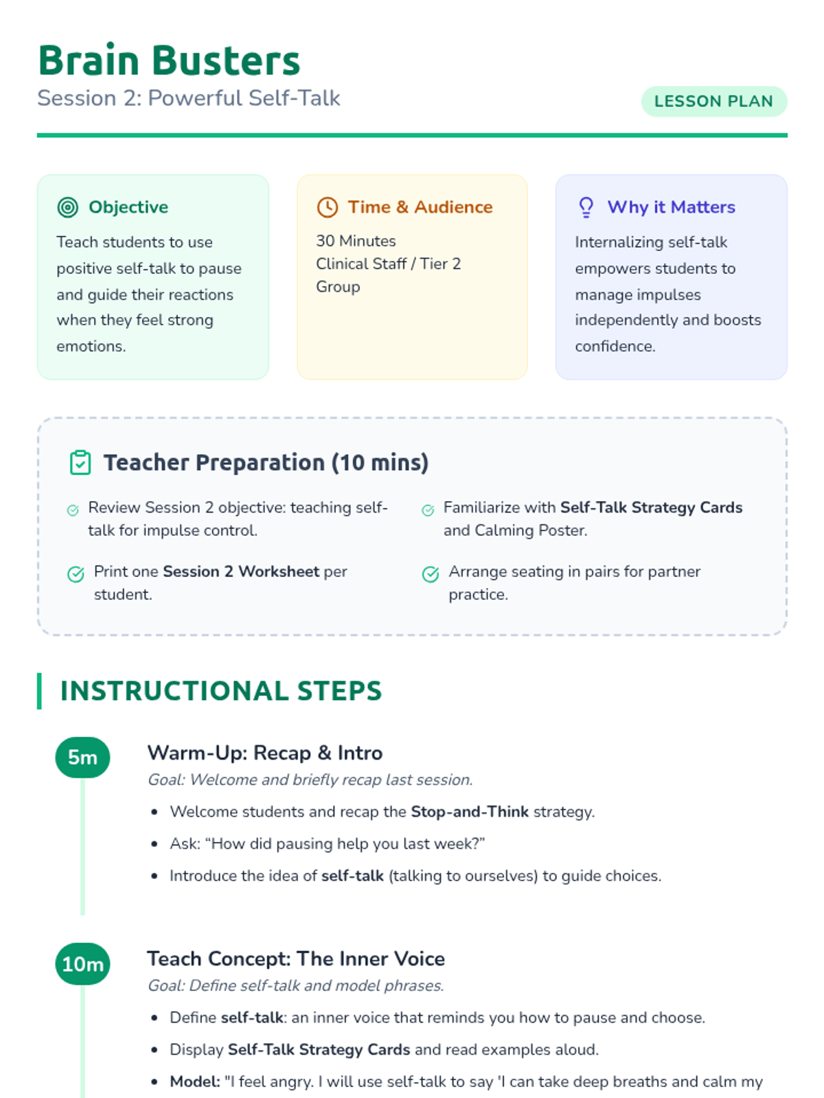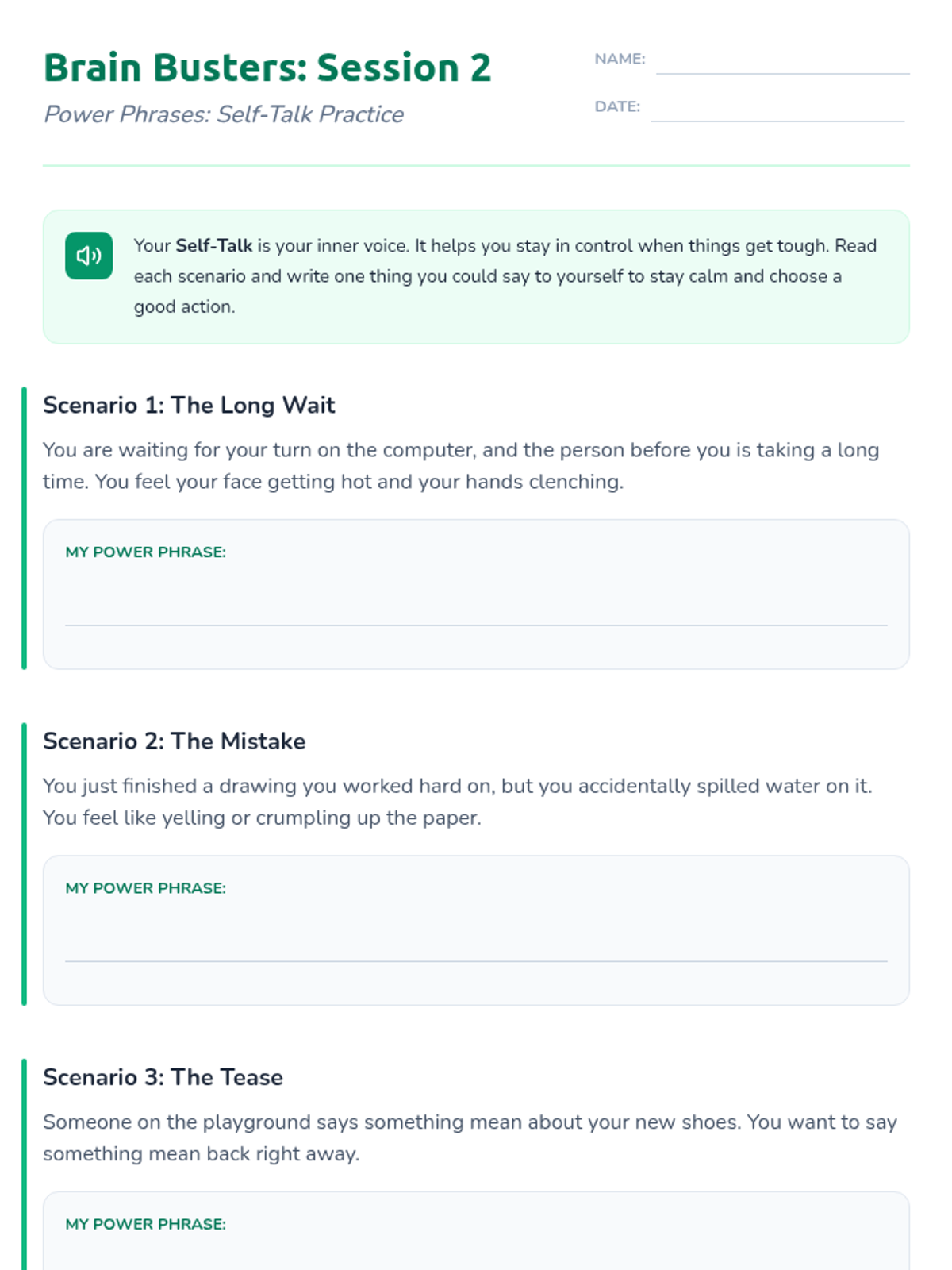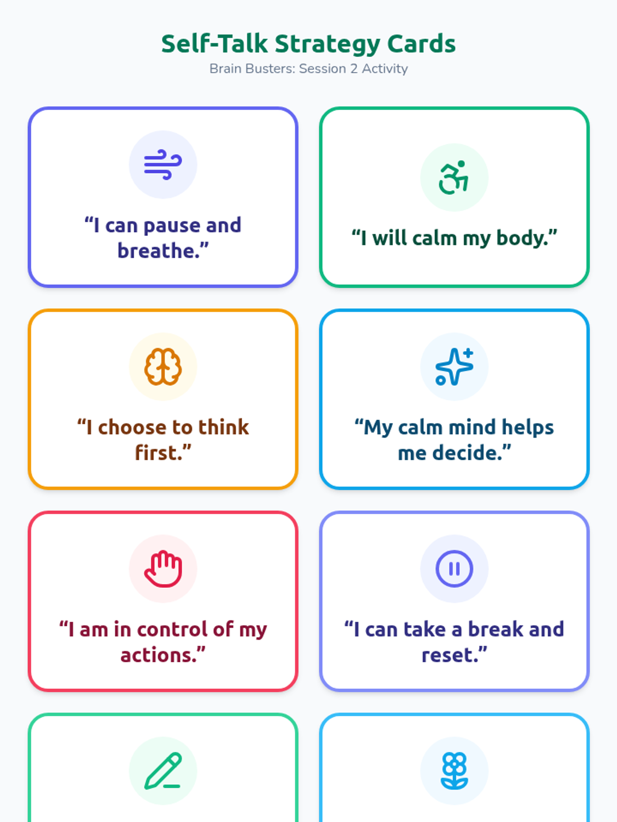 Teaches students to use positive internal dialogue (self-talk) to guide their reactions and reinforce the stop-and-think habit.