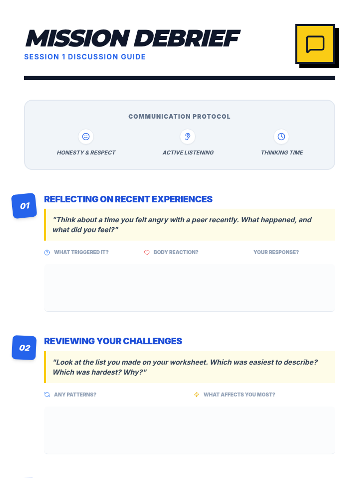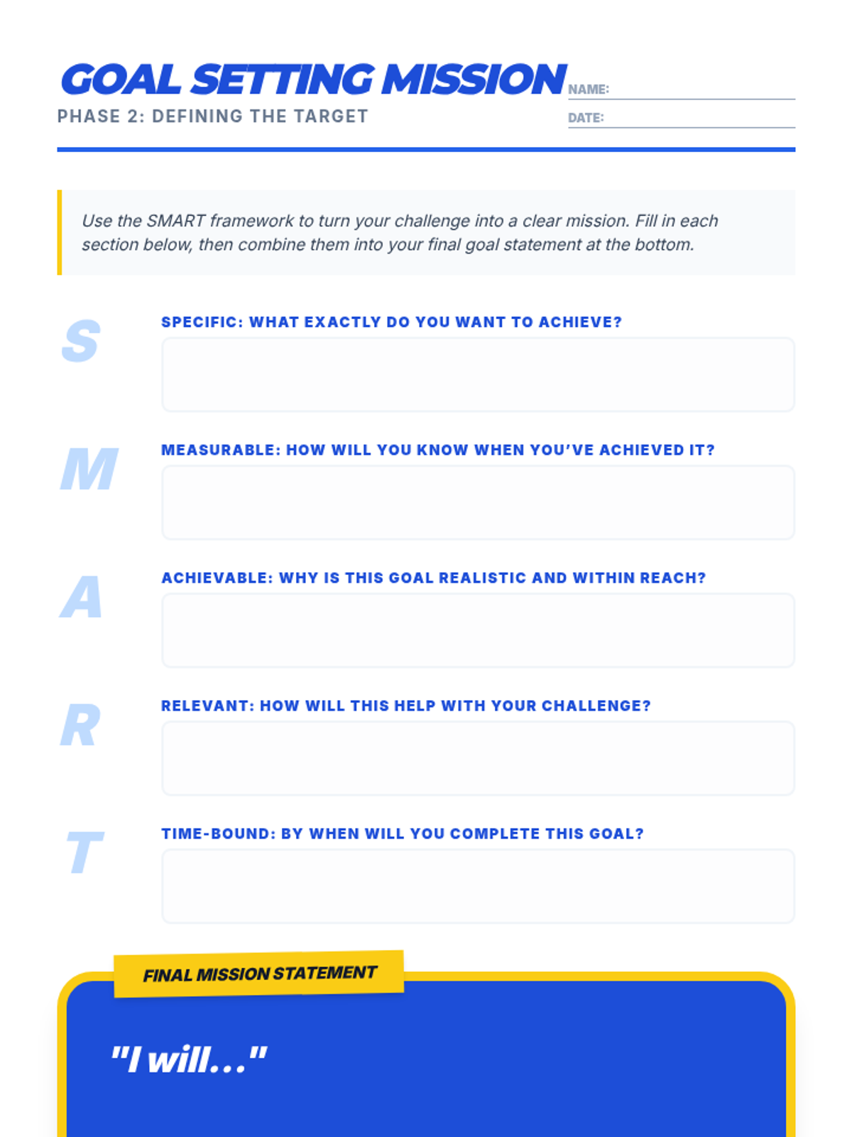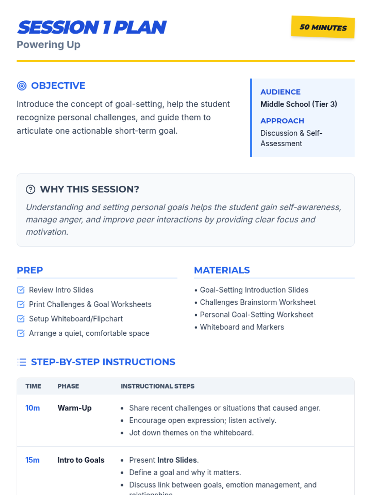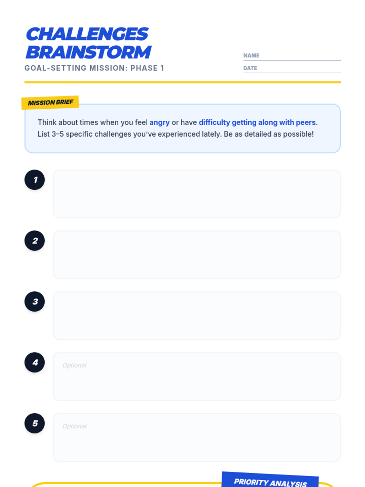 Introduces the concept of SMART goals and helps students identify personal challenges related to anger and peer interactions.