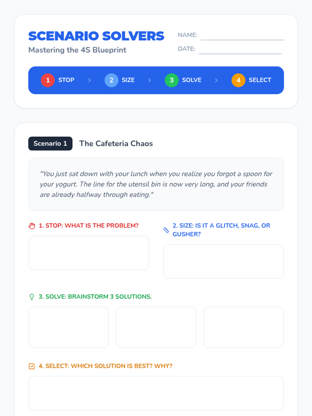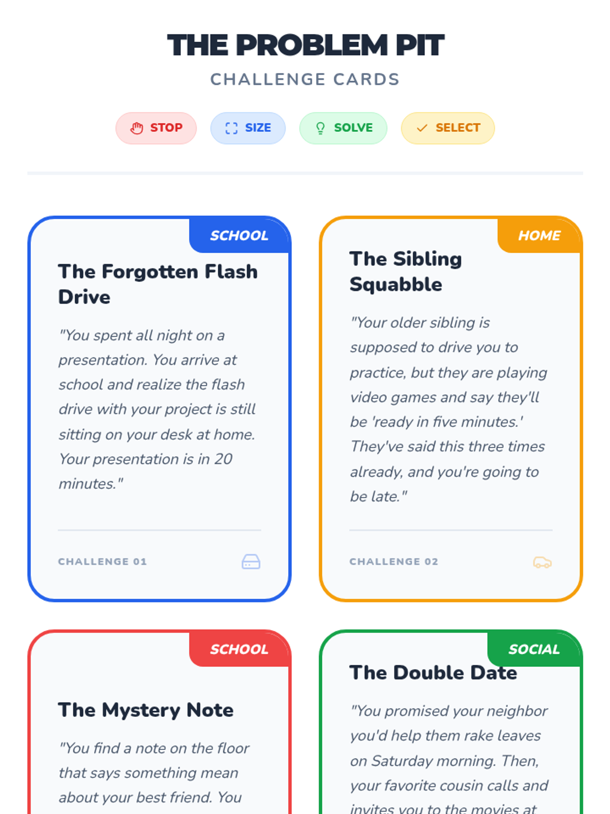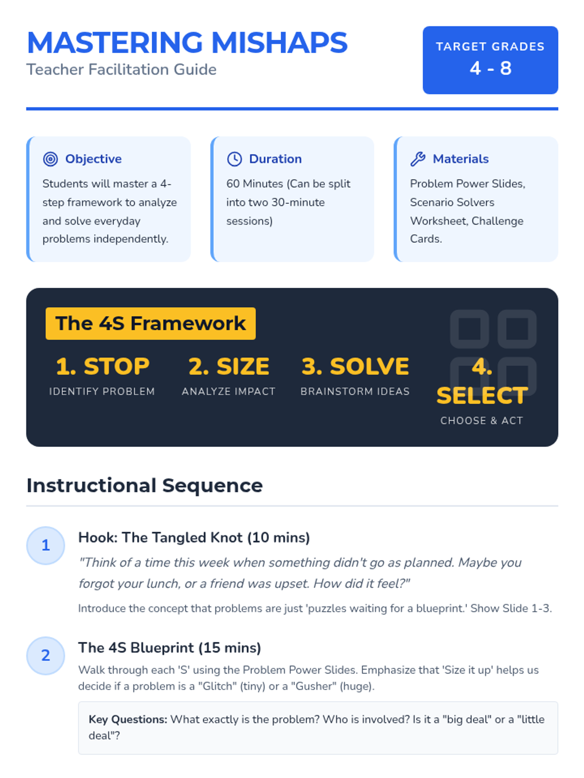 A comprehensive lesson teaching students a 4-step framework to identify, analyze, and solve common daily challenges at home and school.