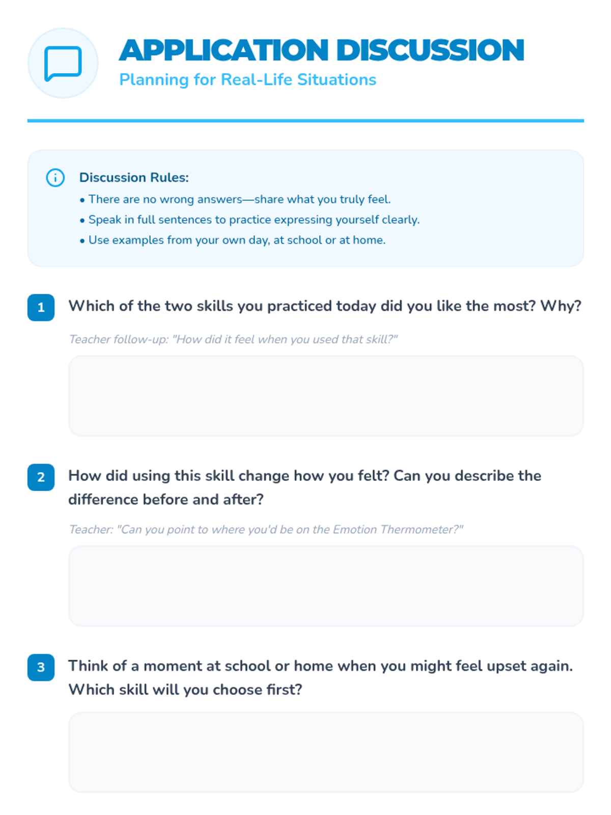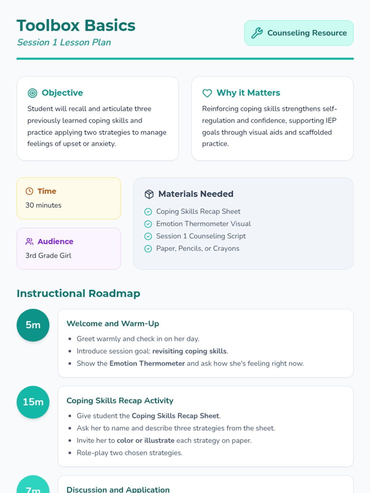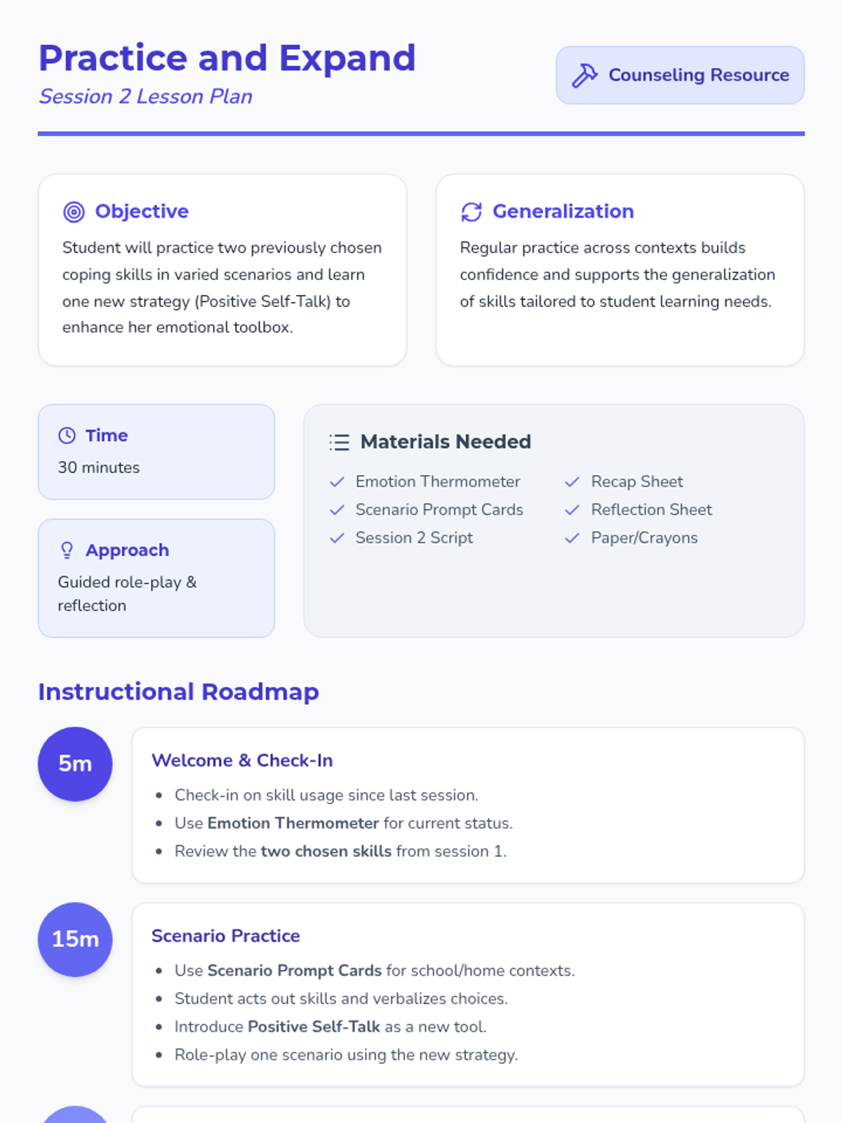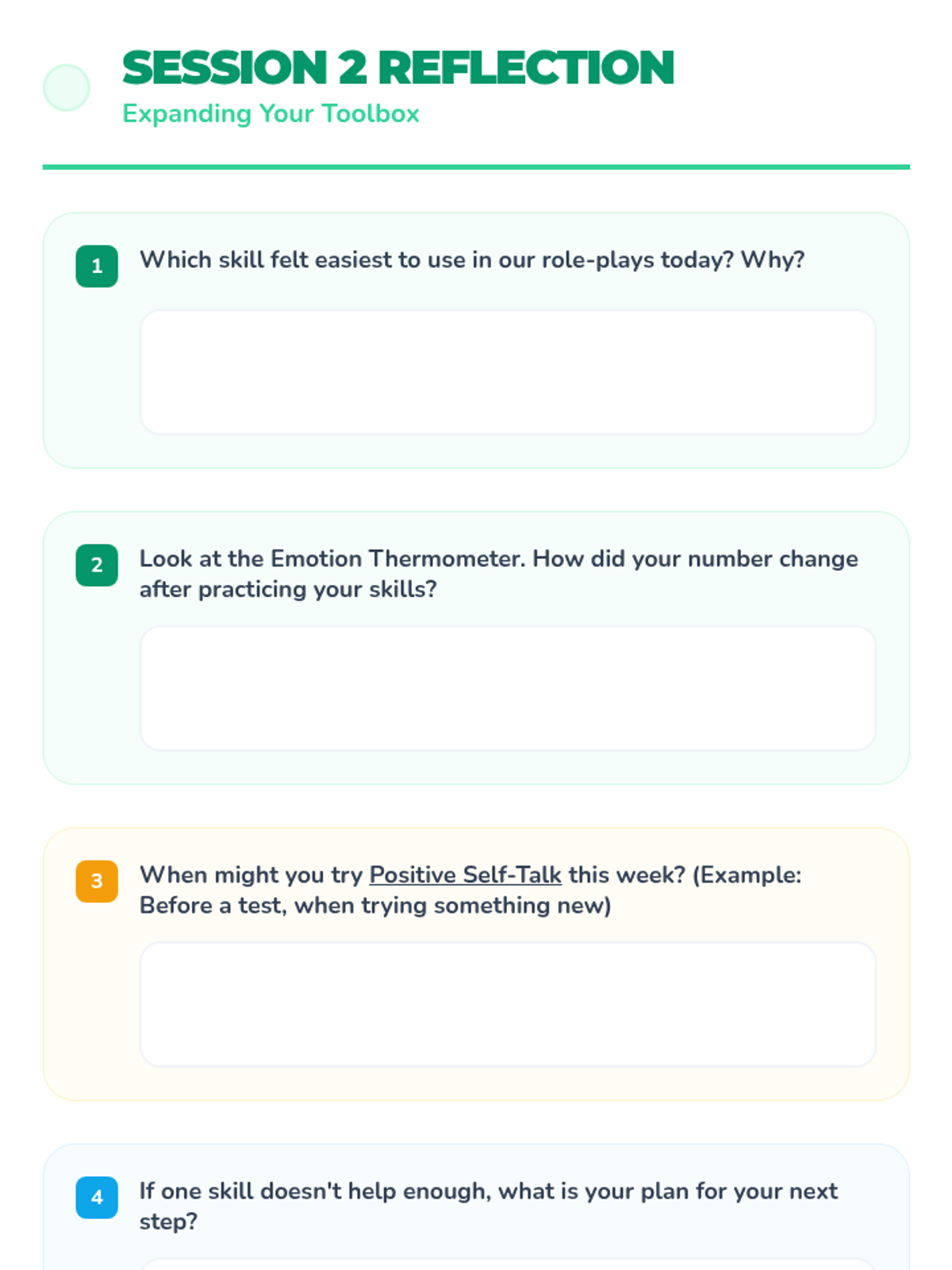Focuses on applying practiced coping skills to real-world scenarios and adding positive self-talk to the emotional toolbox.