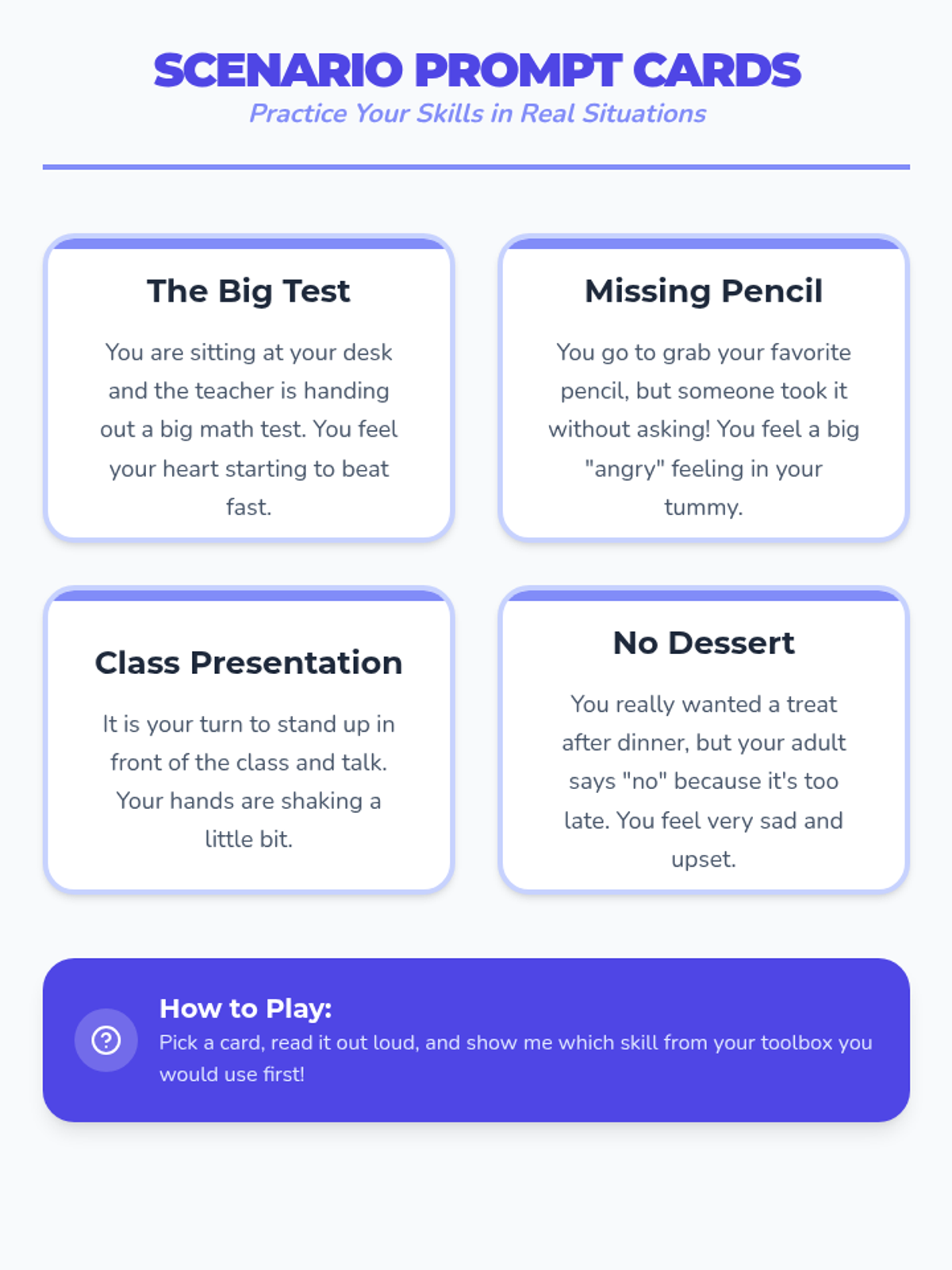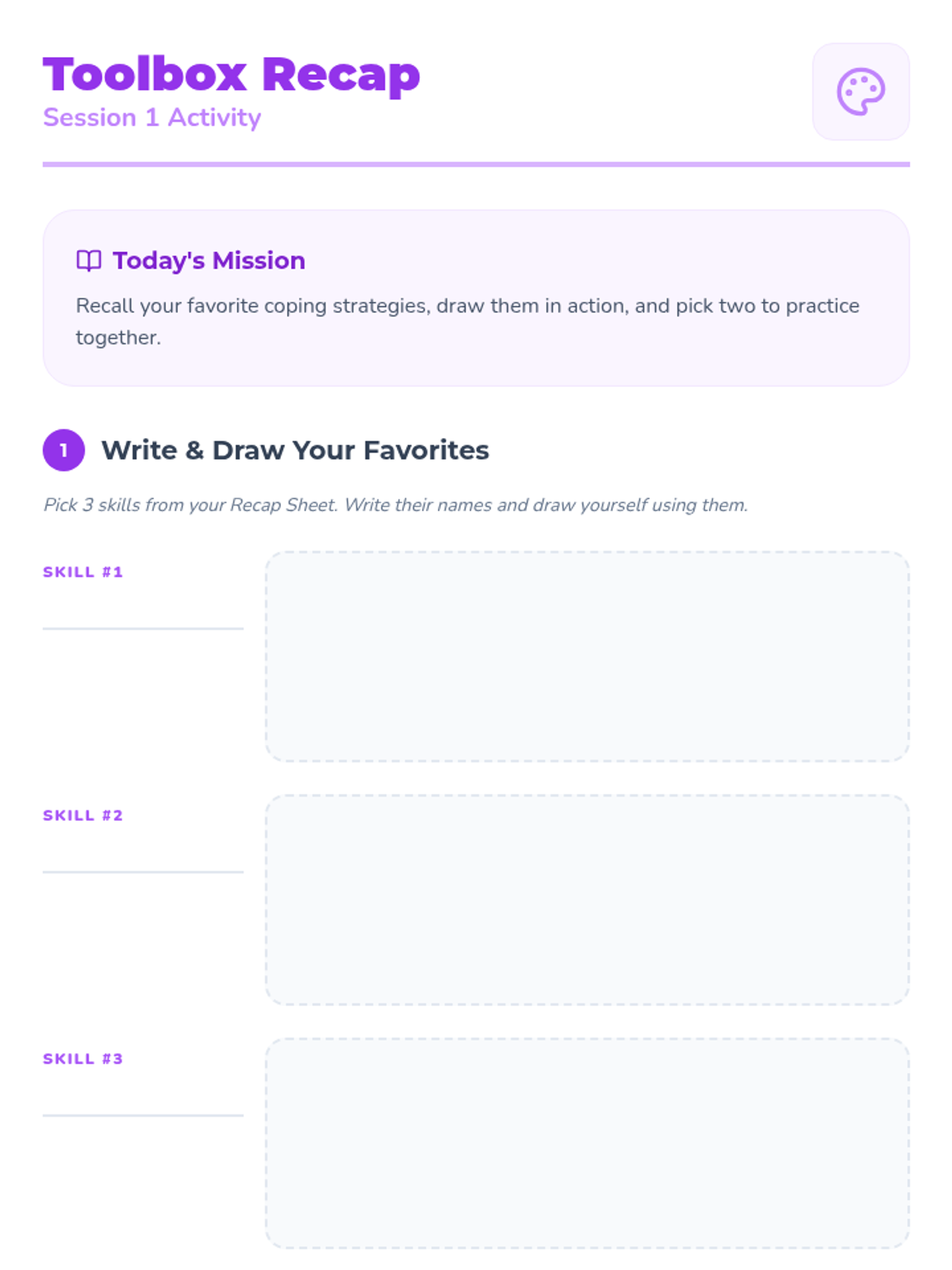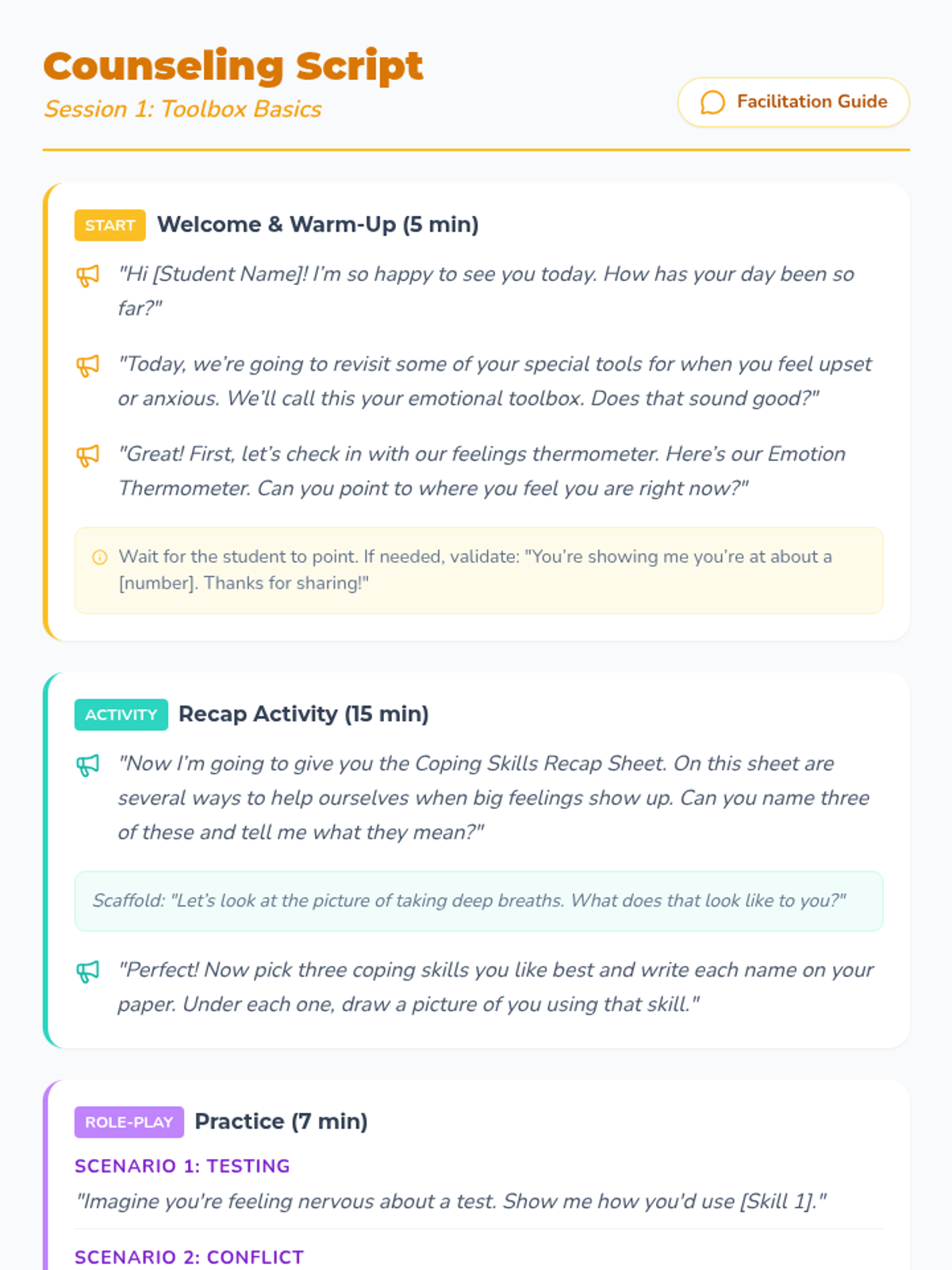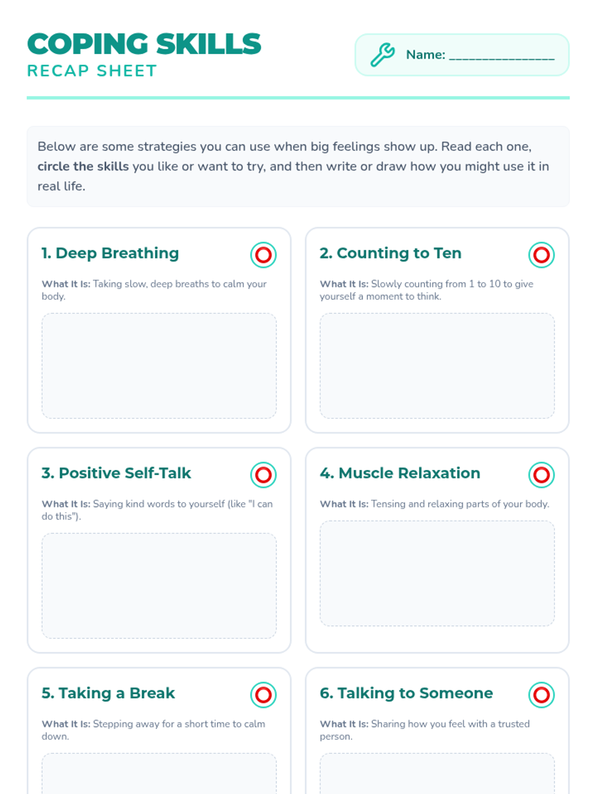 Focuses on applying practiced coping skills to real-world scenarios and adding positive self-talk to the emotional toolbox.