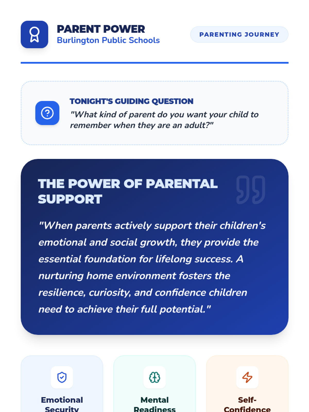 A supportive session for parents at Burlington Public Schools focused on enhancing parenting skills, self-care, and family relationships through the Parenting Journey program.