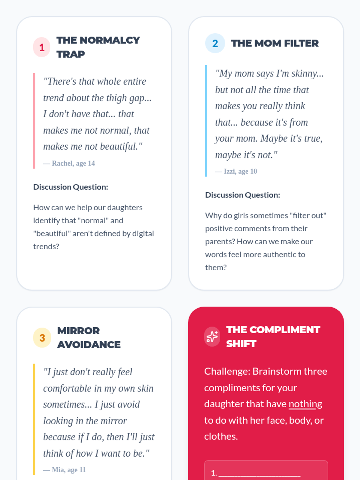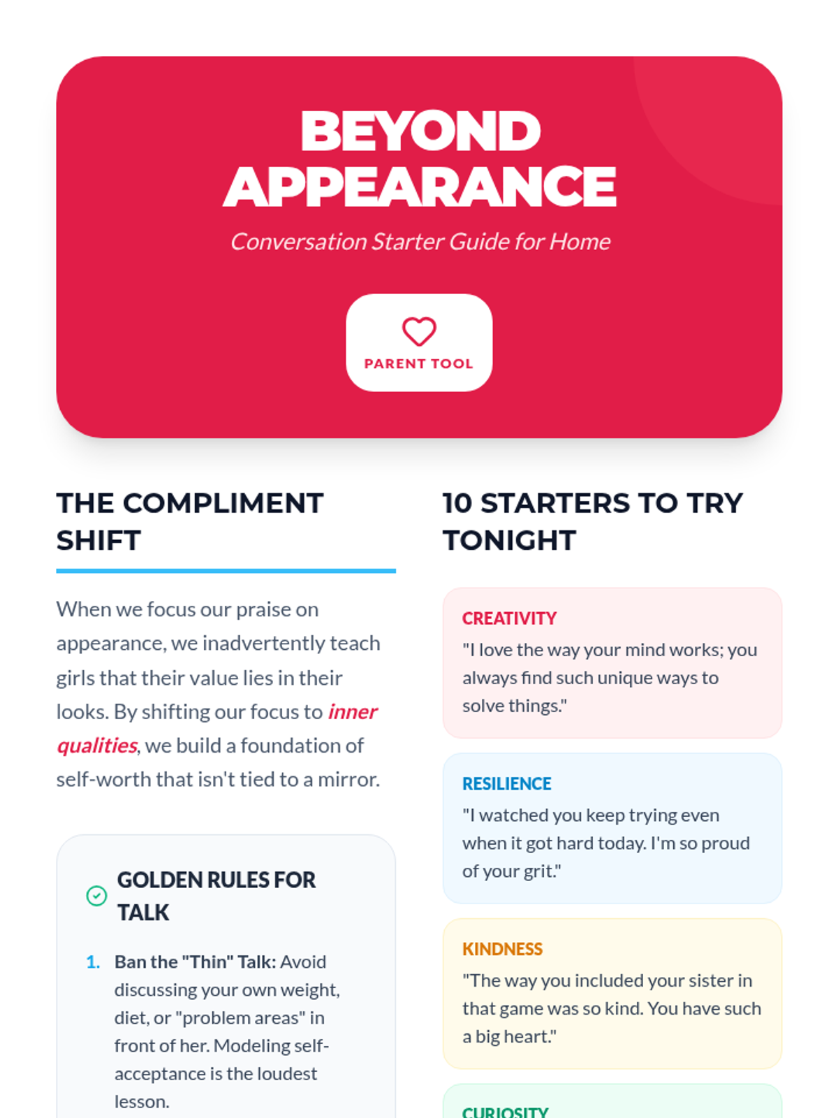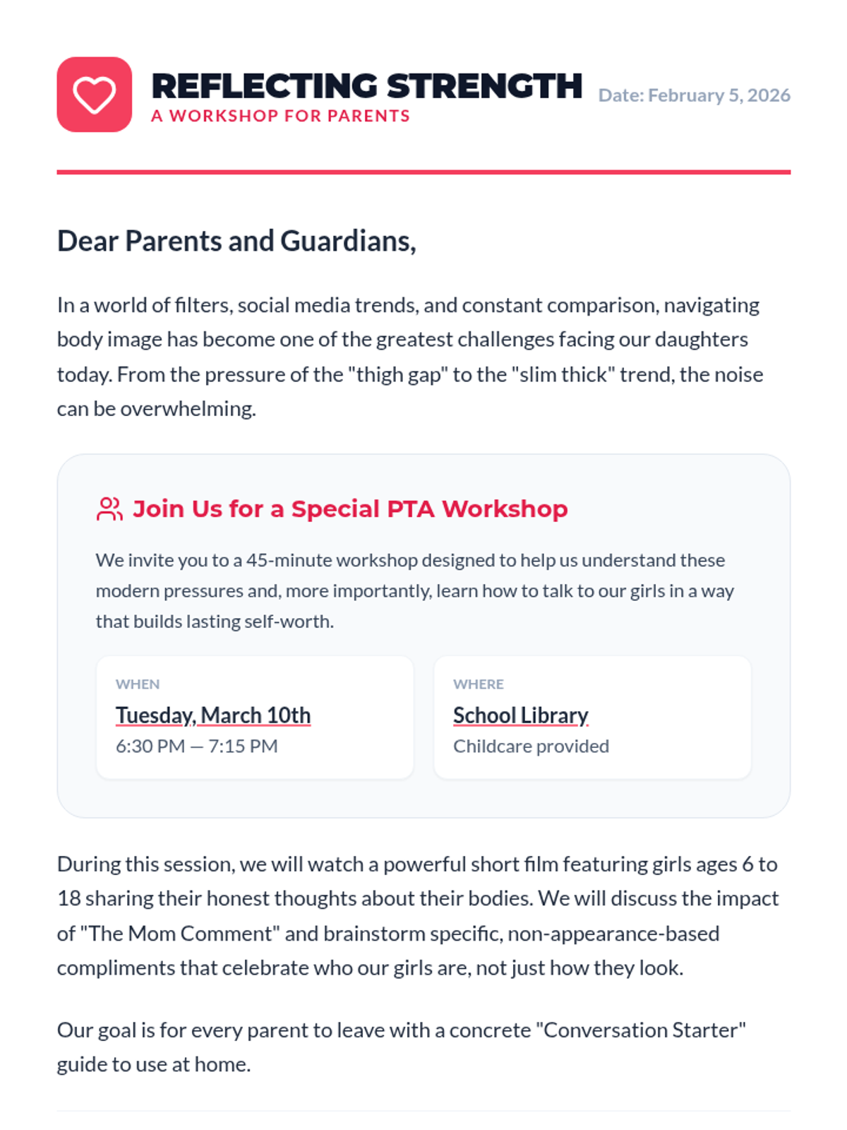 A comprehensive parent workshop designed for PTA meetings or community events. It explores the modern pressures on girls regarding body image and provides parents with actionable language and strategies to foster self-esteem and resilience in their daughters.
