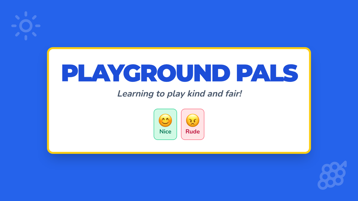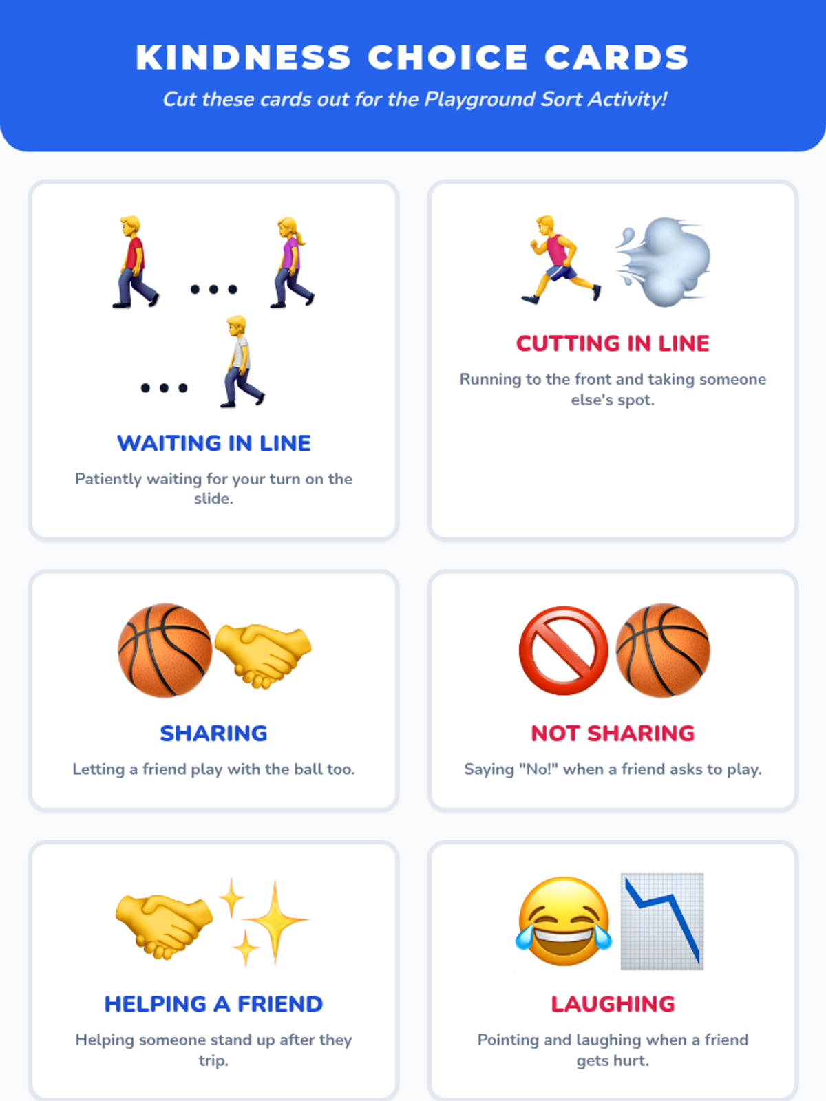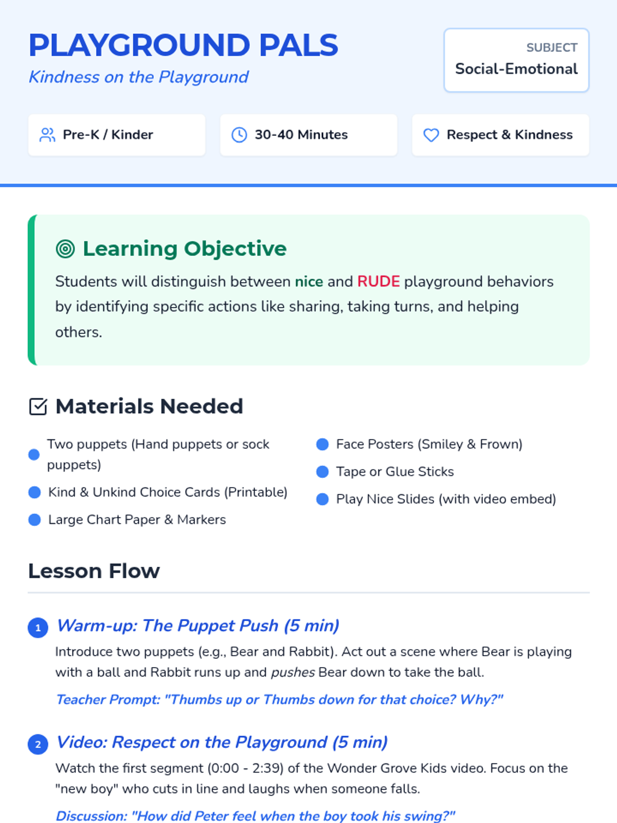 A Pre-K lesson focused on identifying kind and unkind behaviors on the playground using puppets, videos, and a sorting activity. Students learn the importance of sharing, waiting their turn, and helping others.
