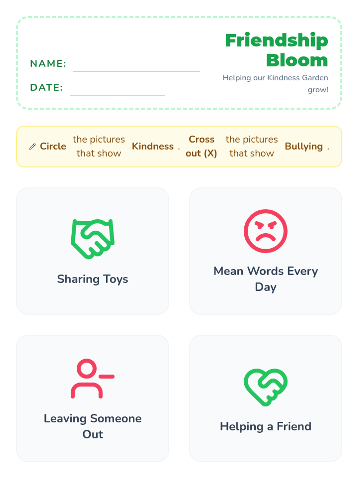 A gentle, 10-minute introduction to bullying for early childhood learners, focusing on identifying mean behaviors versus kind ones and knowing when to ask for help.