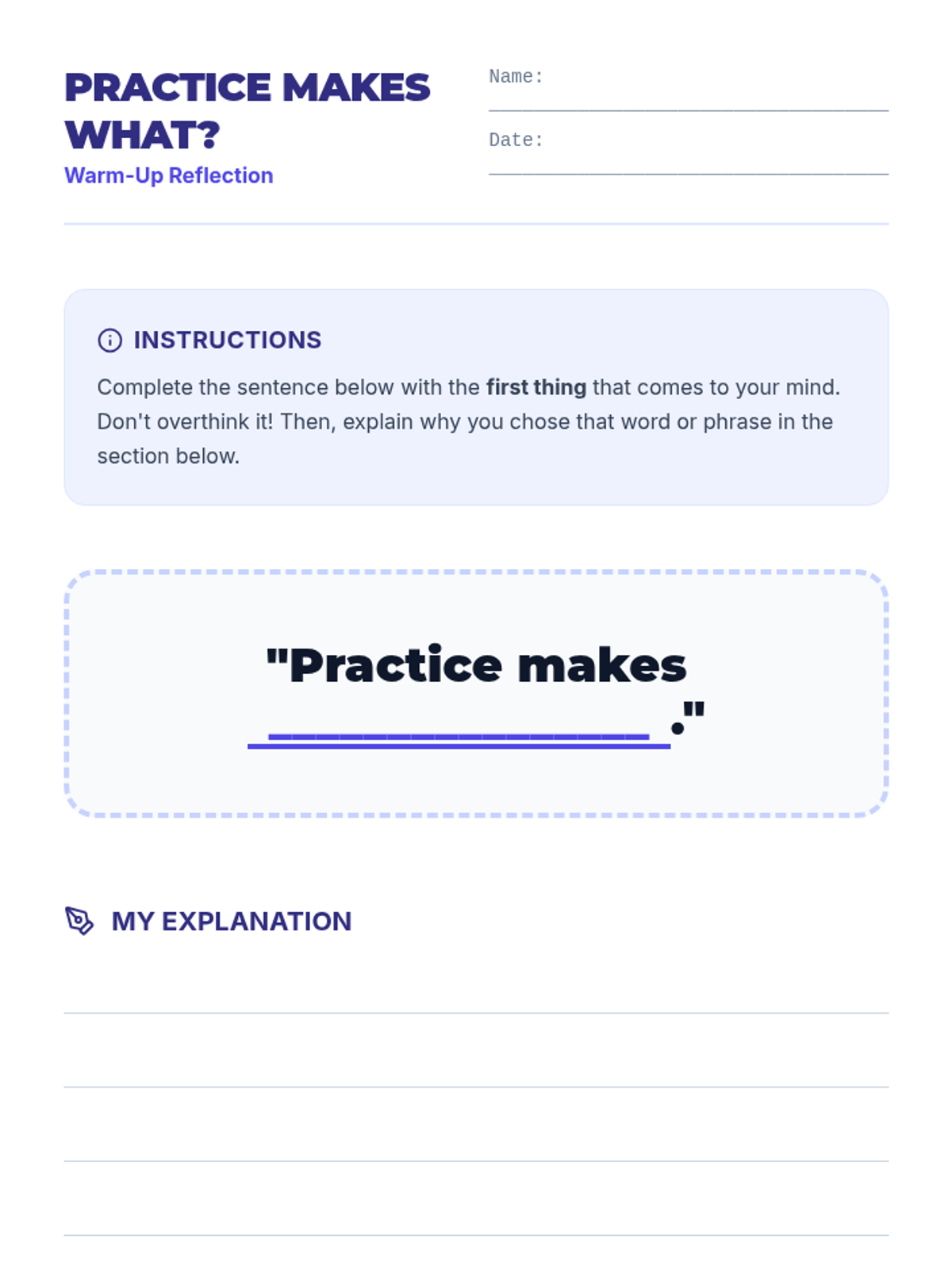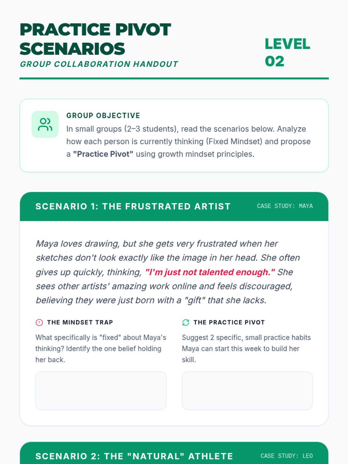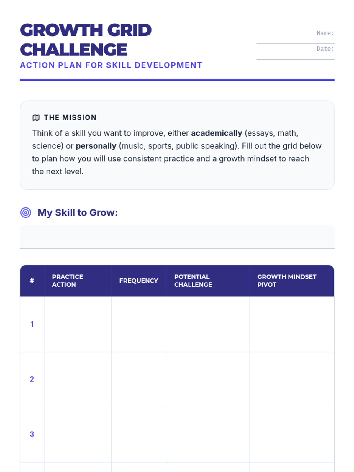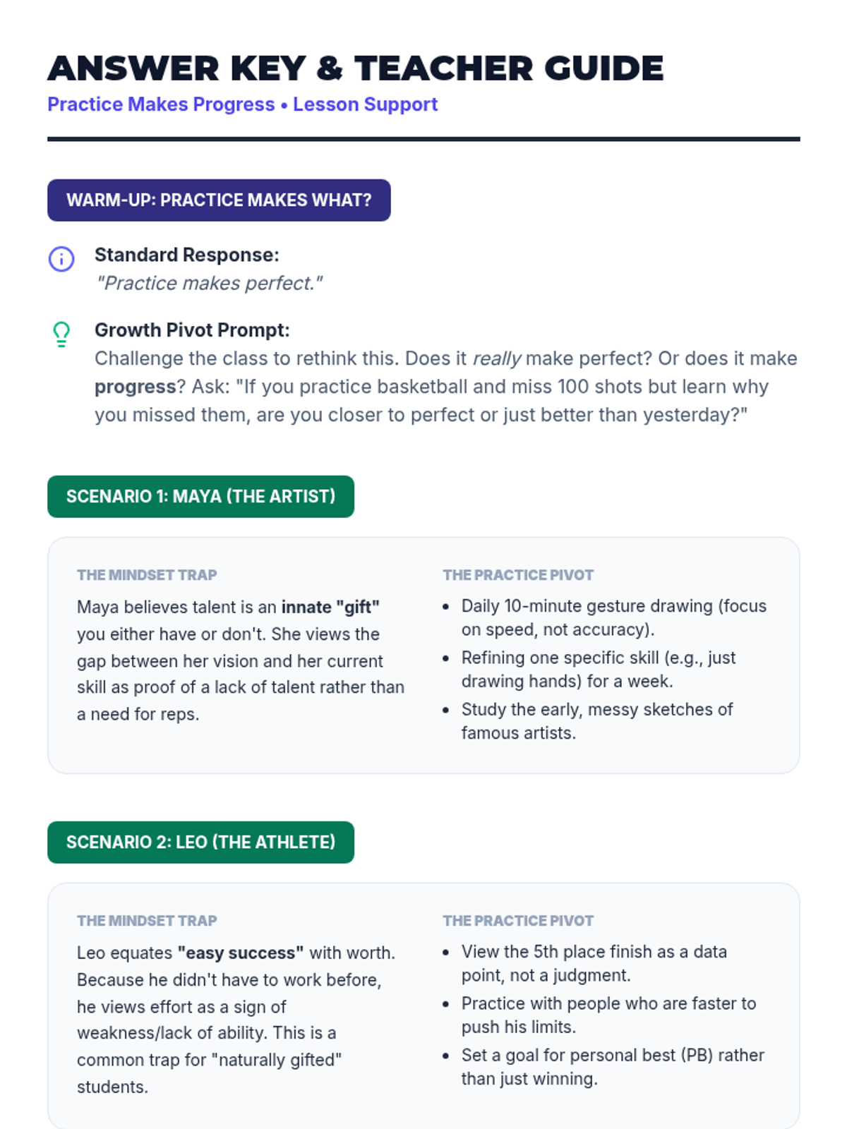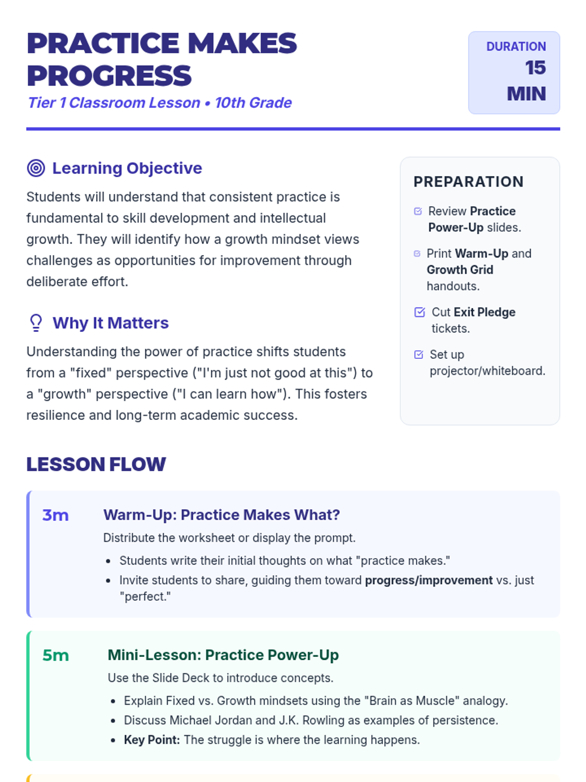 A 15-minute Tier 1 lesson for 10th-grade students exploring the connection between consistent practice and growth mindset, moving from 'I can't' to 'I can learn how.'