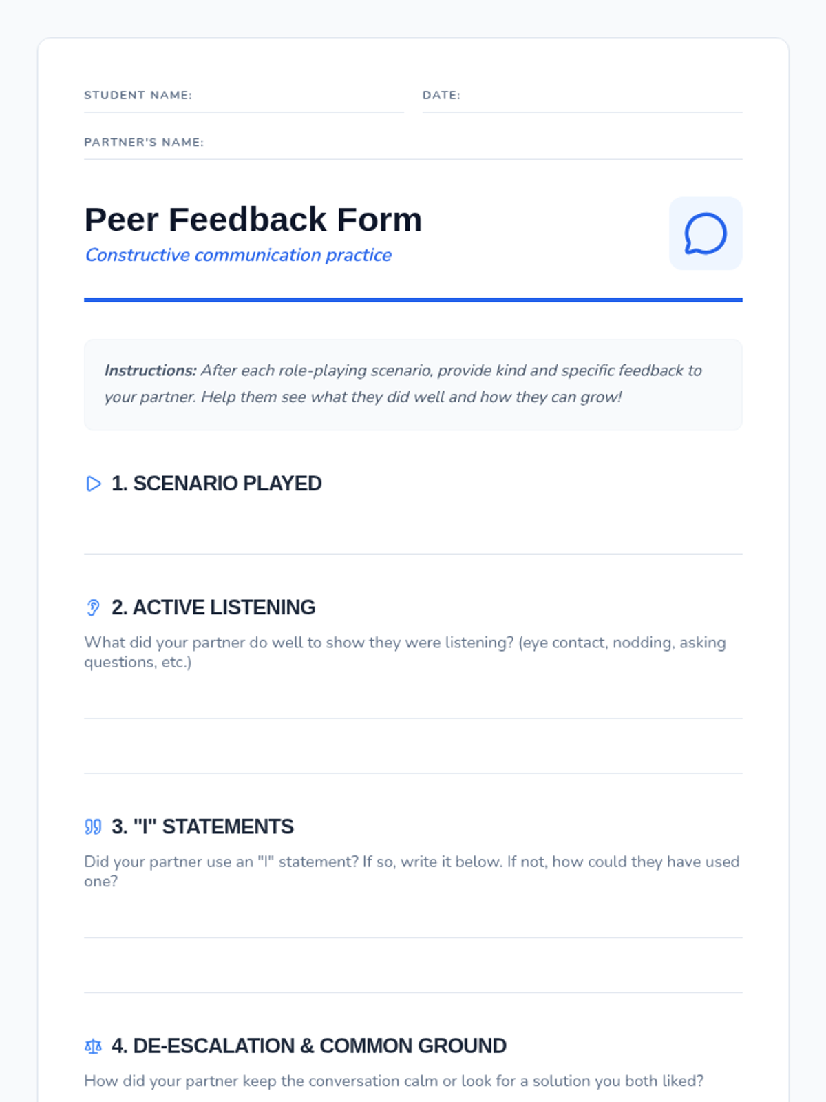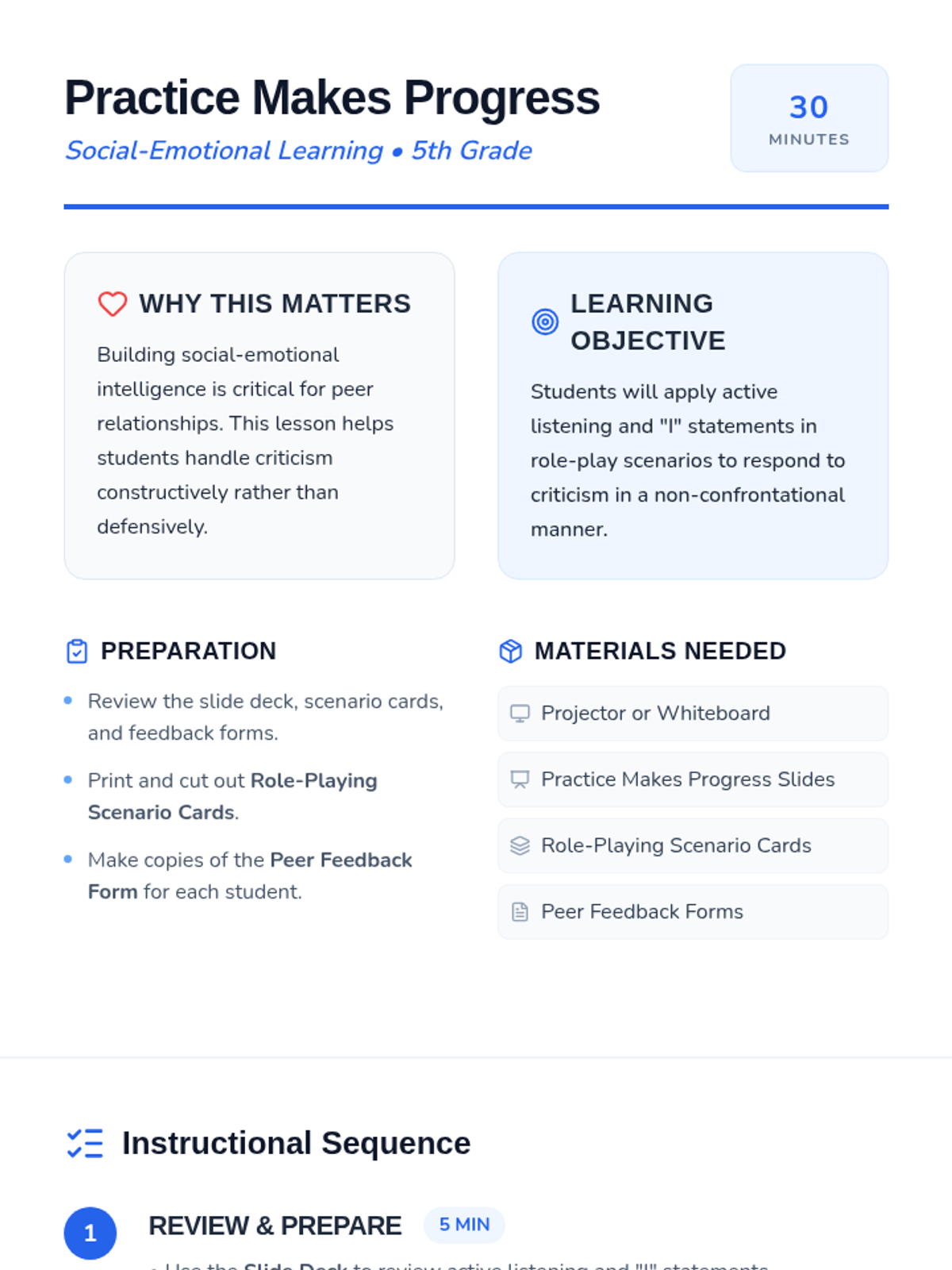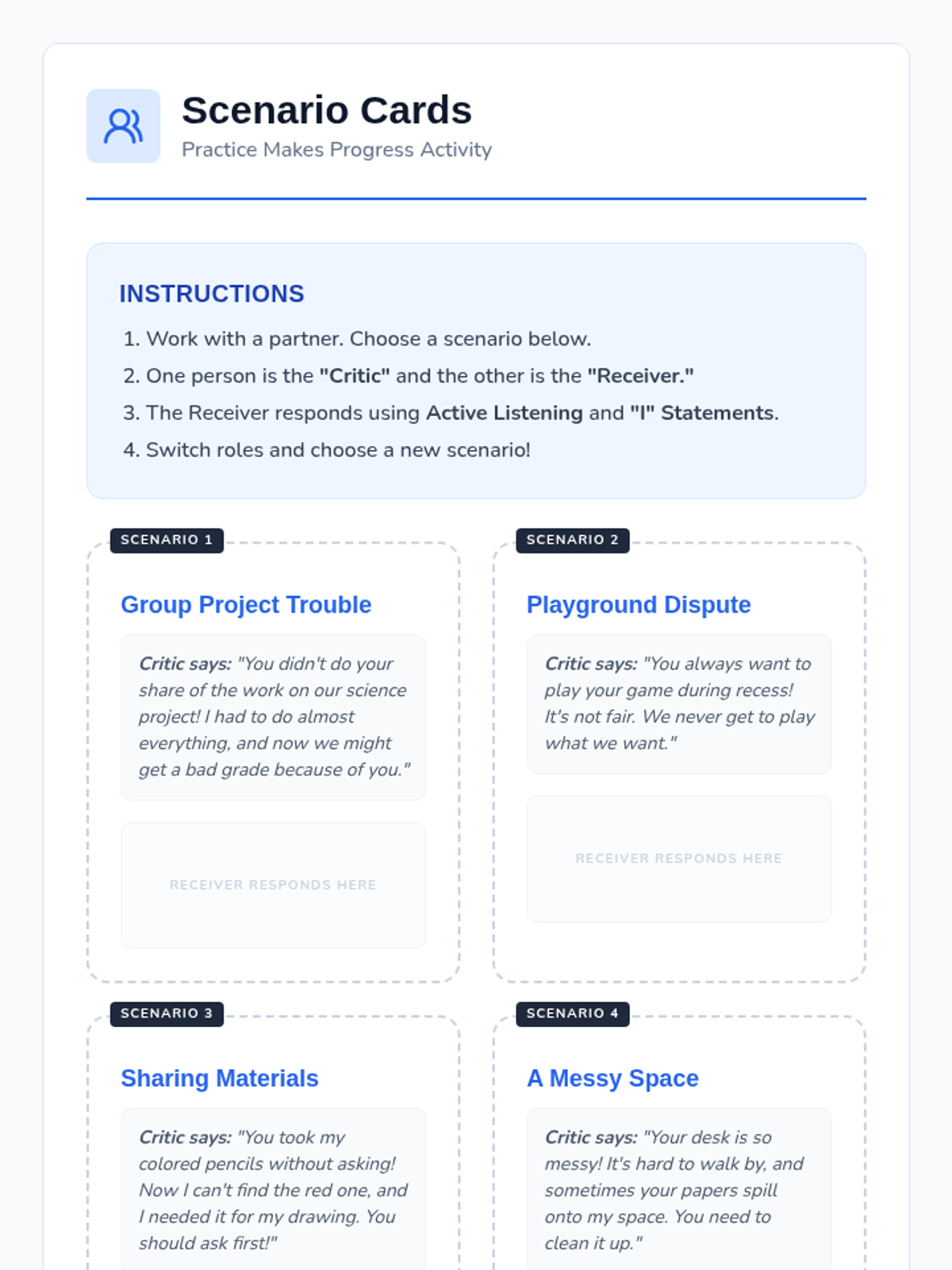 A 30-minute social-emotional learning lesson for 5th graders focused on active listening, 'I' statements, and constructive responses to criticism. Students engage in role-playing to practice de-escalation and finding common ground.
