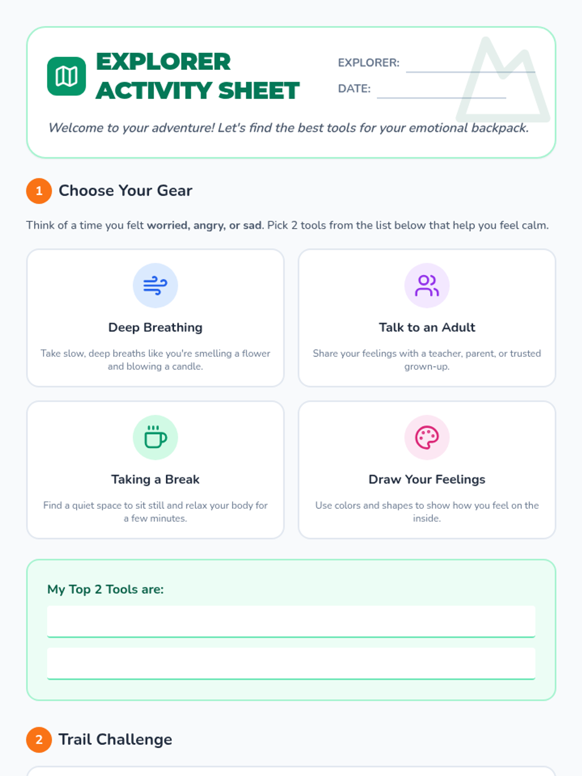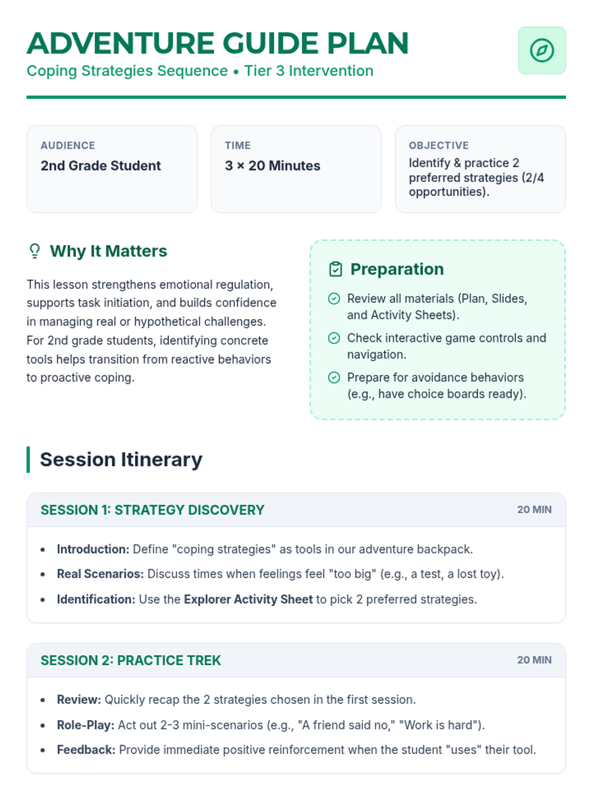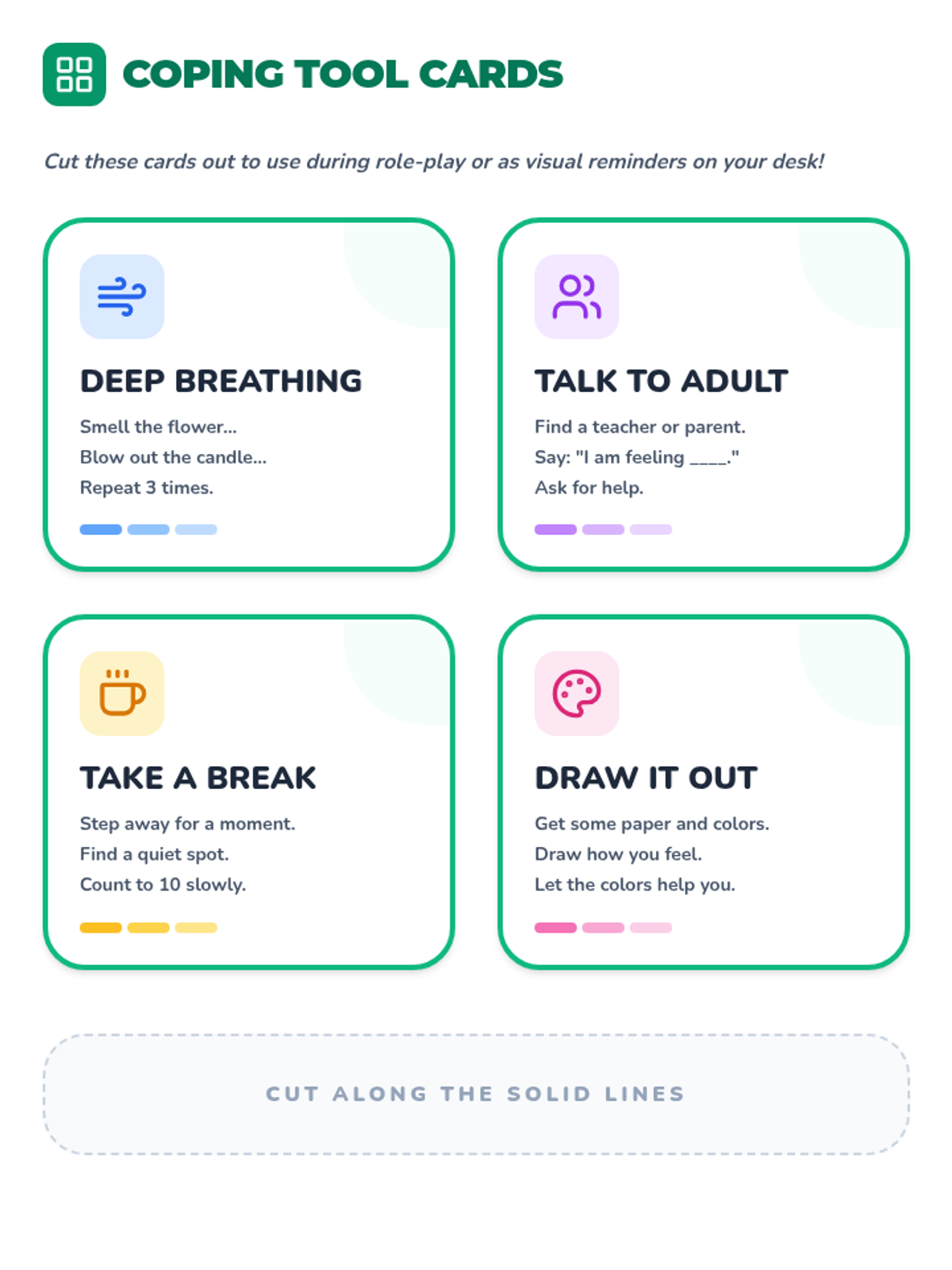 Students engage in guided practice and role-playing exercises to apply their chosen coping strategies to various common social and academic challenges.