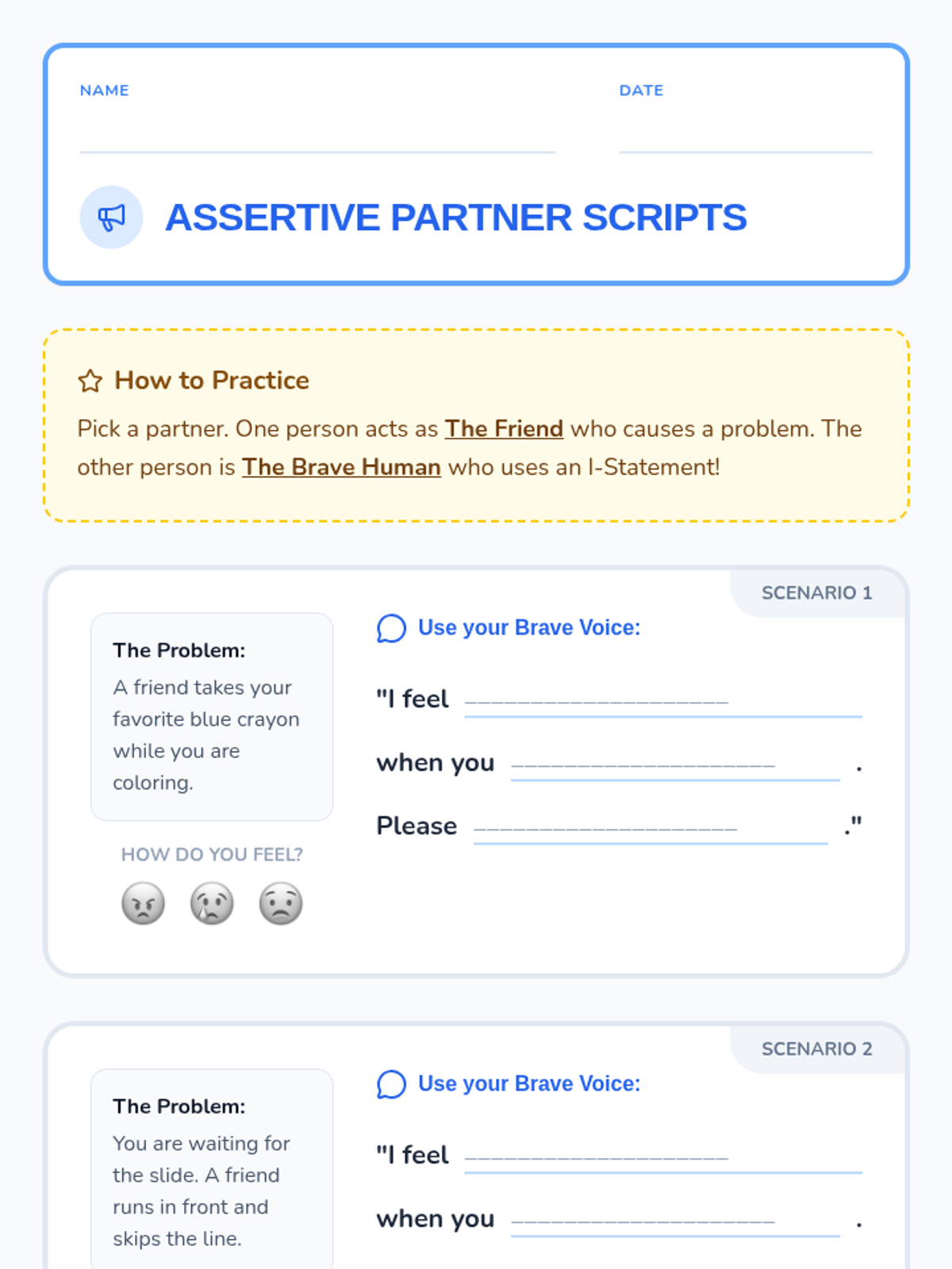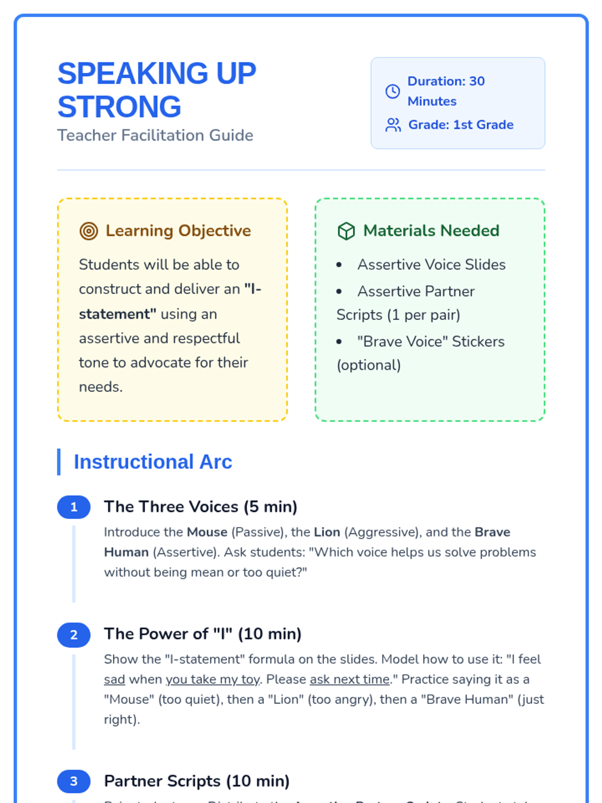 A 30-minute lesson for 1st graders focused on identifying and using assertive communication through 'I-statements'. Students will learn to distinguish between passive, aggressive, and assertive tones using relatable animal analogies and practice speaking up for themselves in common social scenarios.