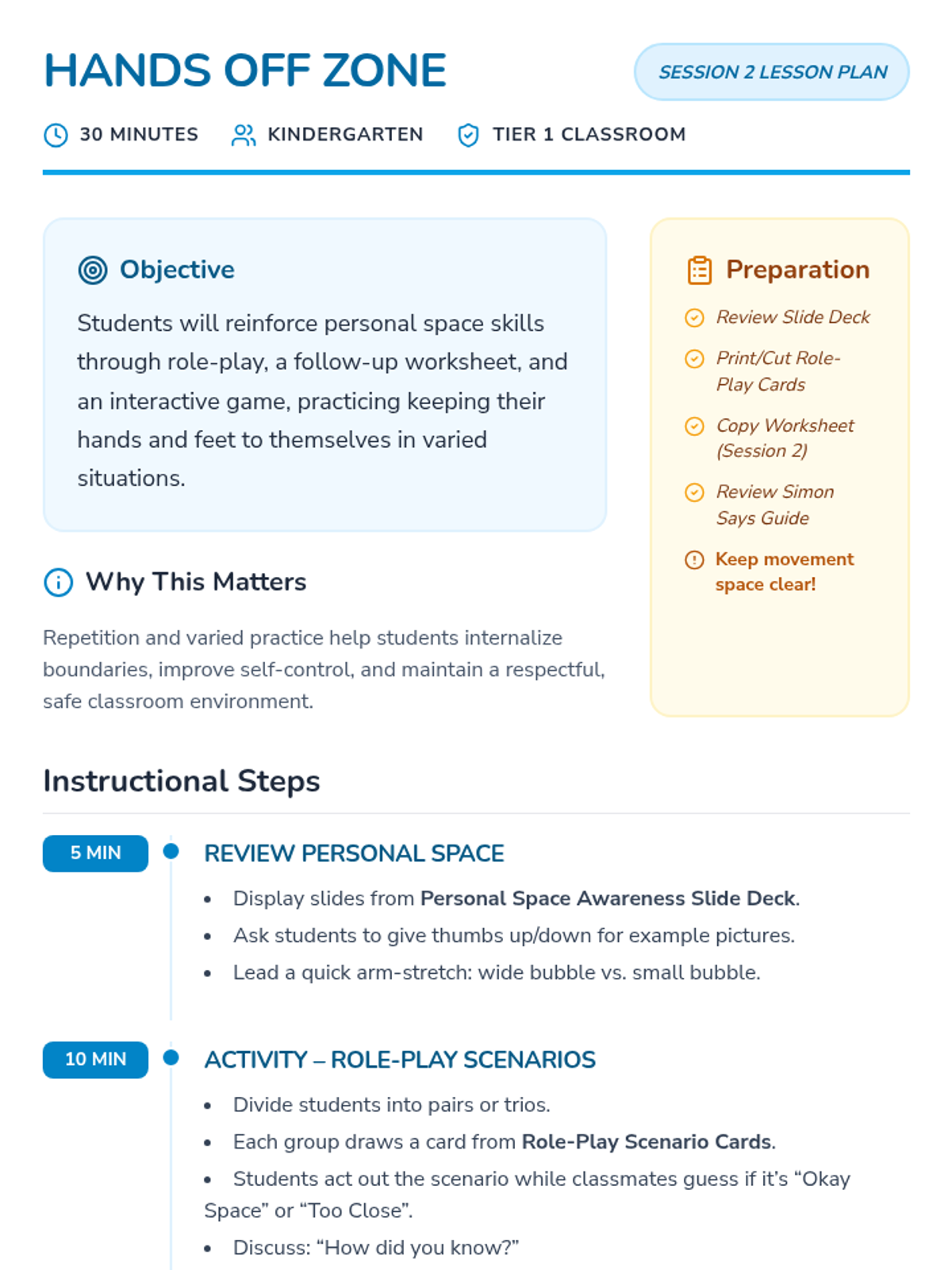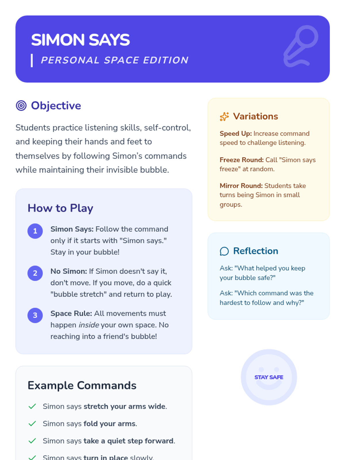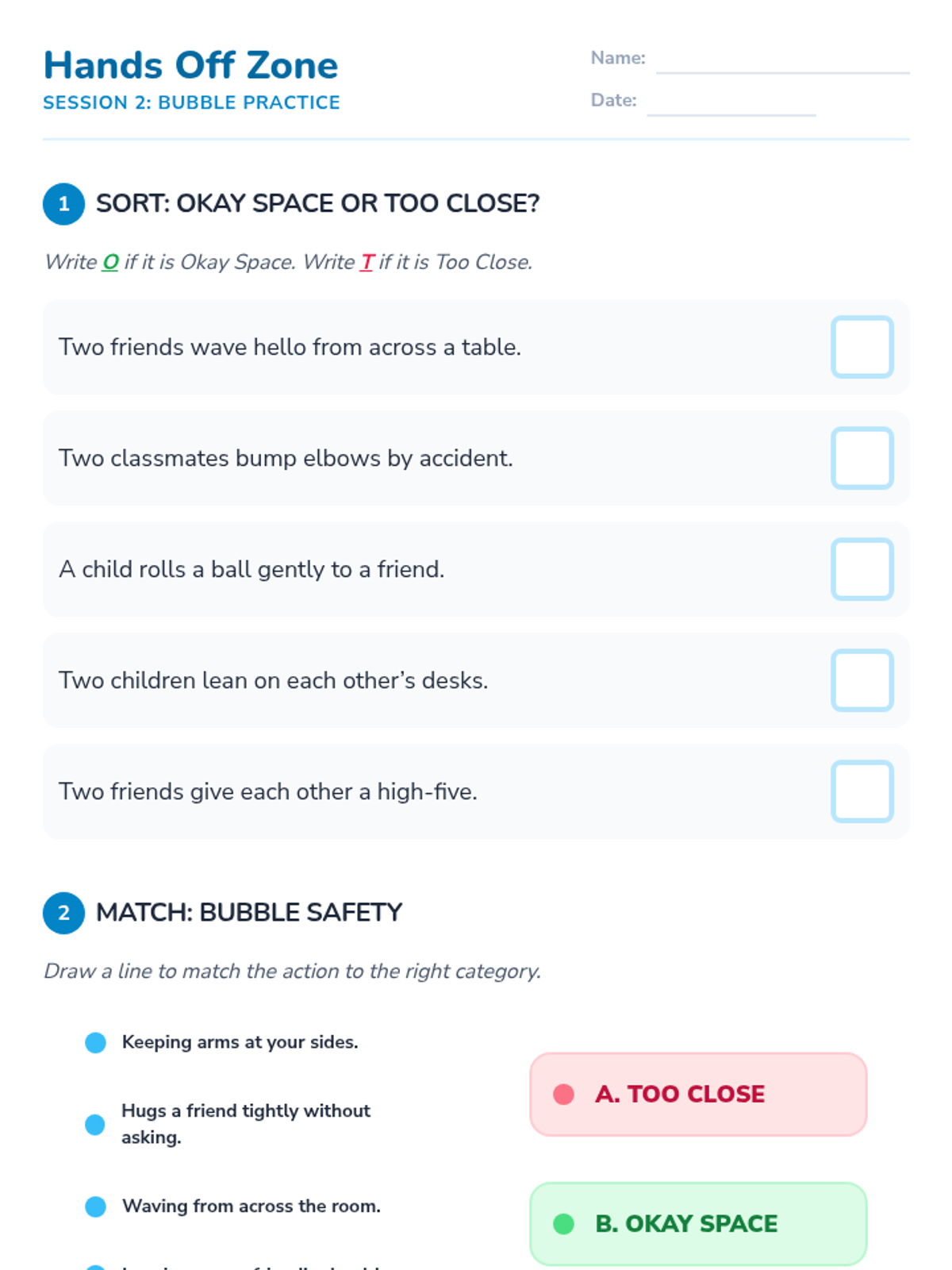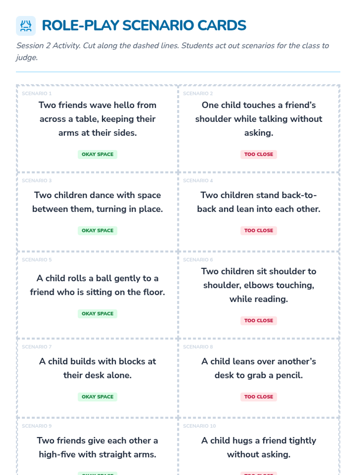 In the second session, students reinforce their understanding of boundaries through role-play scenarios, practice worksheets, and a themed game of Simon Says.