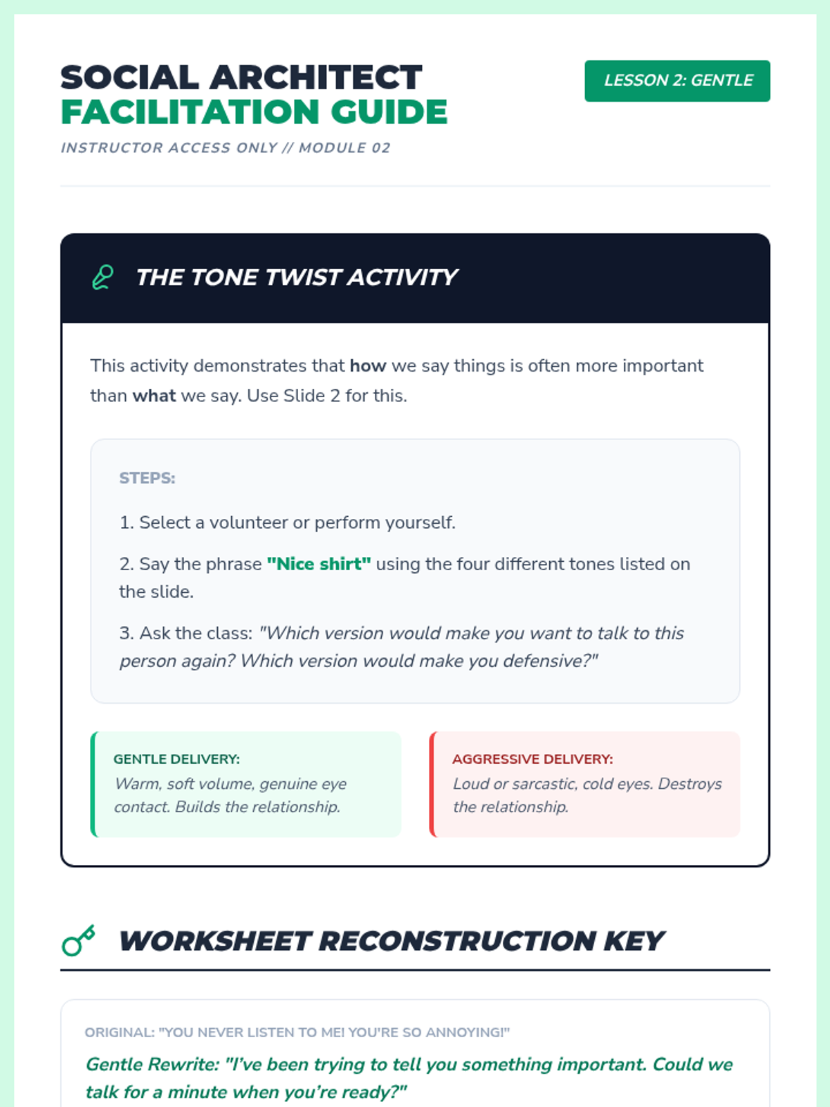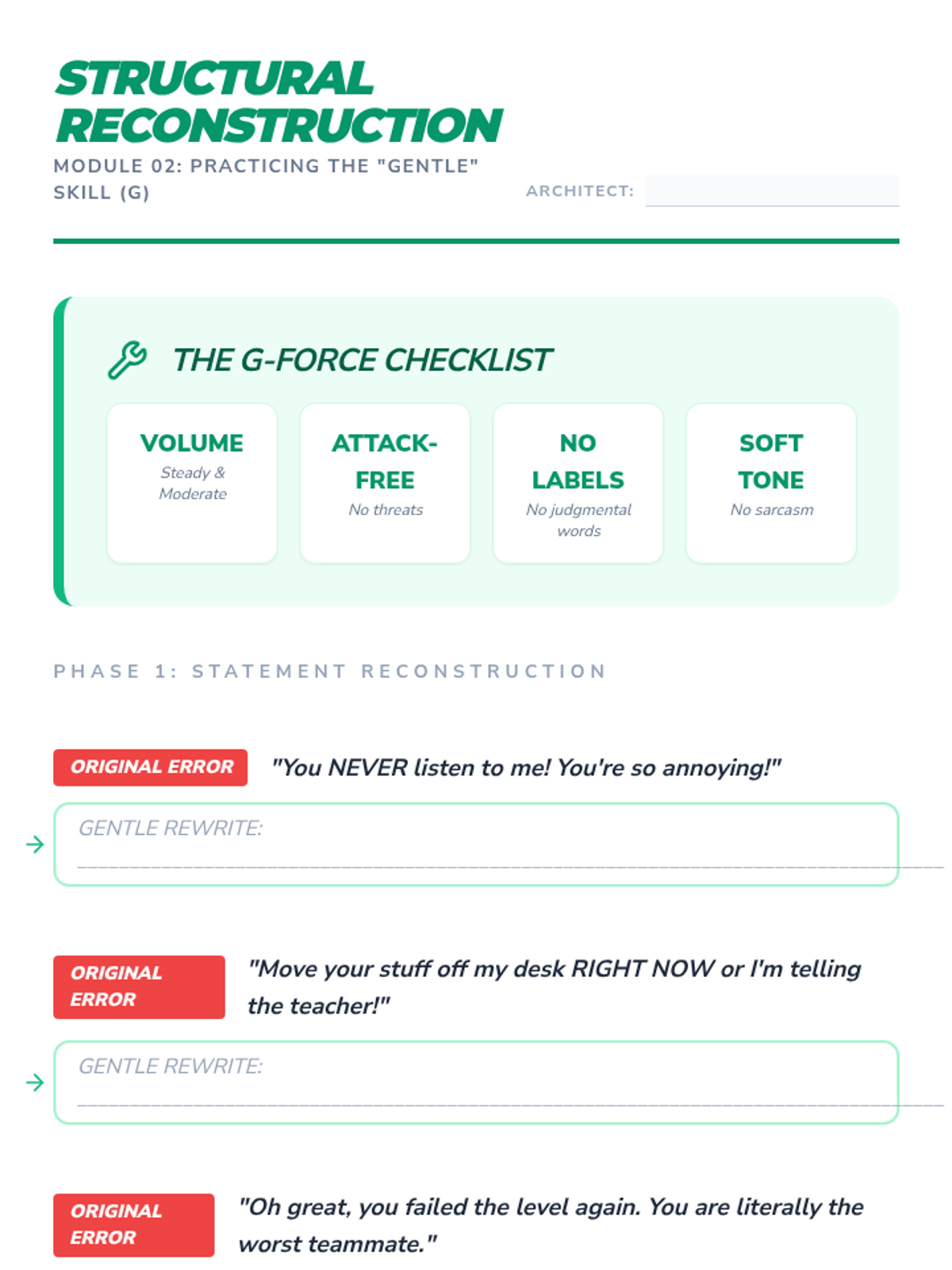 Focusing on the 'G' (Gentle), students examine how tone, volume, and word choice impact a listener's defensiveness. Activities include rewriting aggressive statements into gentle requests without losing the core message.