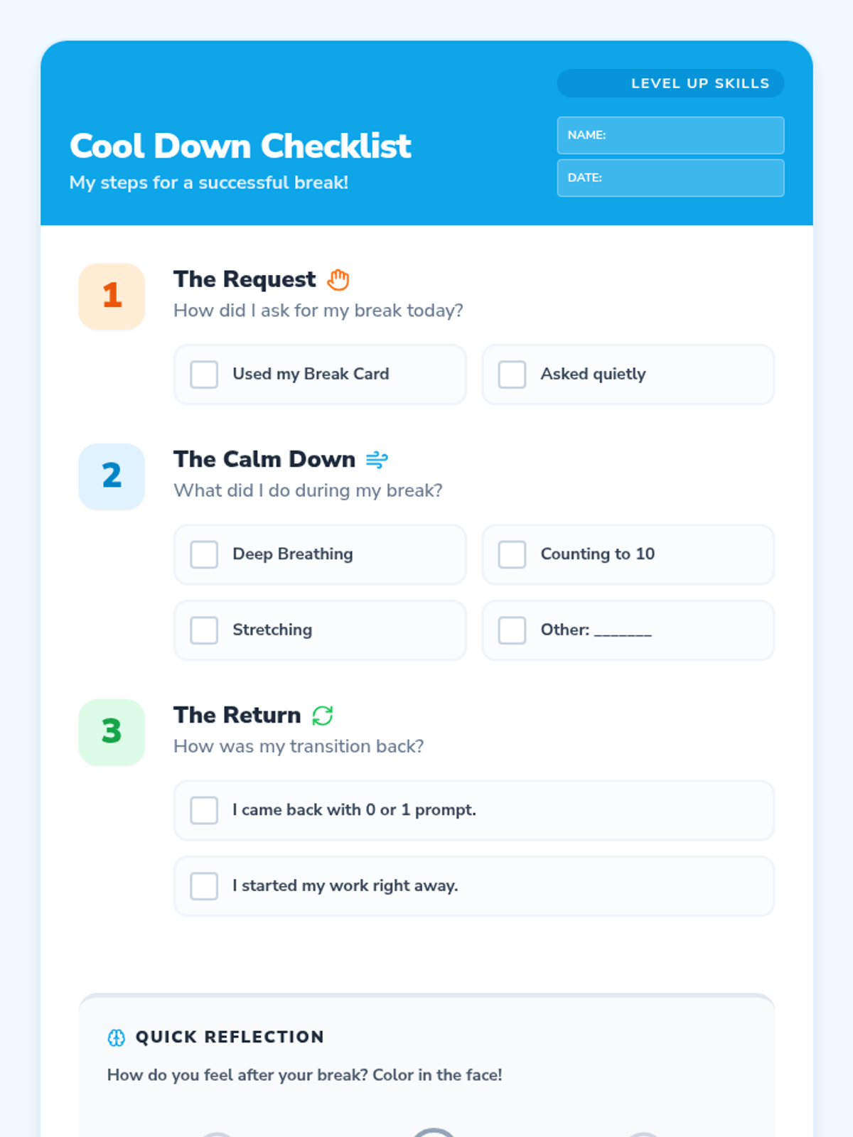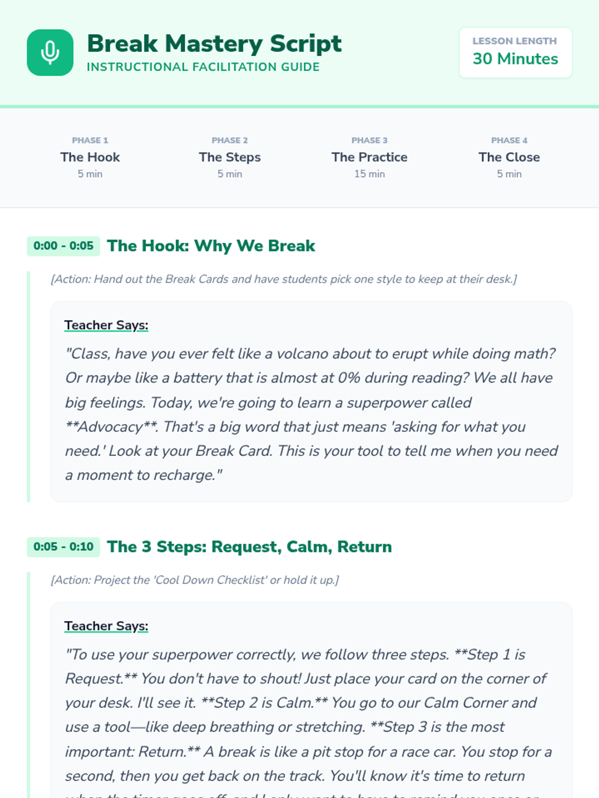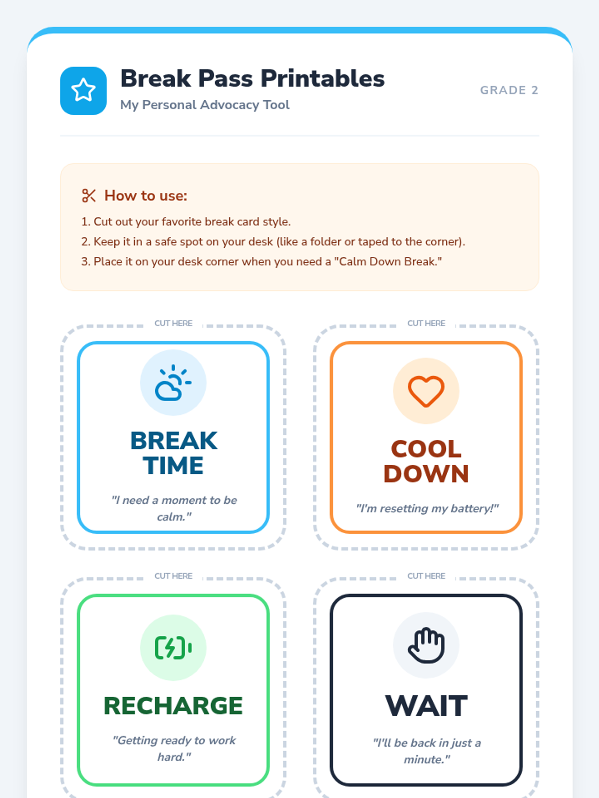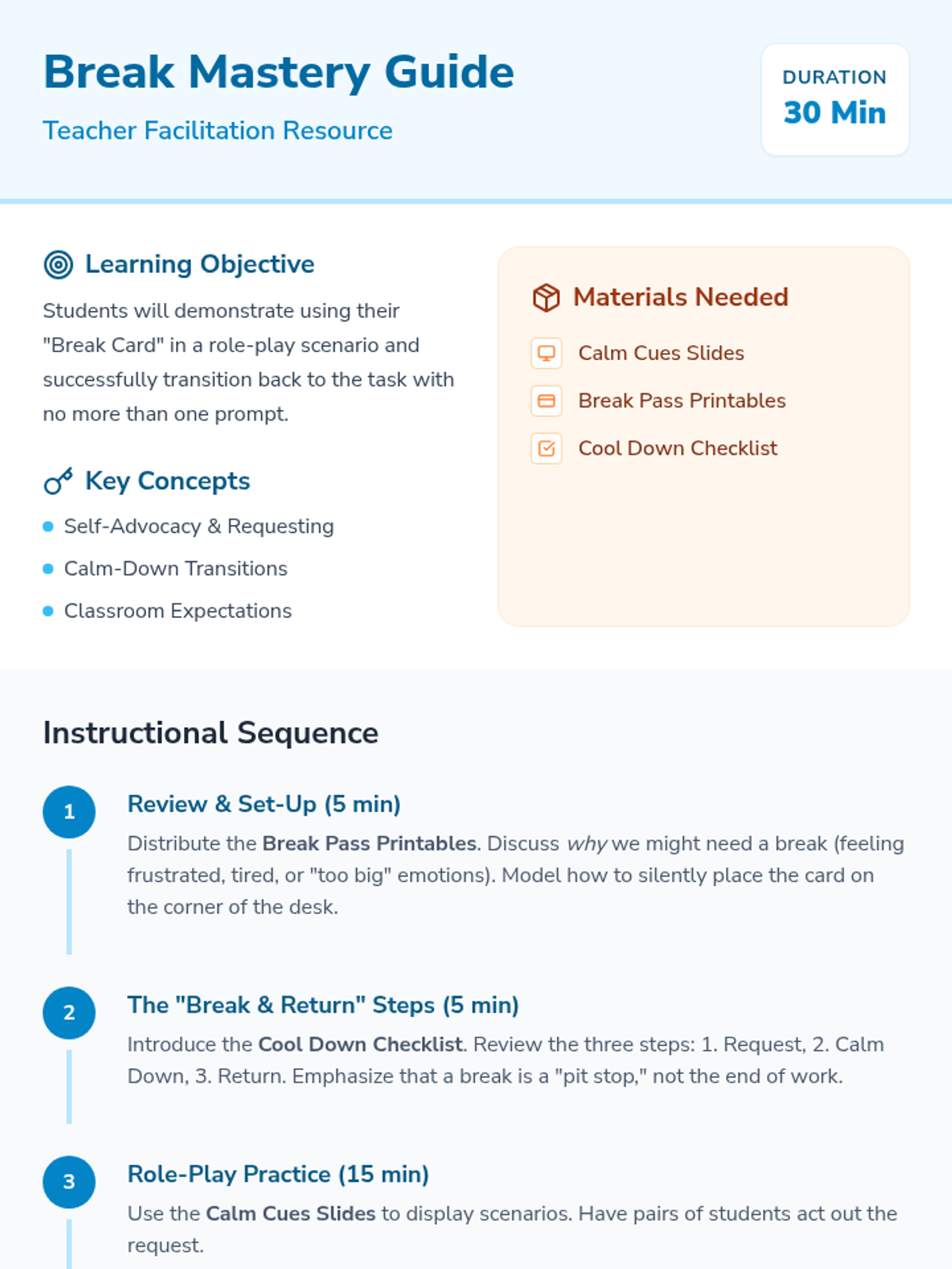 A 30-minute lesson for 2nd graders to learn and practice requesting a break and transitioning back to tasks effectively using a 'Break Card'.