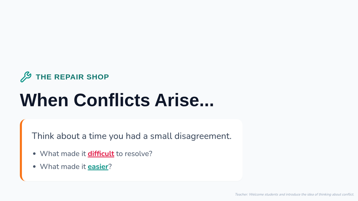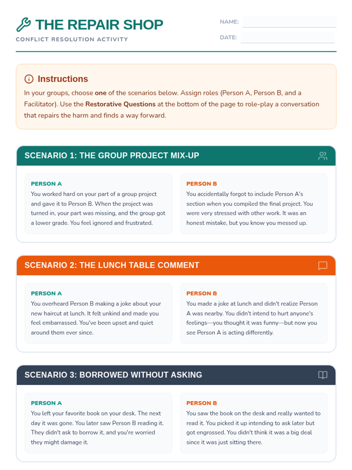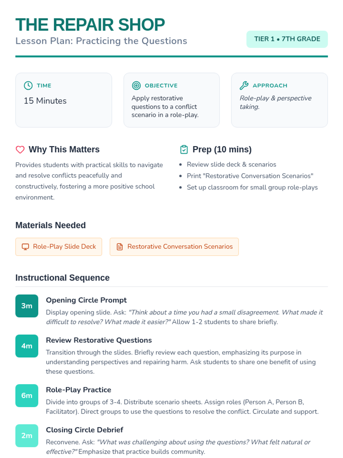 A quick, impactful 15-minute lesson for 7th graders to practice using restorative questions through role-play scenarios, focusing on perspective-taking and harm repair.