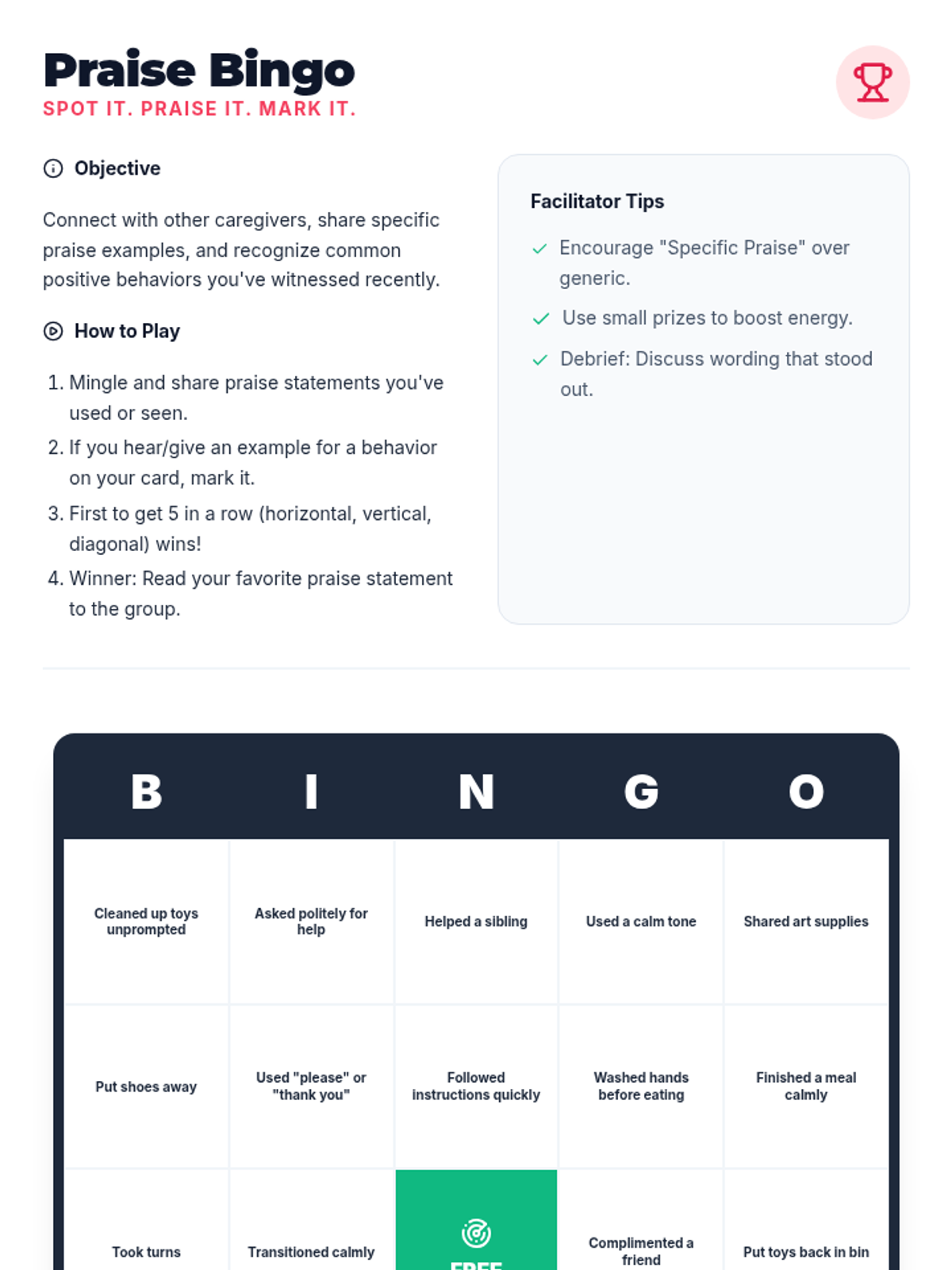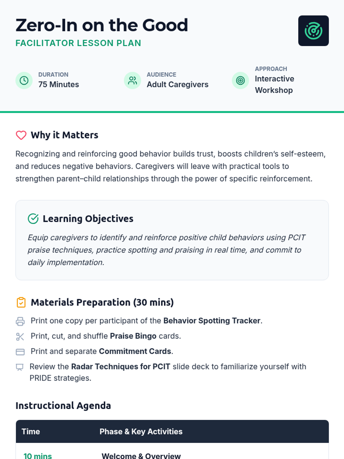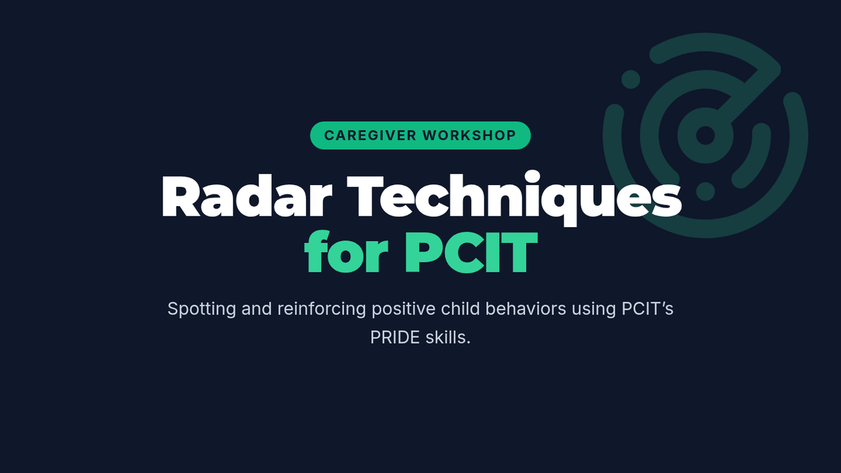 A 75-minute adult caregiver workshop focused on spotting and reinforcing positive child behaviors using PCIT techniques. Participants will learn the PRIDE framework and practice specific praise to strengthen relationships.