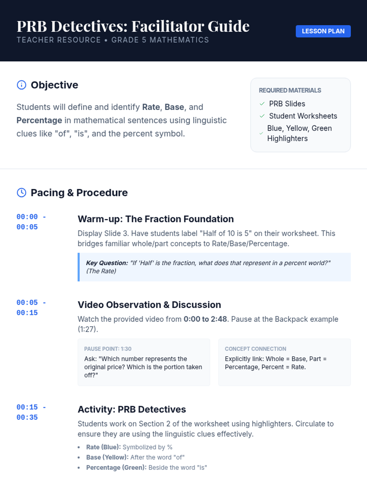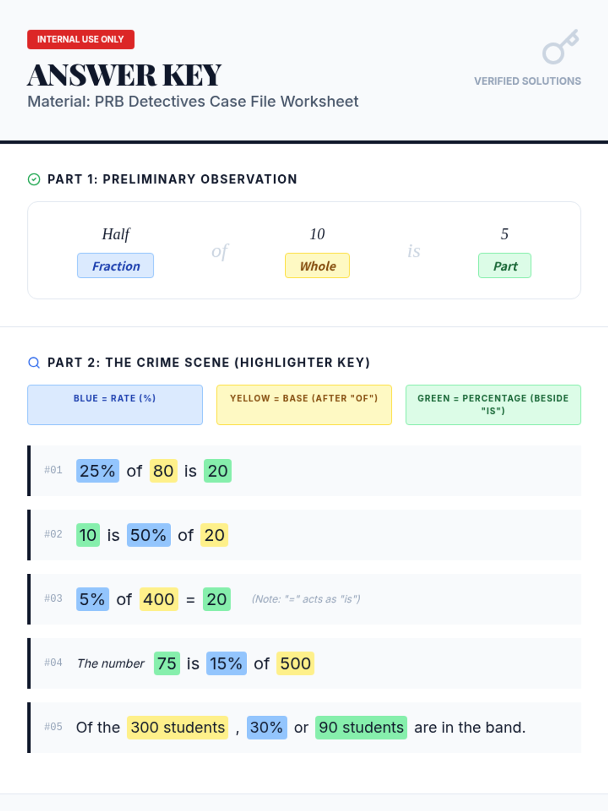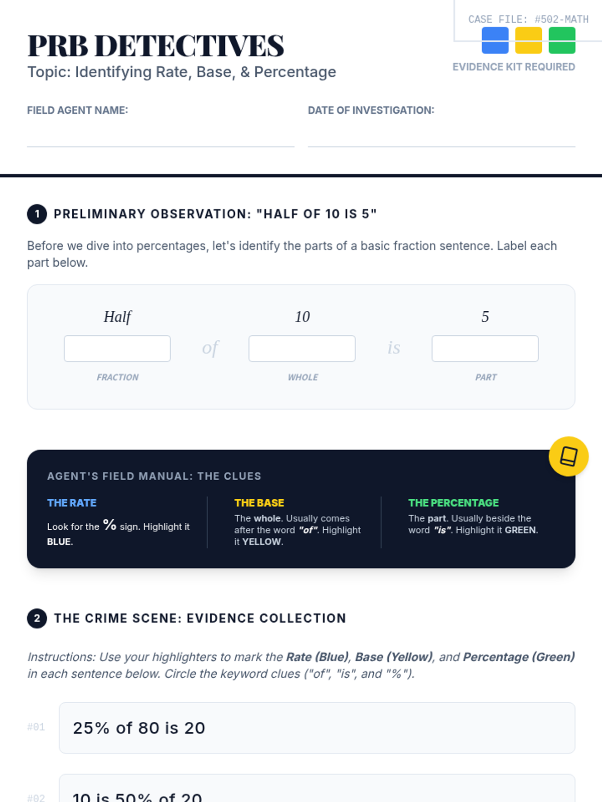 Students will learn to identify Rate, Base, and Percentage using detective-themed clues like the percent symbol, 'of', and 'is'. The lesson includes a video-based discussion, a hands-on color-coding activity, and guided practice.