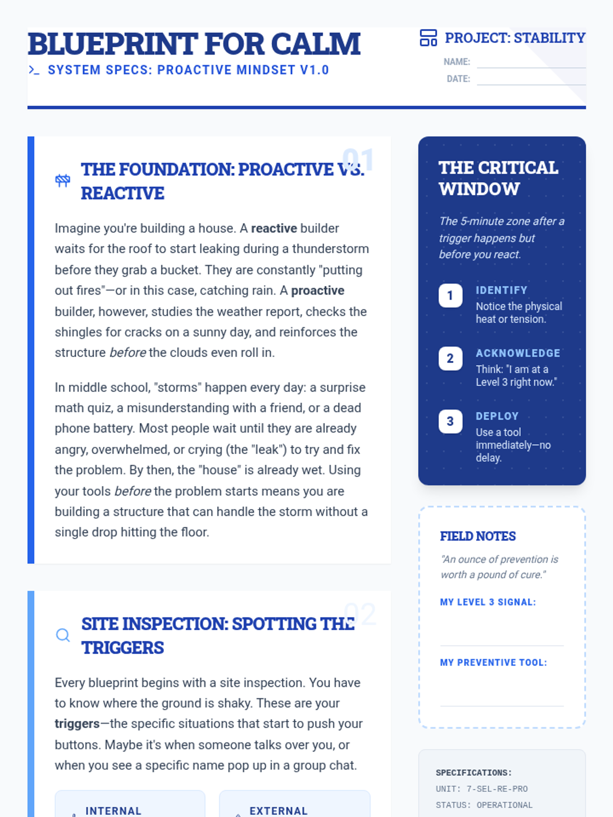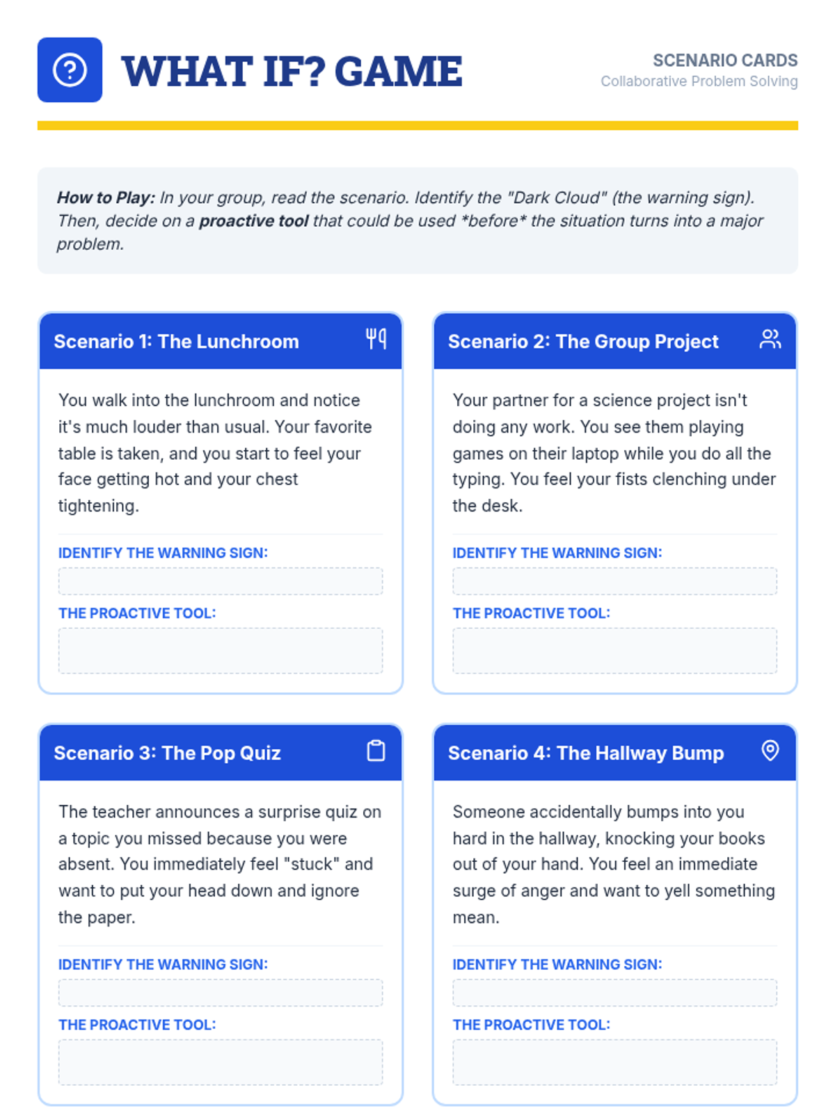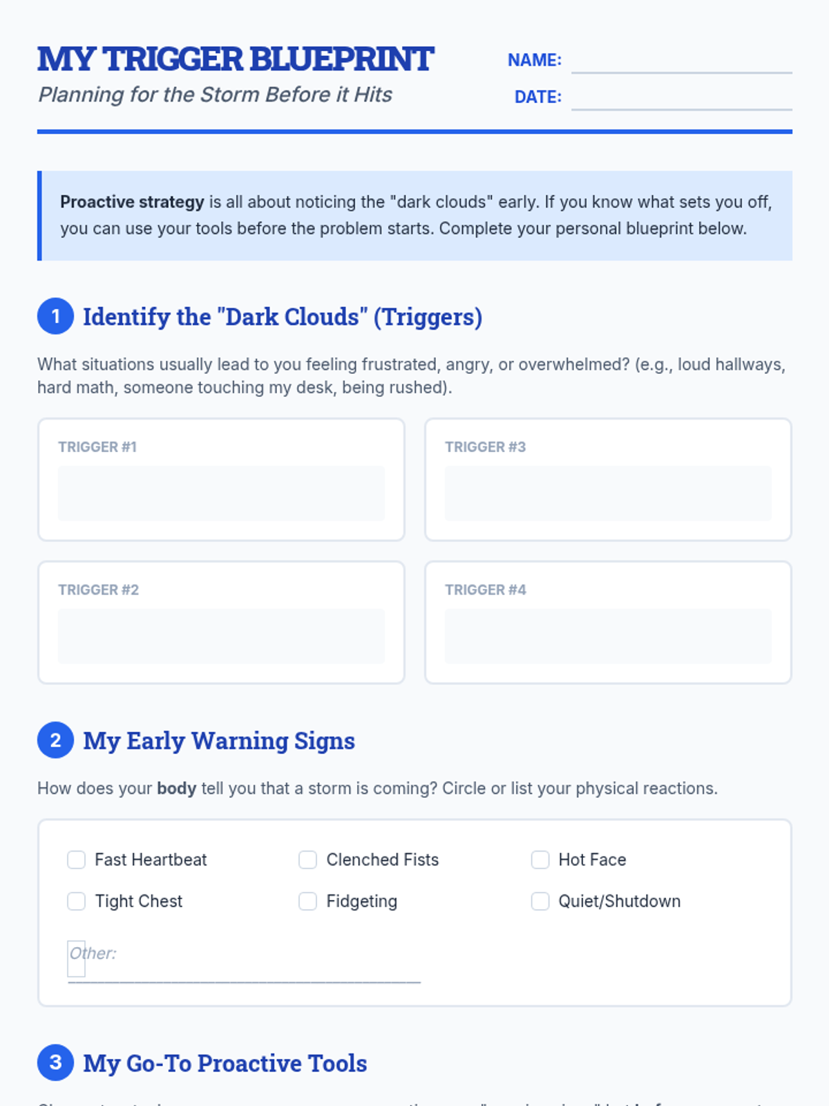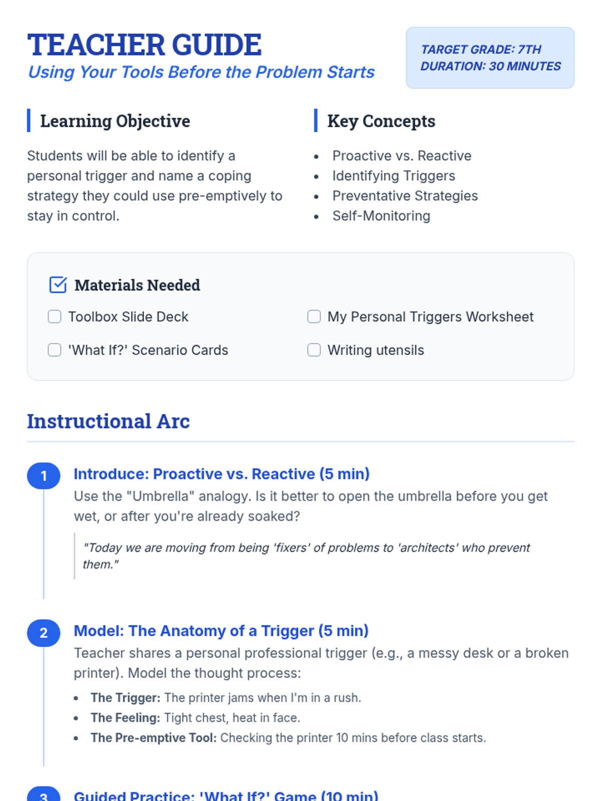 A 30-minute Social-Emotional Learning lesson focused on proactive coping strategies. Students learn to recognize personal triggers and apply "tools" before emotions escalate, shifting from reactive to proactive behavior.