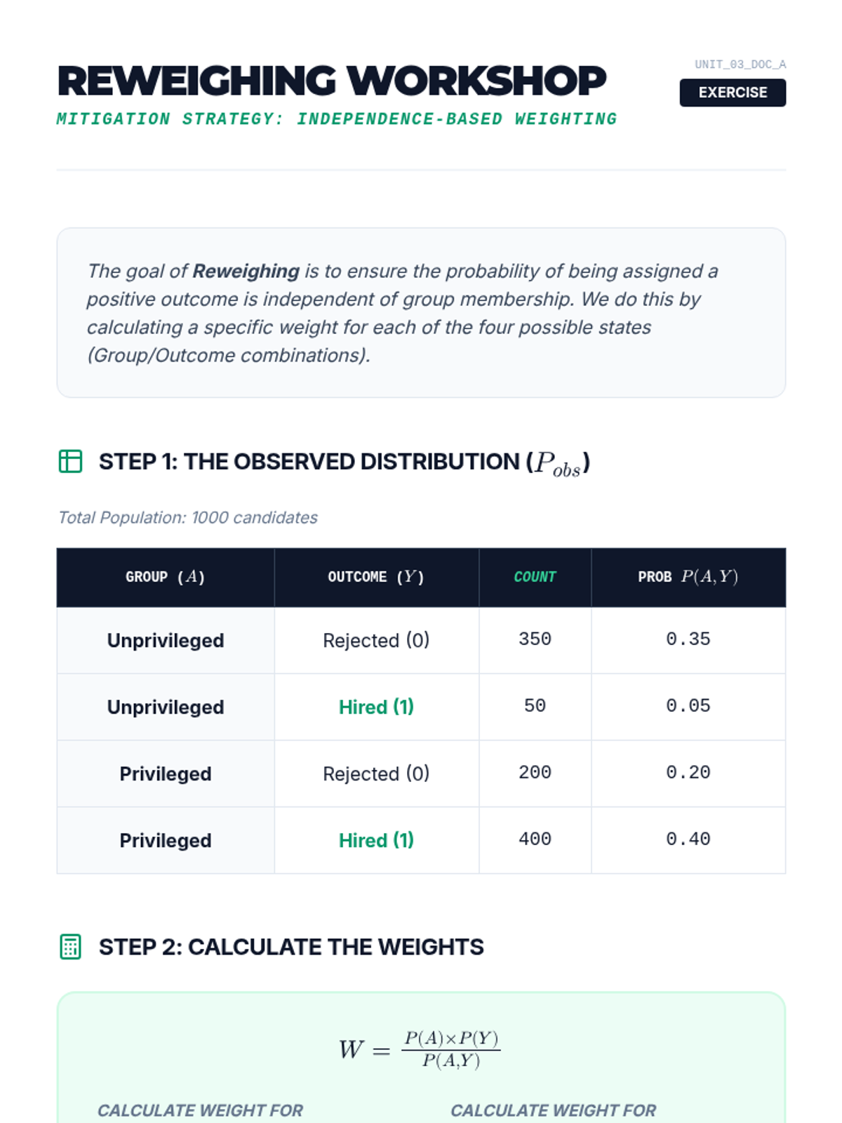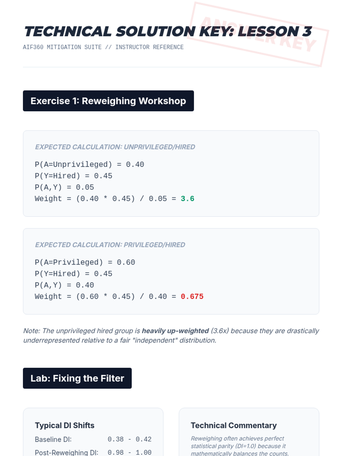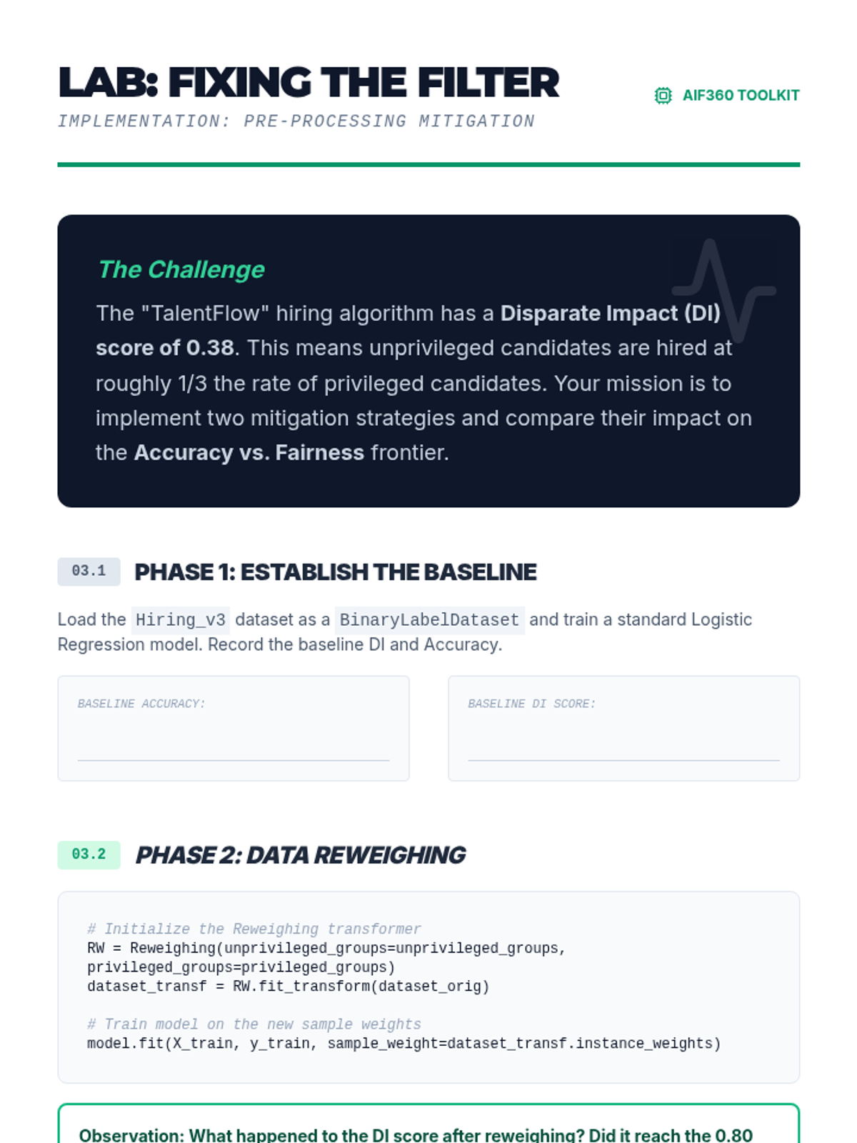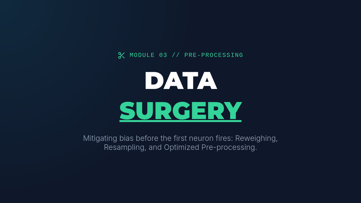 Students learn techniques to modify training data to remove bias, such as re-weighing samples and optimizing for disparate impact. They implement these techniques on a benchmark dataset to observe changes in distribution.