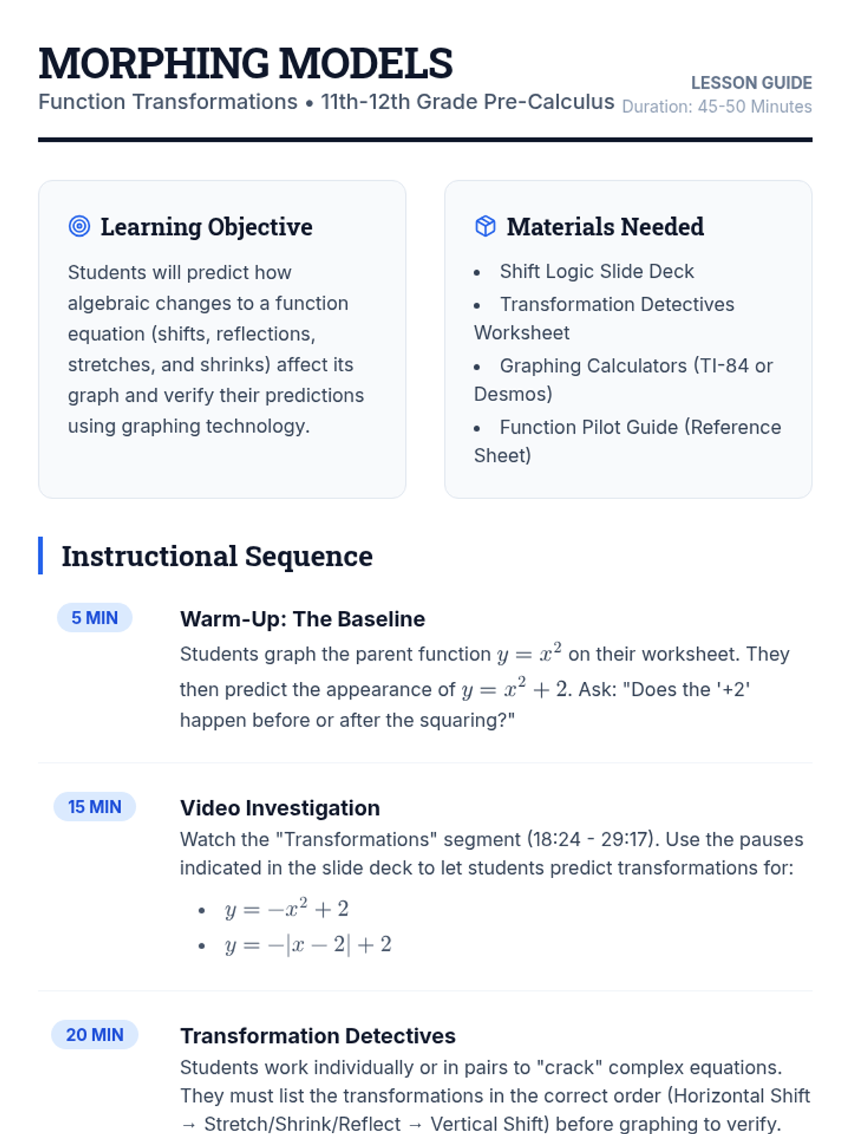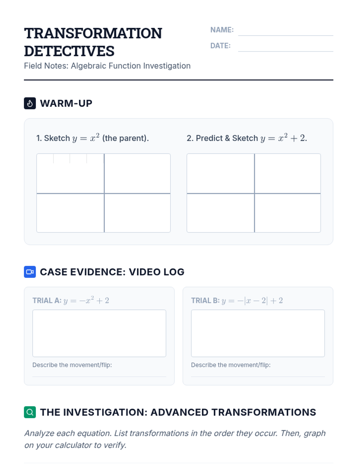 A comprehensive Pre-Calculus lesson on function transformations where students predict and verify how algebraic changes to parent functions affect their graphs through video analysis and a 'detective' activity.