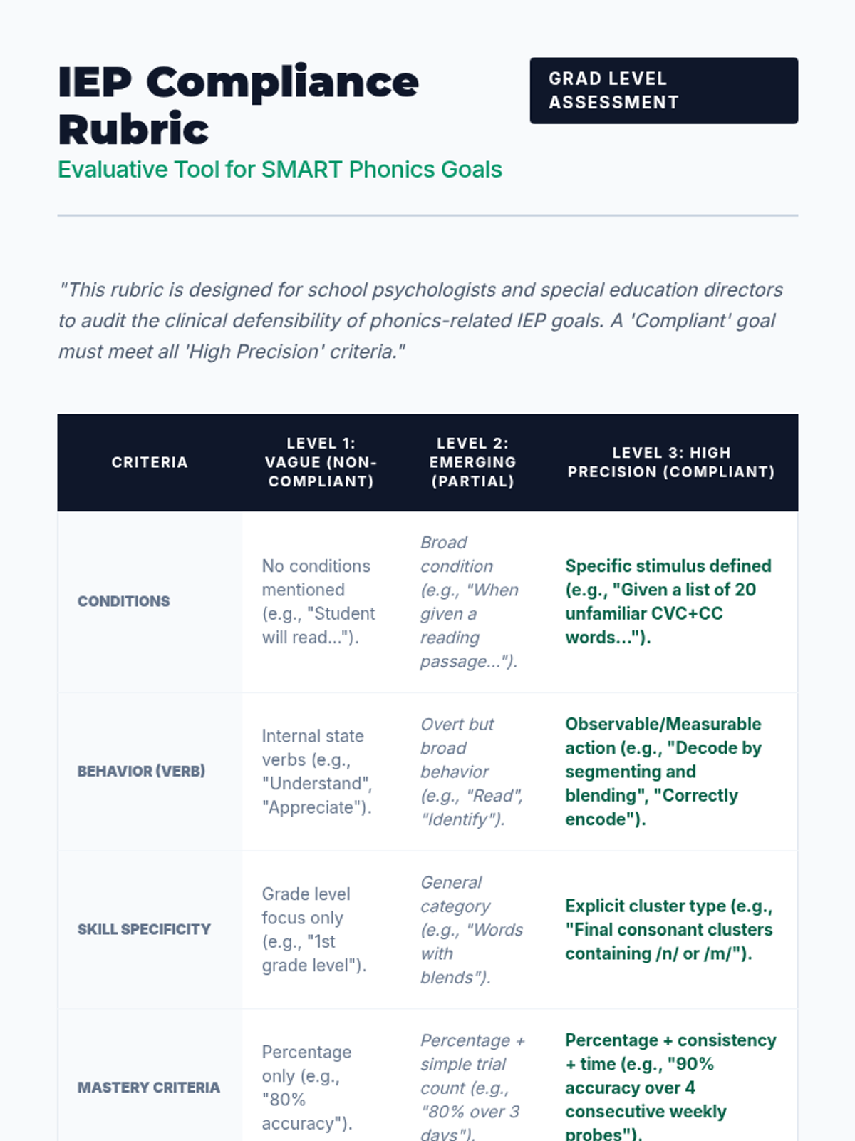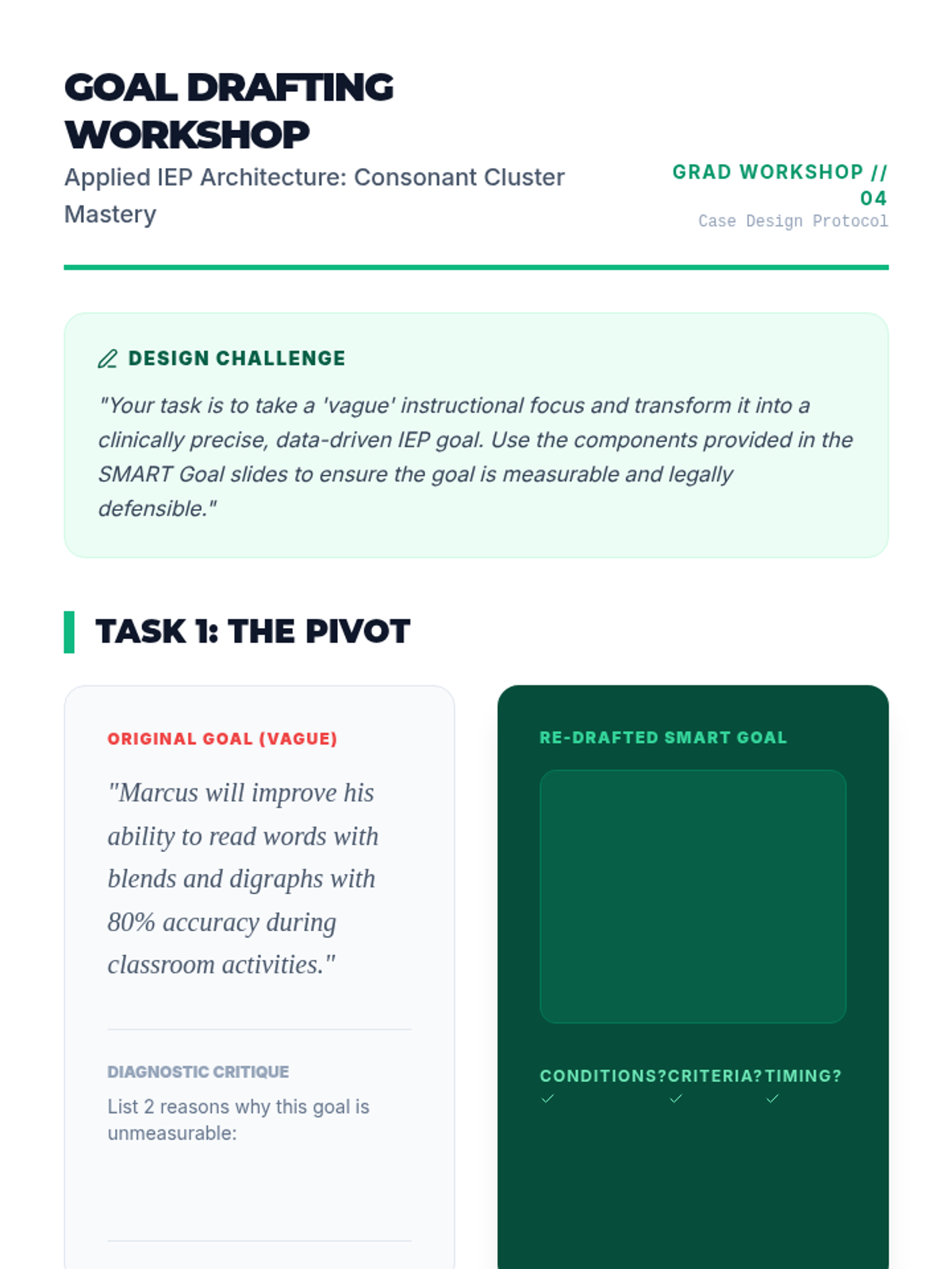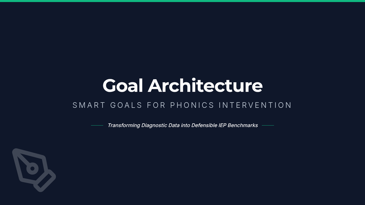 A workshop-style lesson where students practice writing data-driven SMART goals for decoding and encoding trigraphs and blends, focusing on conditions and mastery criteria.