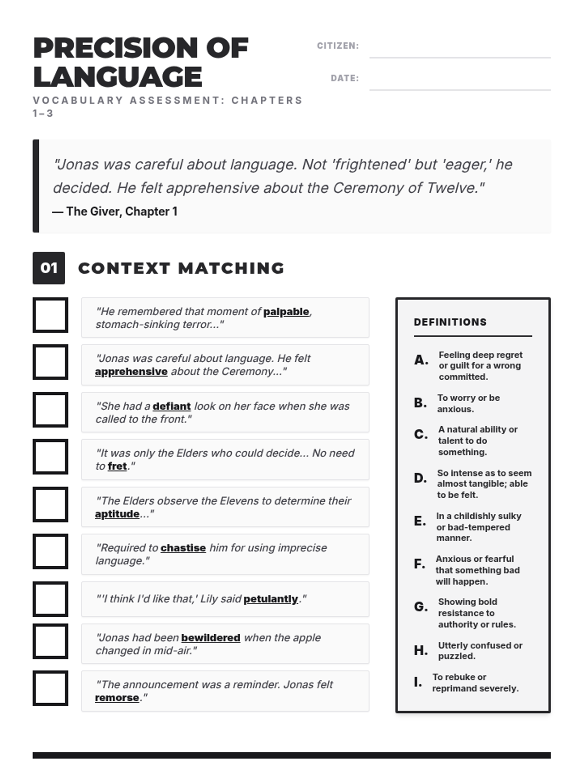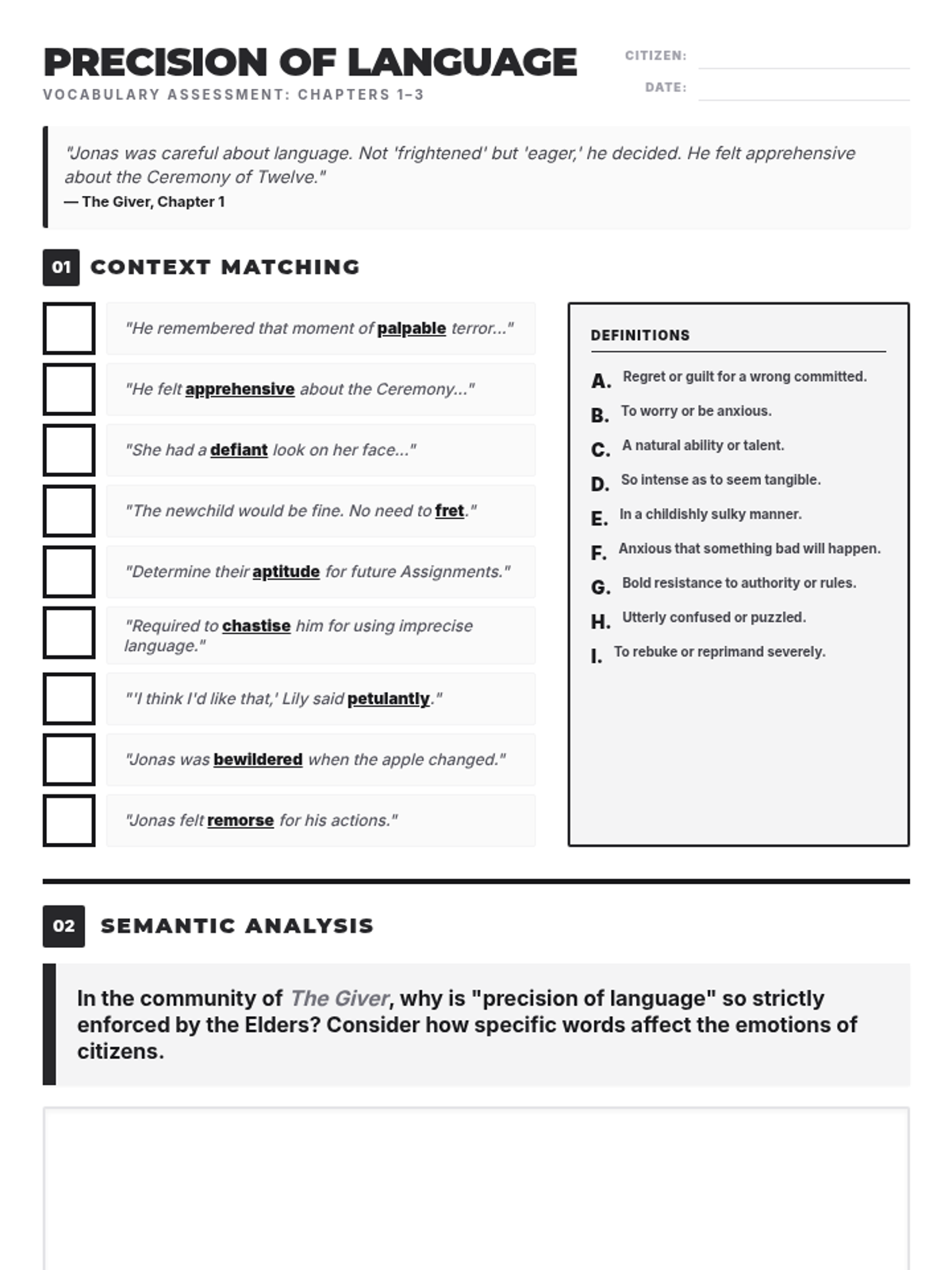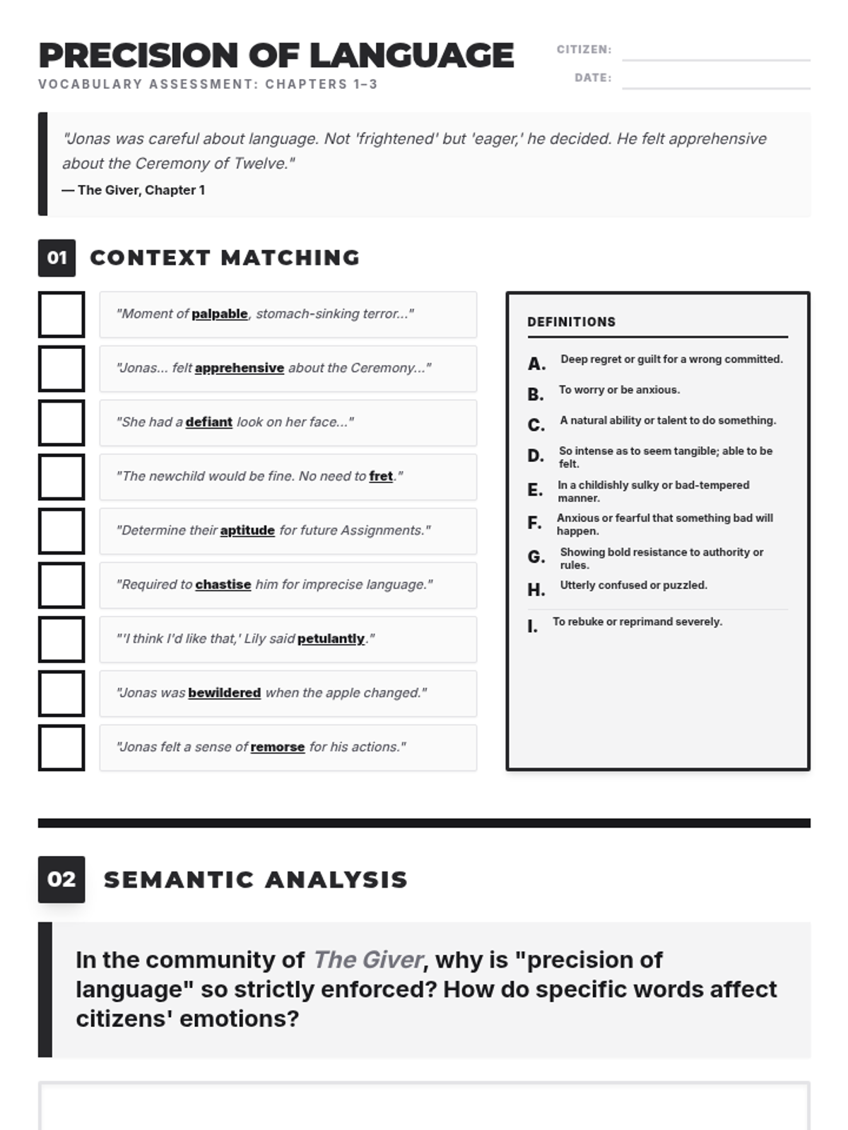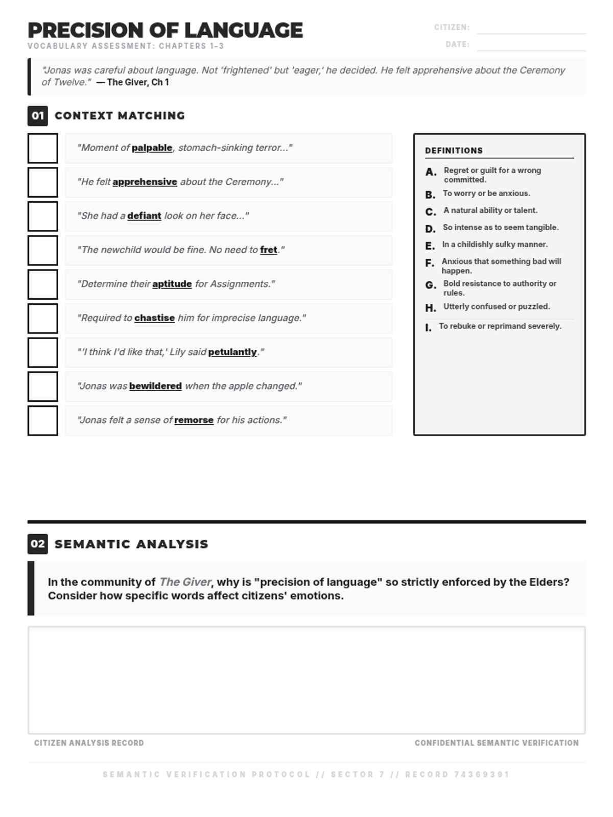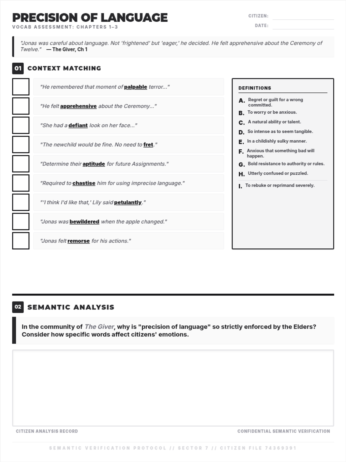 An introductory lesson to Lois Lowry's The Giver, focusing on vocabulary, the concept of "precision of language," and the societal rules of the community.