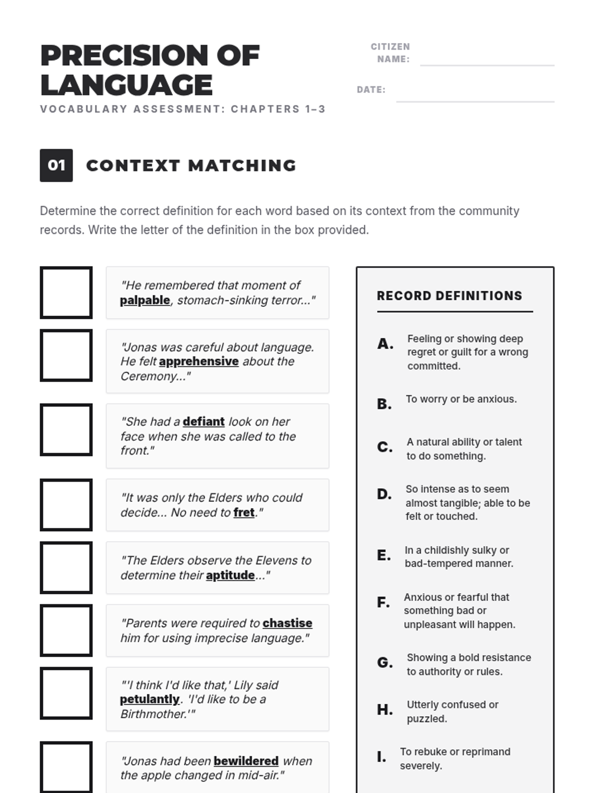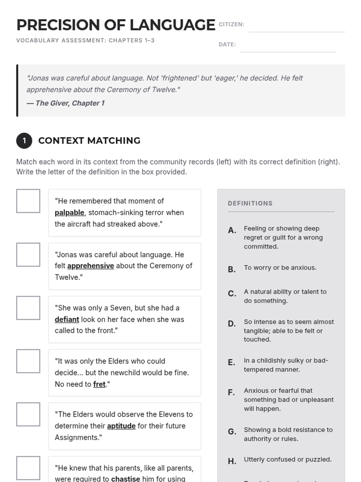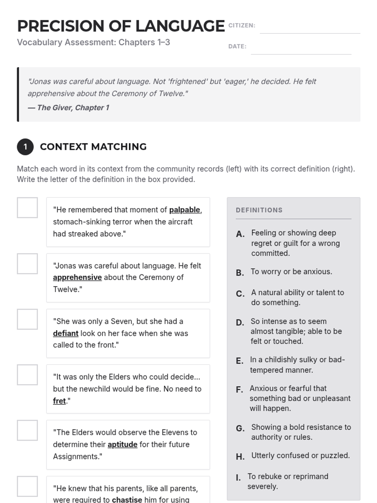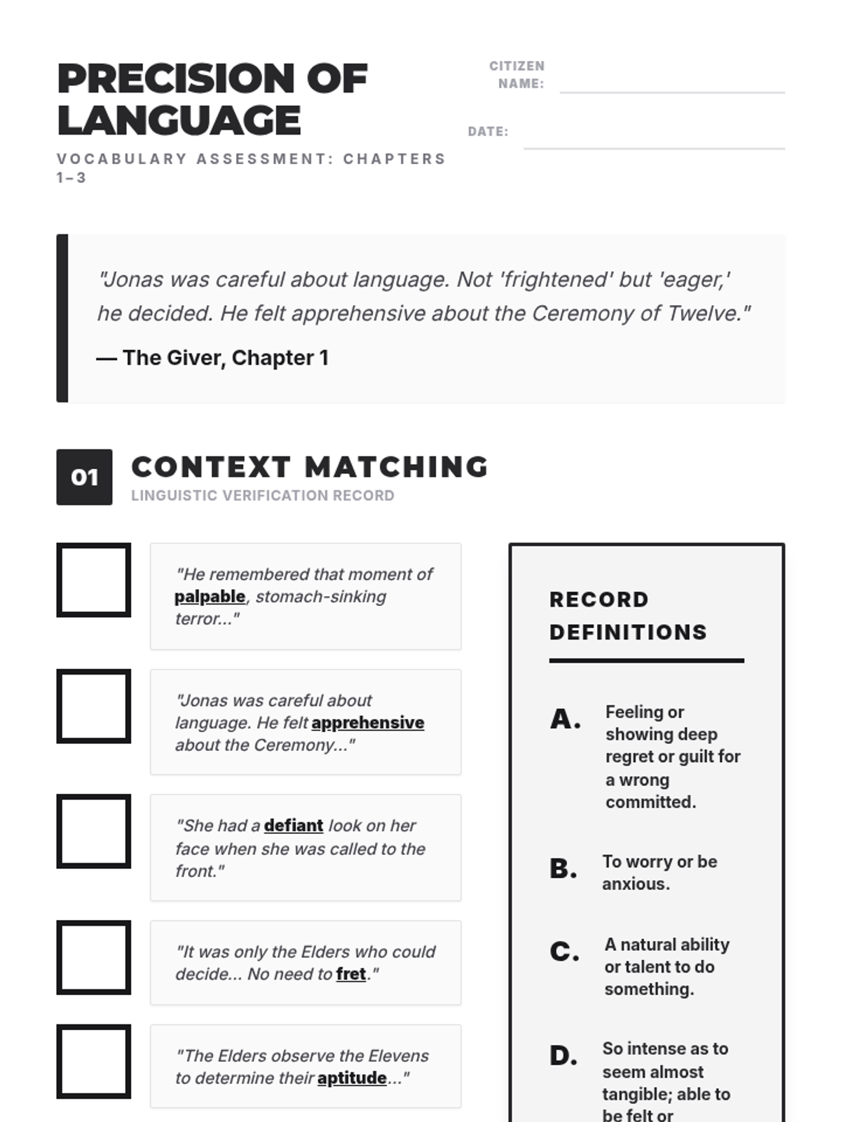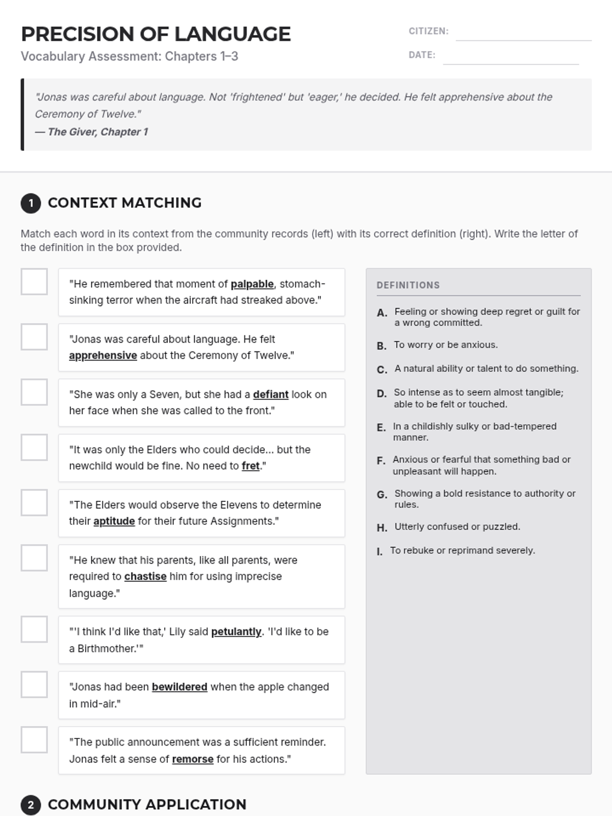 An introductory lesson to Lois Lowry's The Giver, focusing on vocabulary, the concept of "precision of language," and the societal rules of the community.