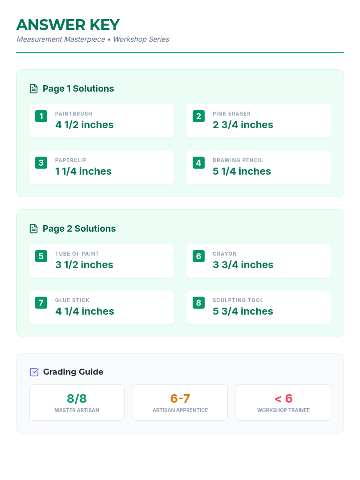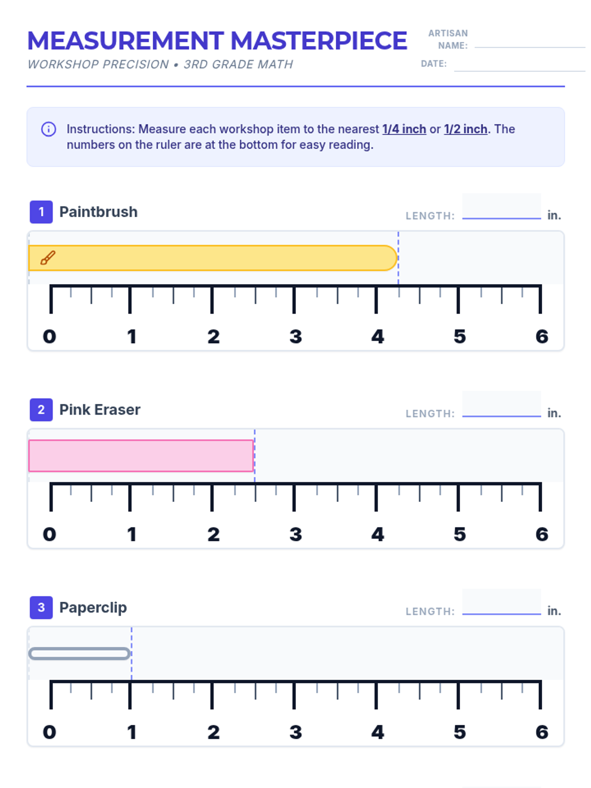 A 3rd-grade math lesson focused on measuring objects to the nearest quarter and half inch using a custom-designed 6-inch ruler with quarter-inch increments. Students will practice precision measurement by analyzing common workshop and art studio items.