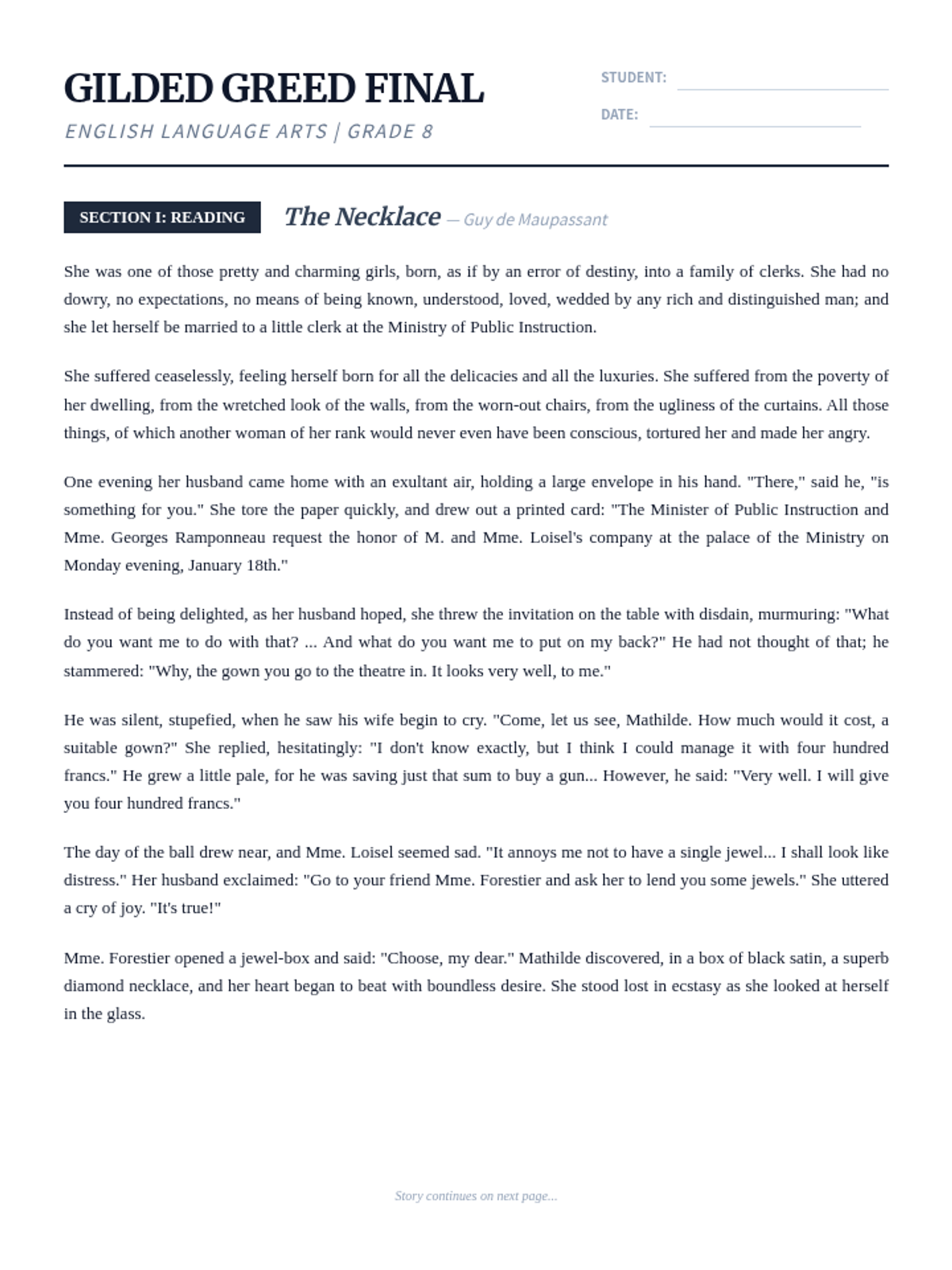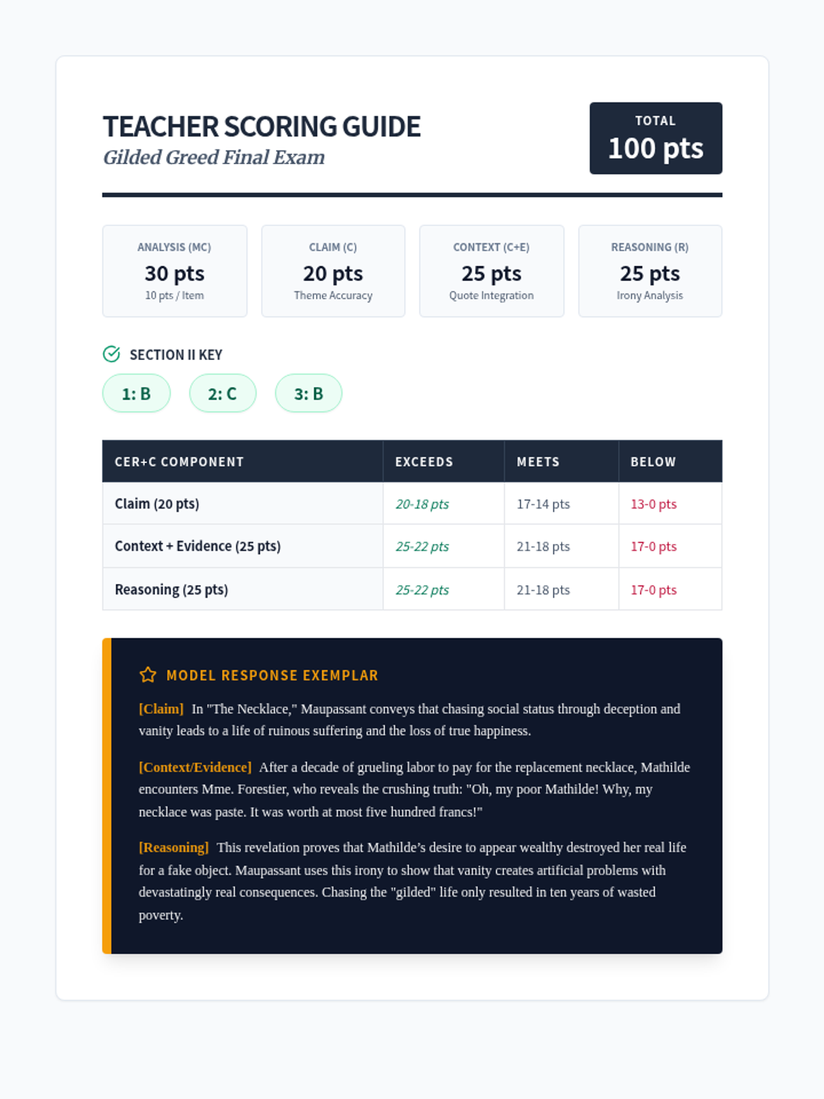 A comprehensive final exam centered on Guy de Maupassant's 'The Necklace,' focusing on theme, moral message, and the CER+C writing framework.
