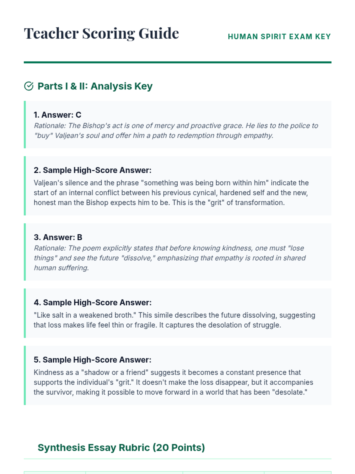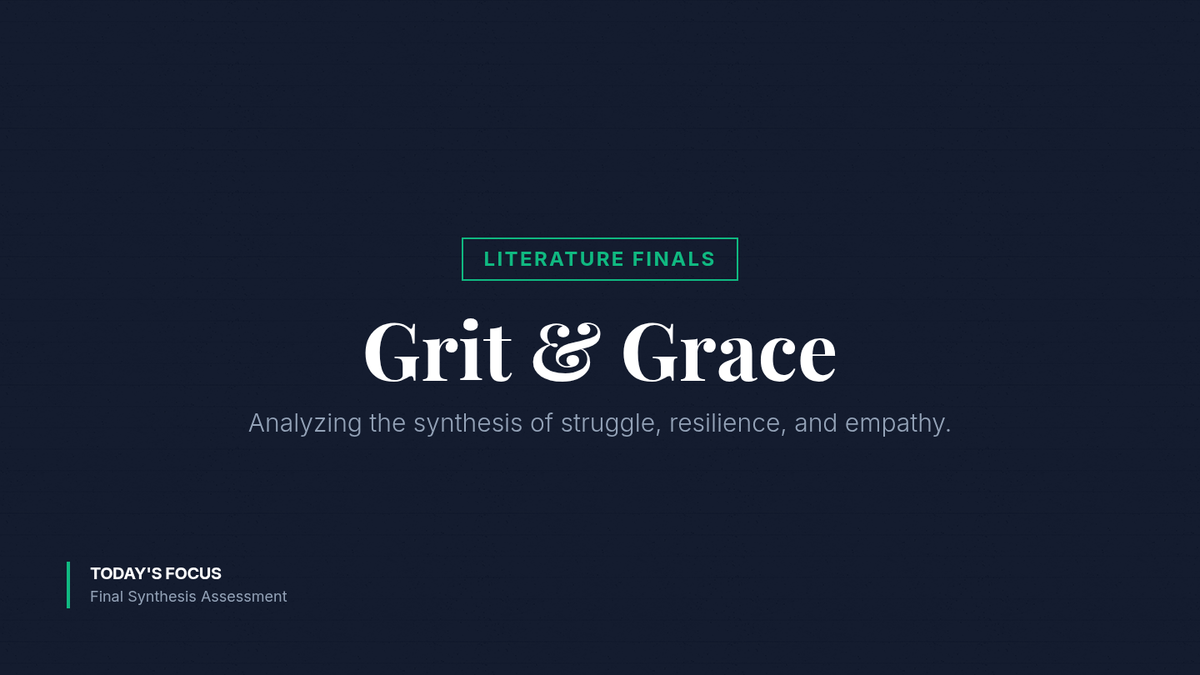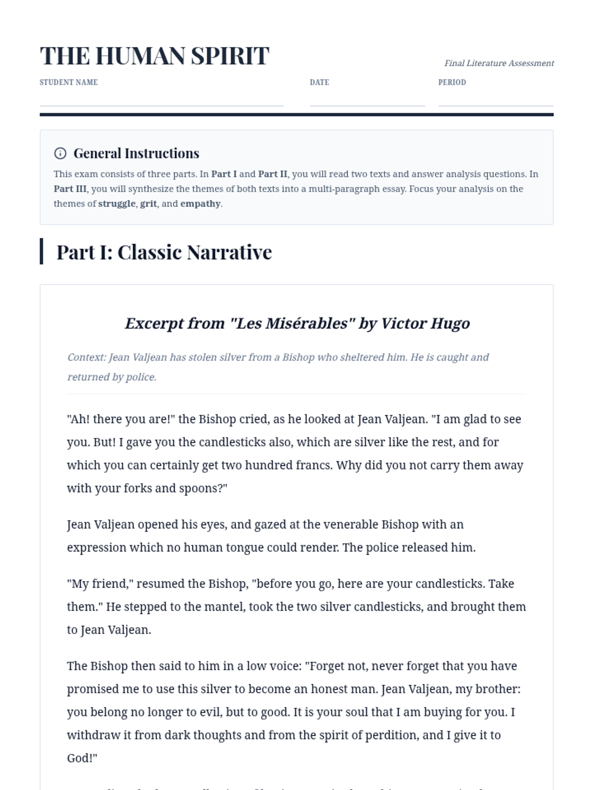A comprehensive final exam focusing on the synthesis of literary themes including struggle, grit, and empathy. Students analyze a narrative passage and a poem before composing a multi-paragraph synthesis essay.