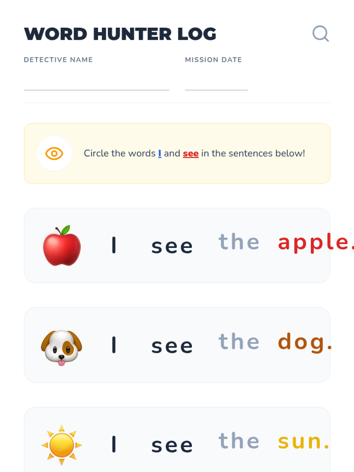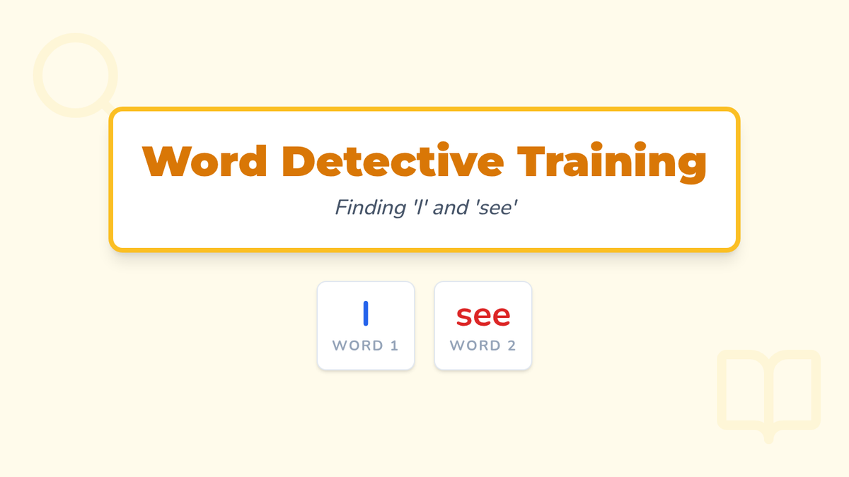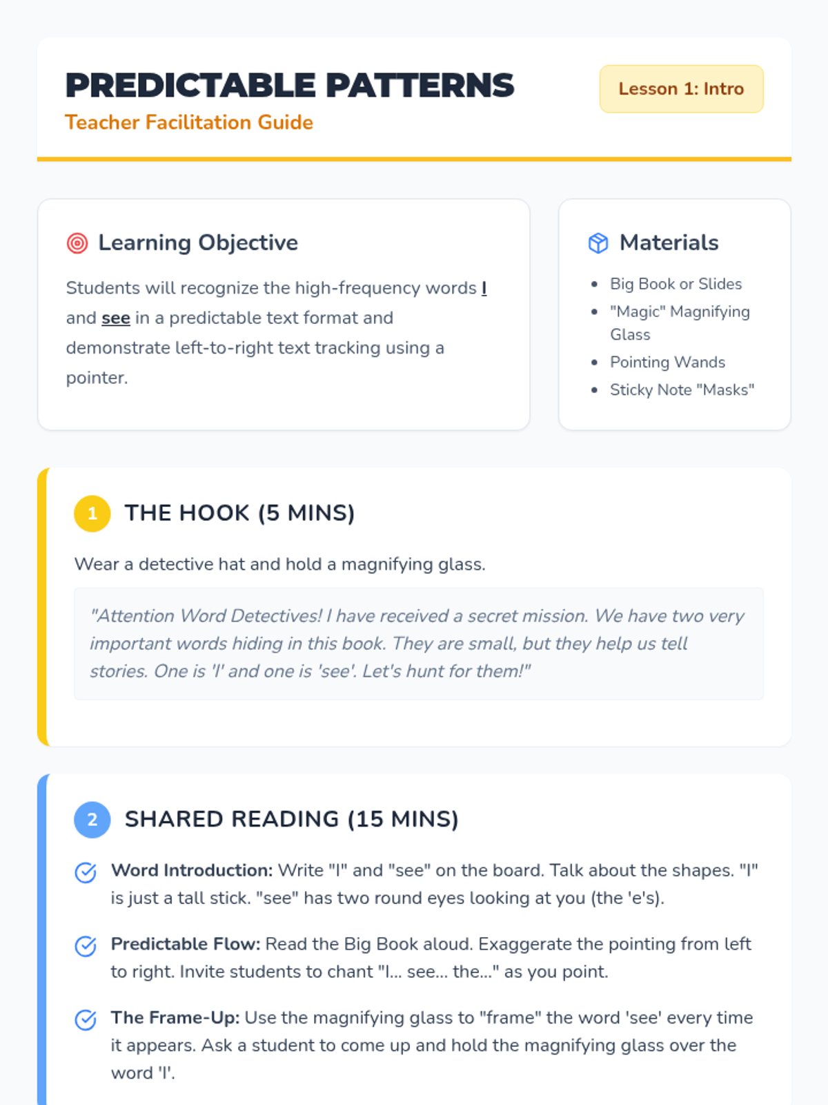 Students are introduced to the words 'I' and 'see' using a predictable big book format and a 'magic magnifying glass' to hunt for hidden words.